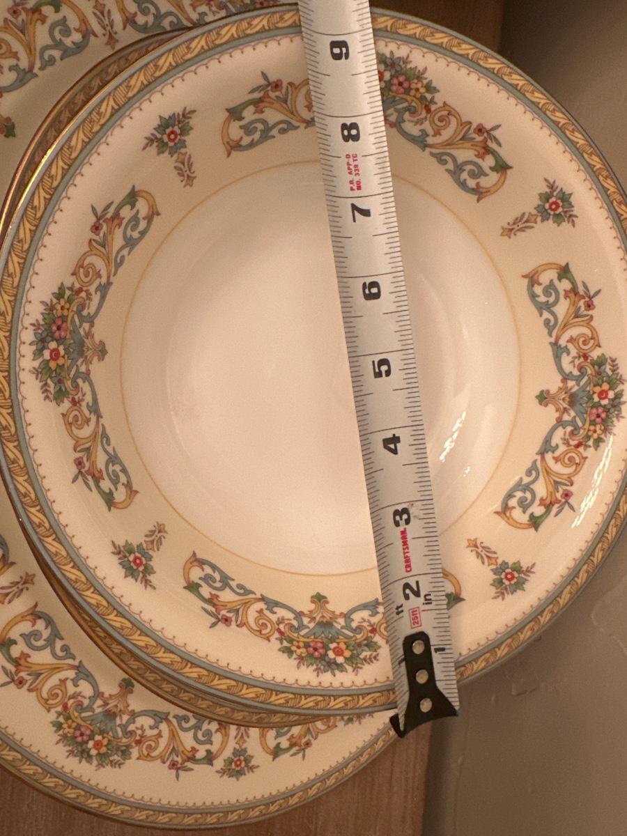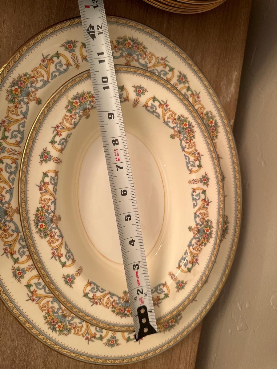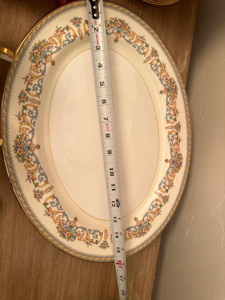 Aynsley by Henley Fine China Made in England. 44 pieces. 15 plates, 10 salad plates, 8 mugs and saucers, 8 bread and butter plates, 16 in platter, 9 1/2 in round bowl, 10 1/2 in oval bowl.