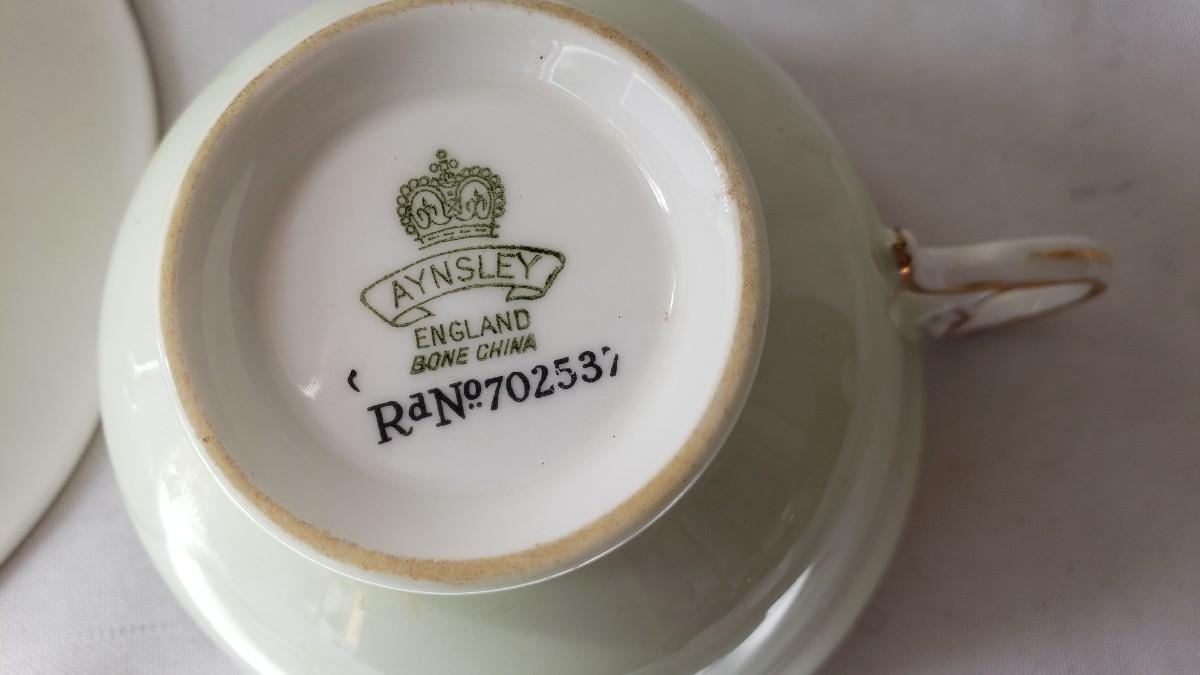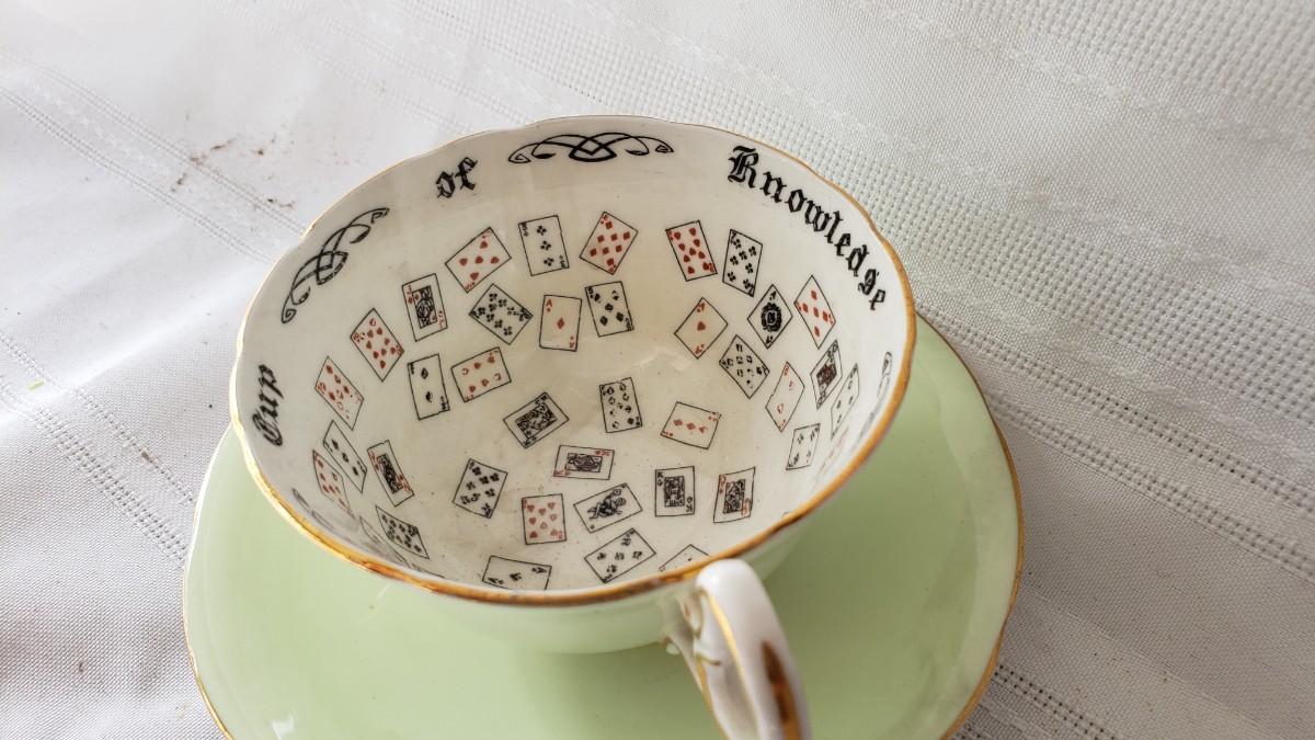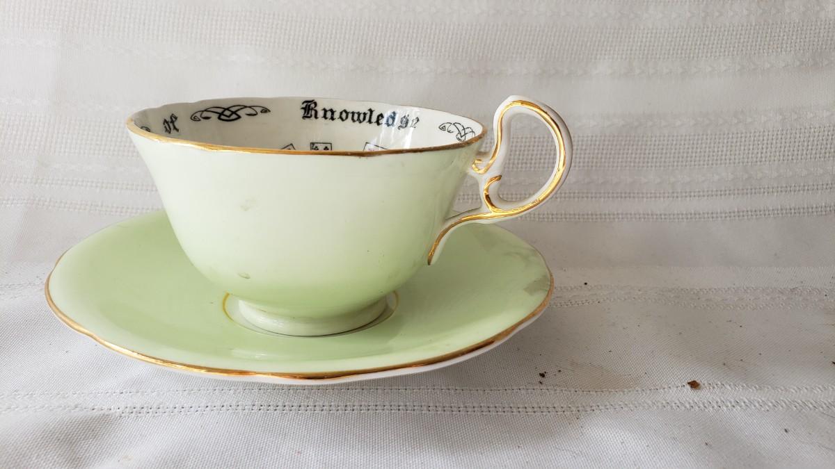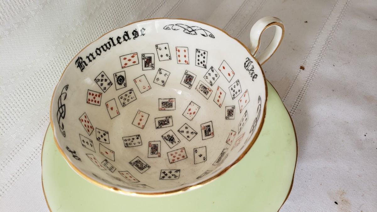 Aynsley tea cup of knowledge with playing cards, and saucer