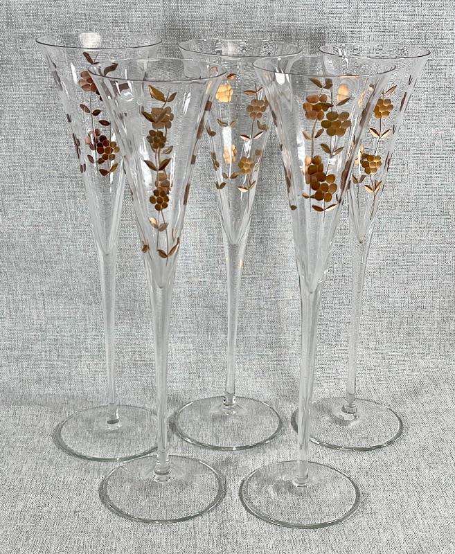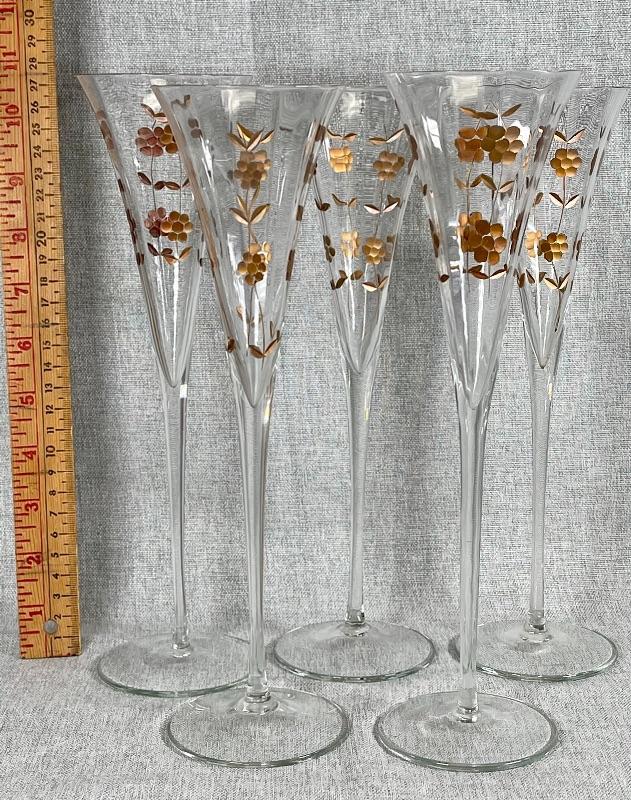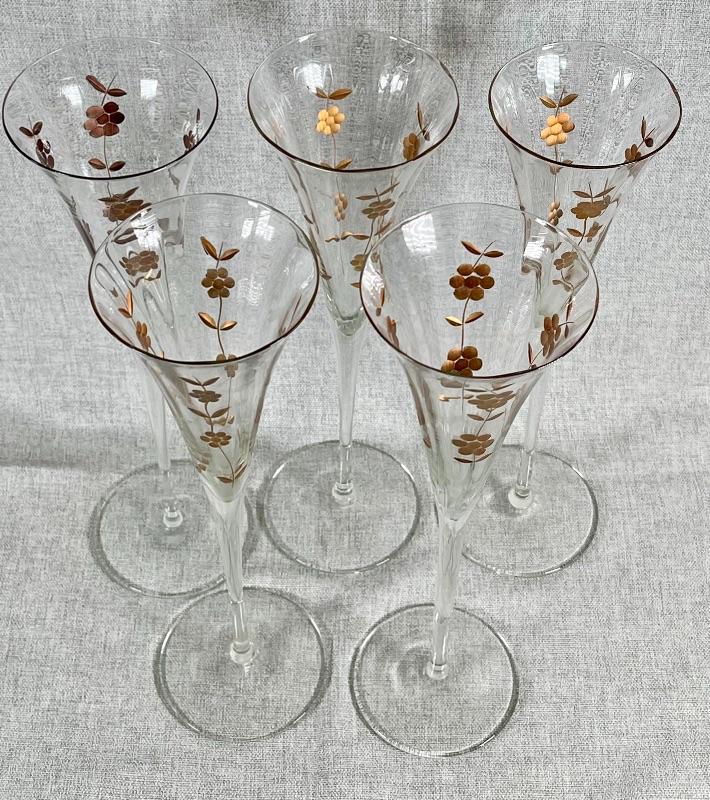 Vintage Crystal Champagne Flutes Stemware glass set of 5, Bohemian style hand-painted gold flowers