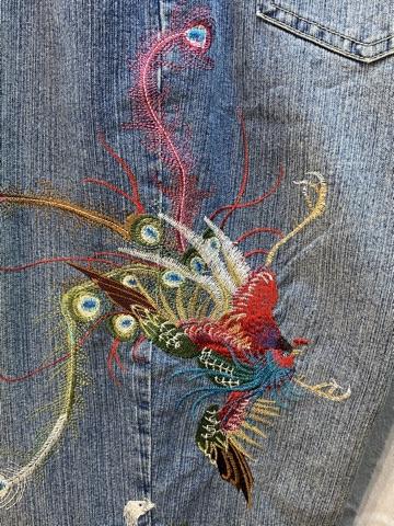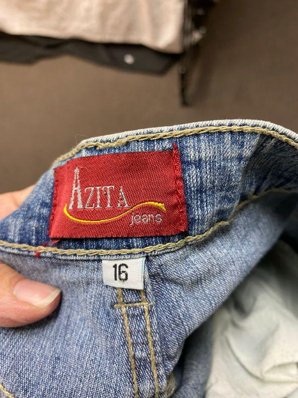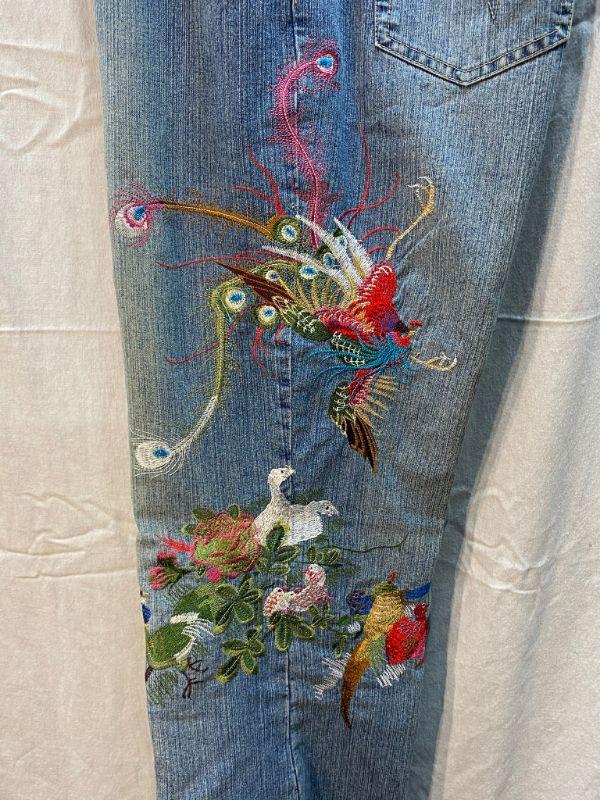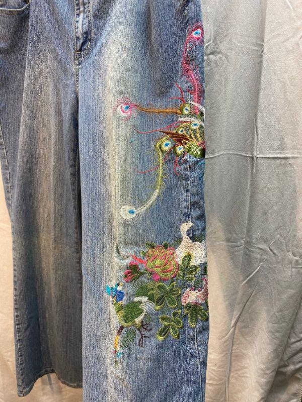 Azita Jeans light blue rinse denim. Embroidered down the outer side of left leg. Embroidery is of colorful birds. Look like a straight leg cut. Size 16. Good condition.