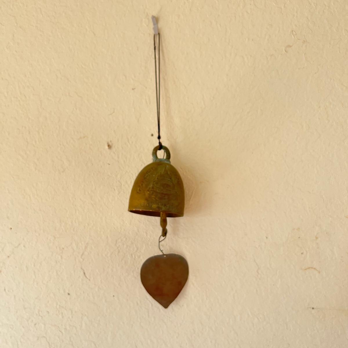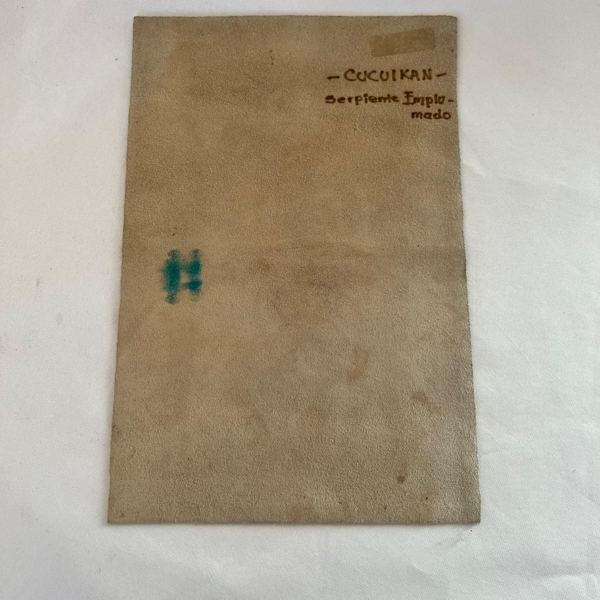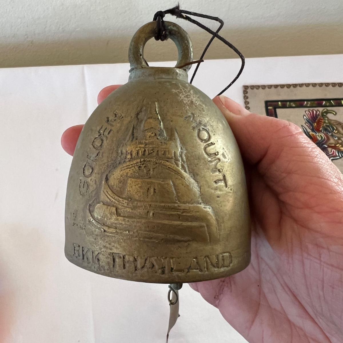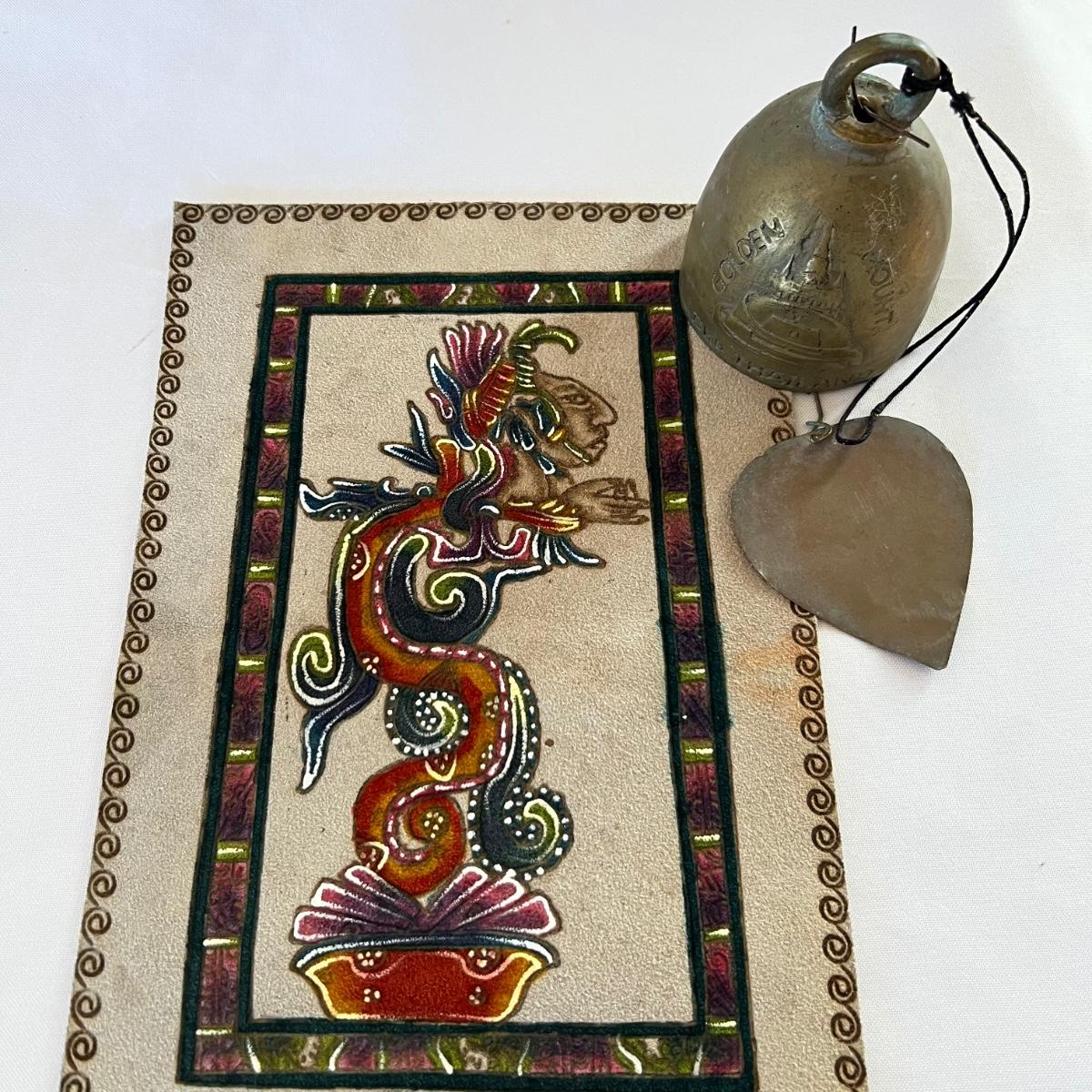 This small brass bell has the words Golden Mount, B.K.K Thailand front and back and has a heart shaped embellishment; measures 3” D x 4” H. We have paired it with some suede art that is titled Cucuikan - Serpiente Enplumado. It measures 7” x 11”. Note it has 2 stains.