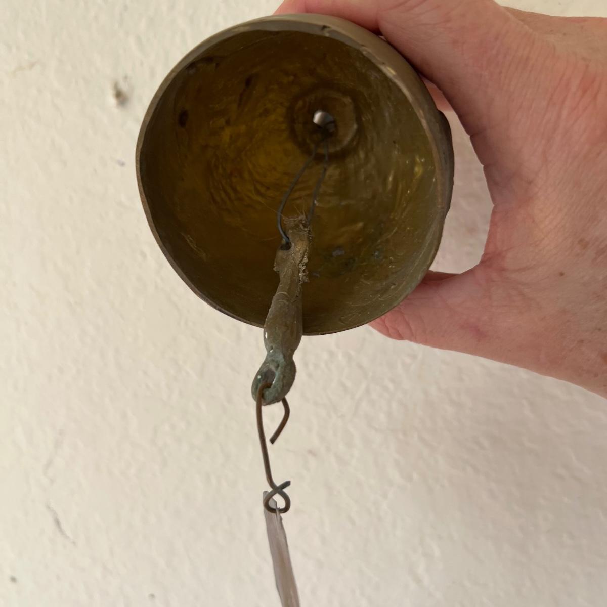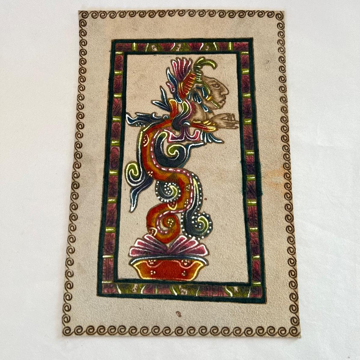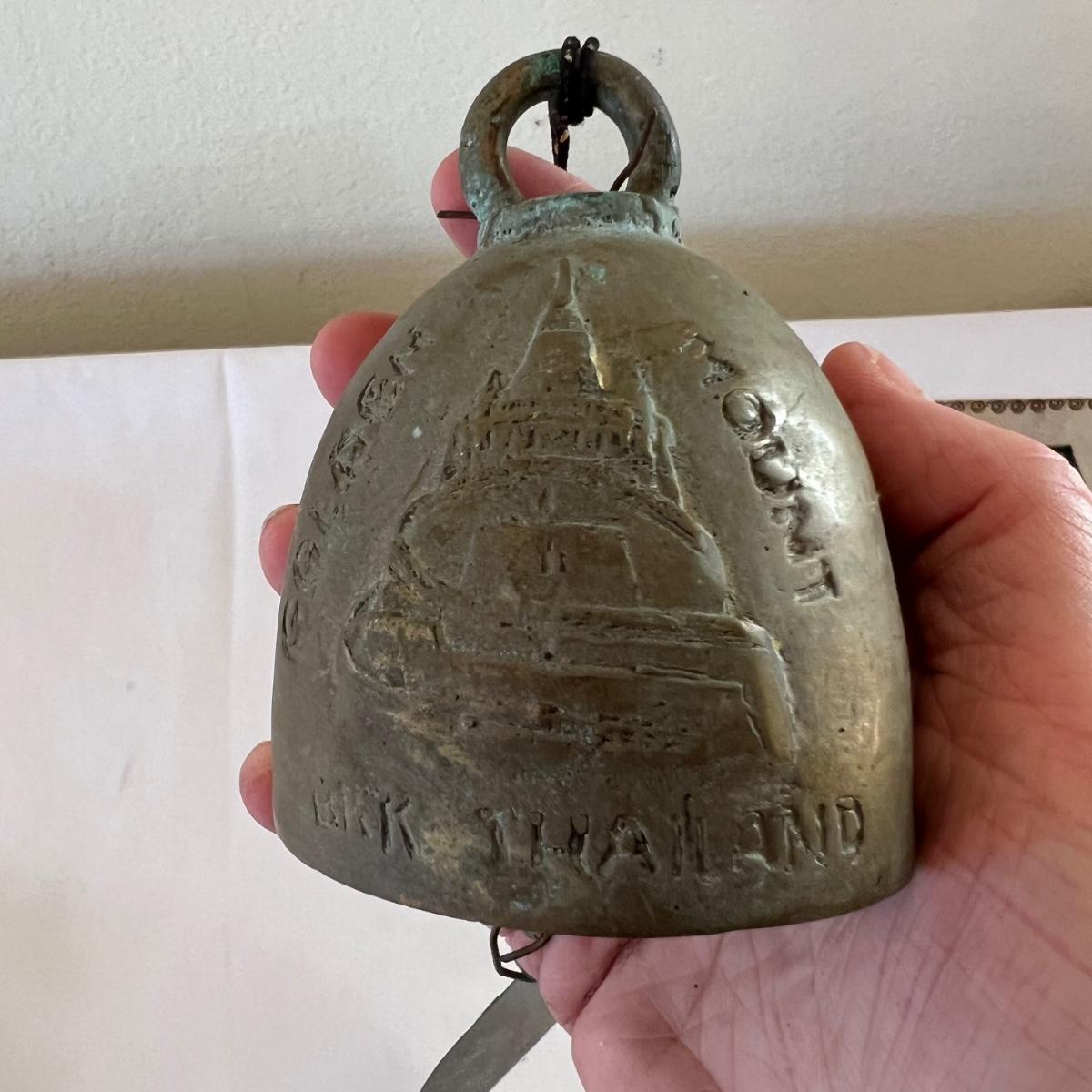 This small brass bell has the words Golden Mount, B.K.K Thailand front and back and has a heart shaped embellishment; measures 3” D x 4” H. We have paired it with some suede art that is titled Cucuikan - Serpiente Enplumado. It measures 7” x 11”. Note it has 2 stains.