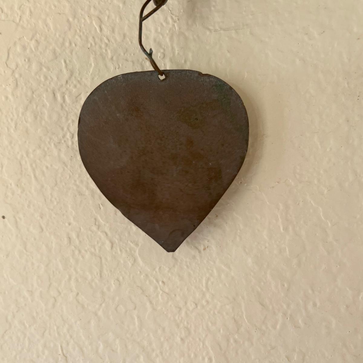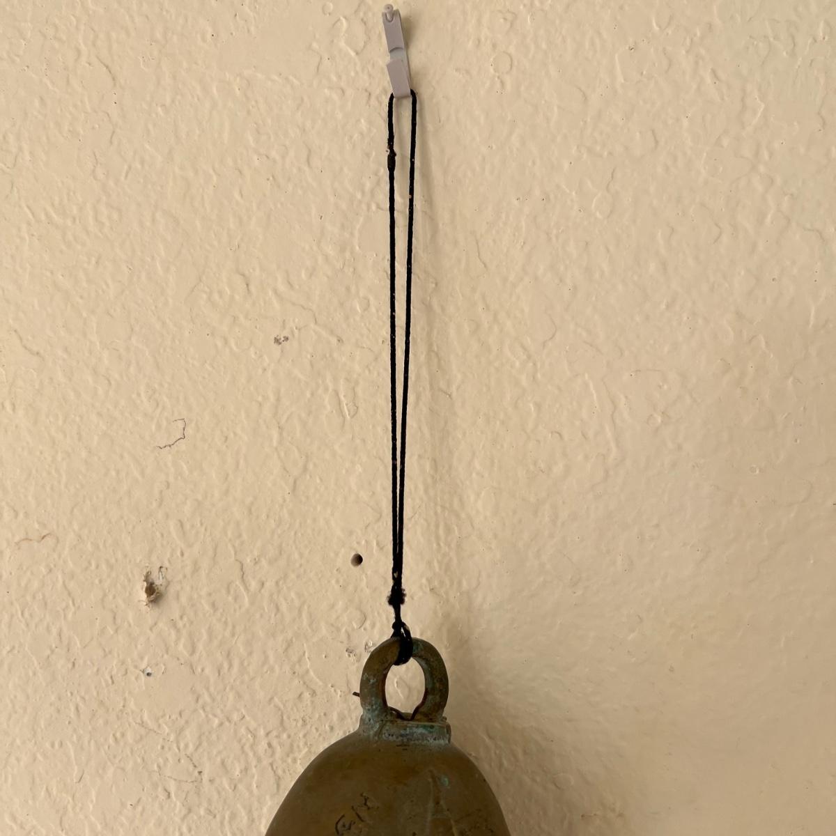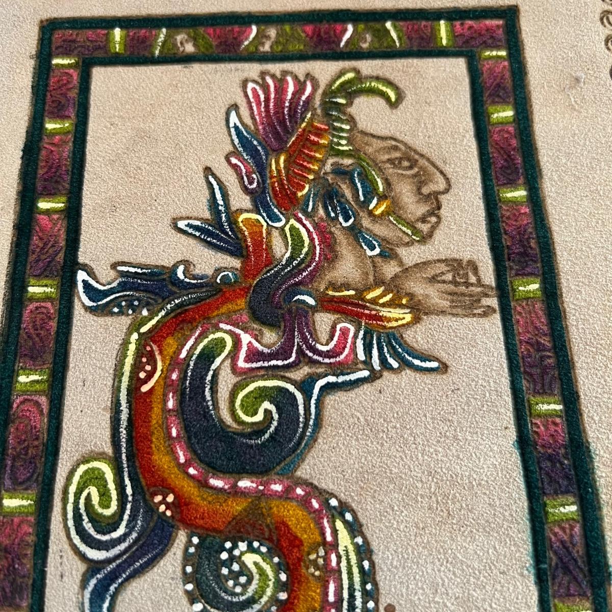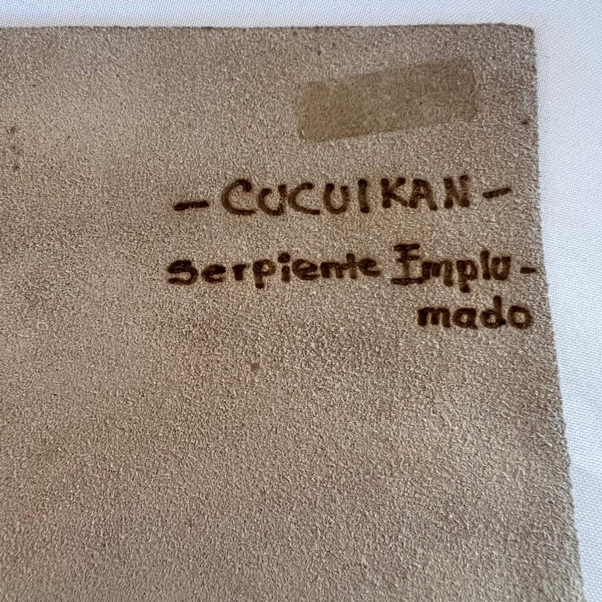 This small brass bell has the words Golden Mount, B.K.K Thailand front and back and has a heart shaped embellishment; measures 3” D x 4” H. We have paired it with some suede art that is titled Cucuikan - Serpiente Enplumado. It measures 7” x 11”. Note it has 2 stains.