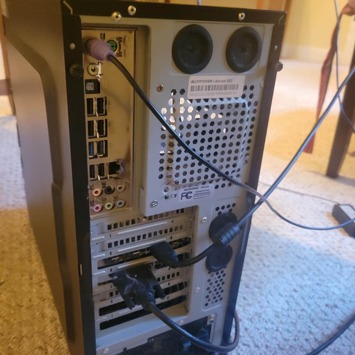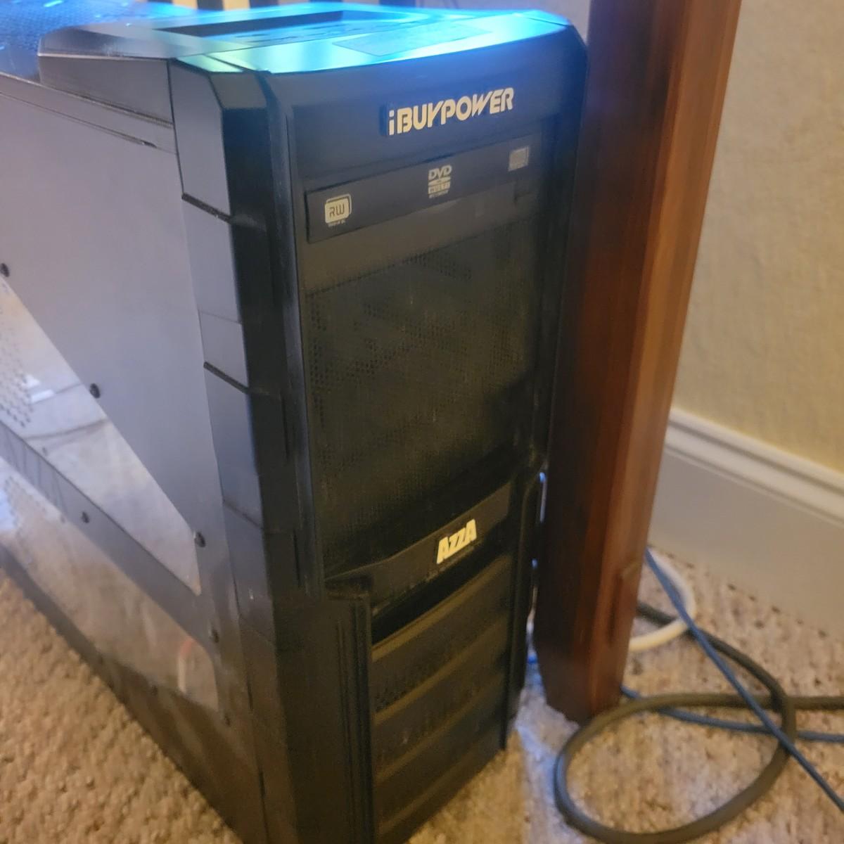 An Azza CPU with an EVGA 650 G3 power supply and a EGVA Geoforce GTX 1060 video card. The CPU has had its hard drive removed and powered on when plugged in. It measures approximately 7.5" x 19" x 18"H. Also included is a 24" LG monitor and two keyboards. Note one keyboard shows some wear, see image.