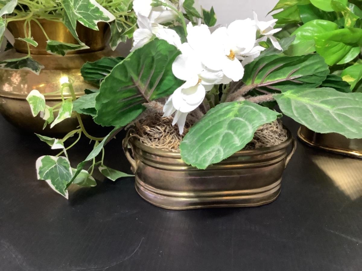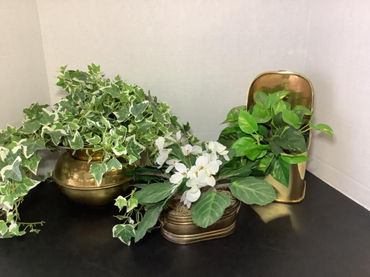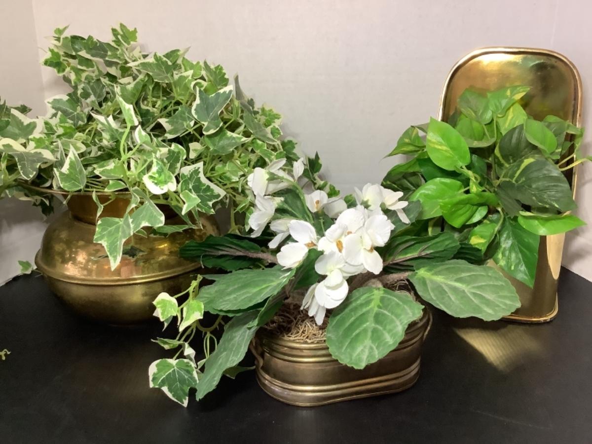 B - 105. Three Brass Decorative Containers with Faux Plants