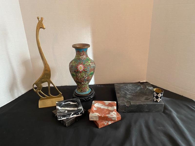 Lot of Marble & Cloisonné Vase with Brass Giraffe