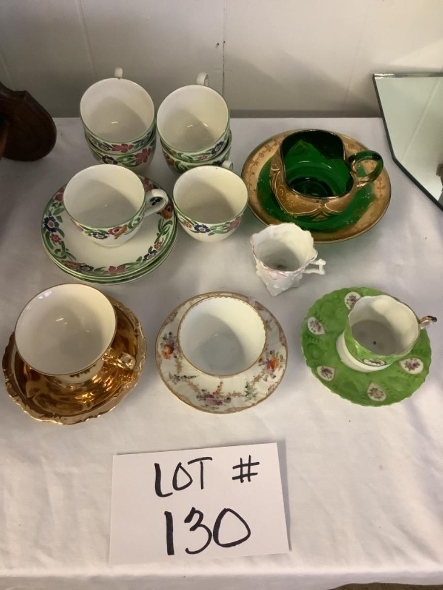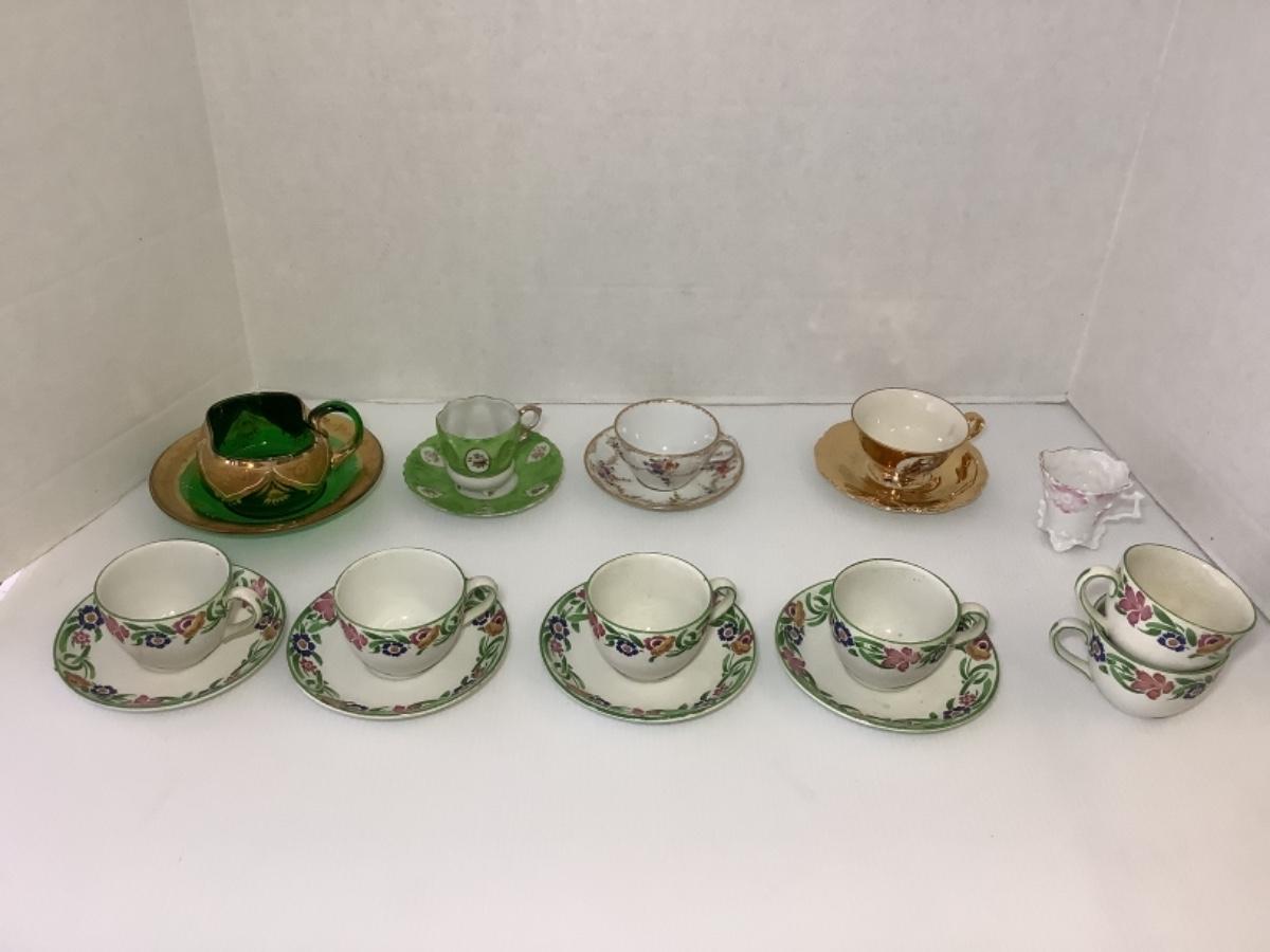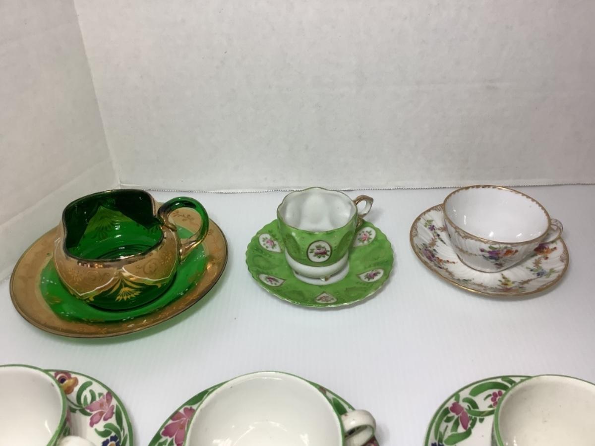 1 ) Vintage Occupied Japan Green, Footed Cup & Saucer, Roses with gold trim