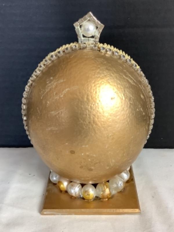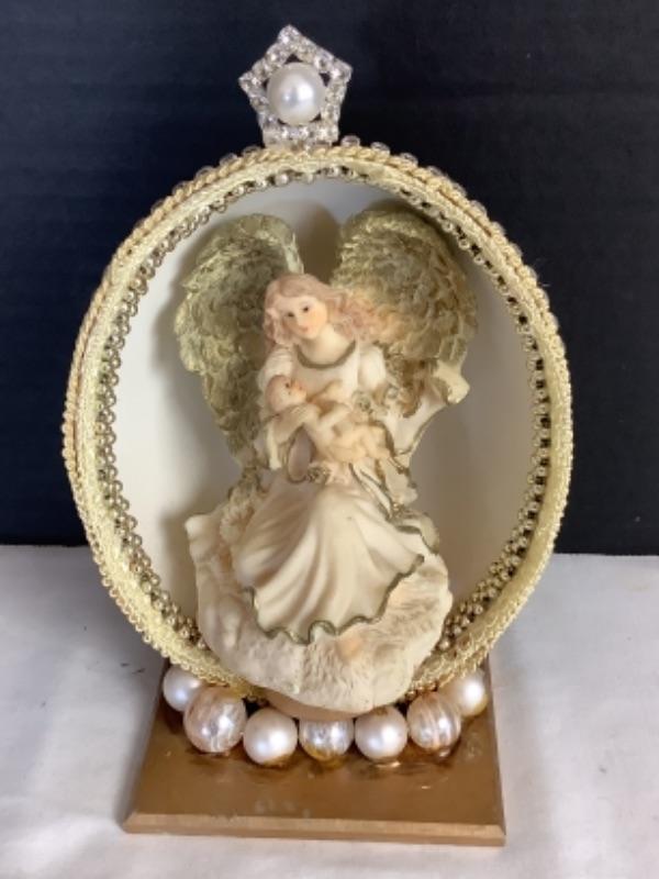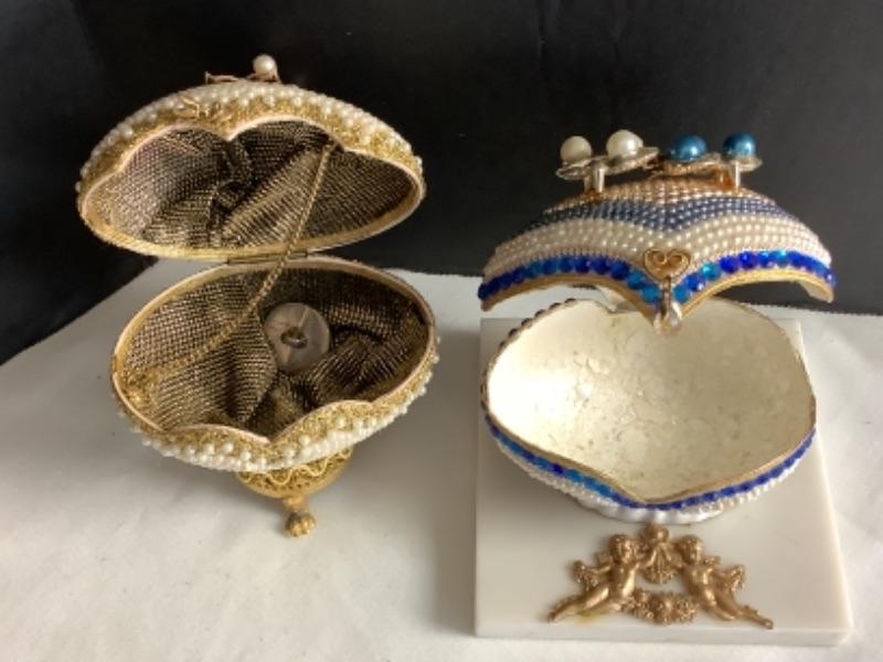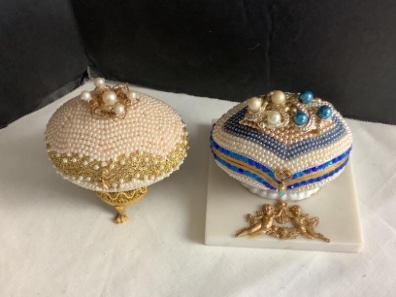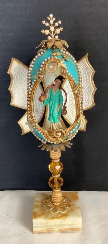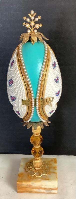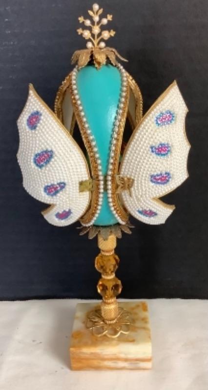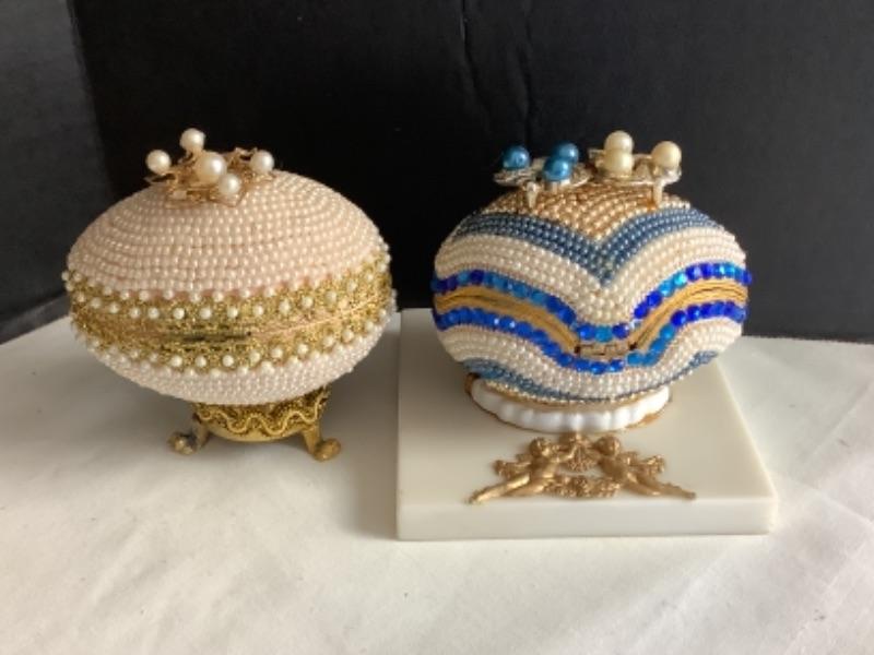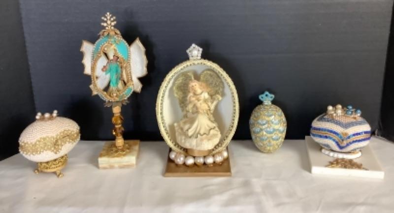 Cloisonné egg measures approximately 4-1/2”, 2 handmade beaded egg boxes, Handmade half egg with angel incenter measures 8-1/2” tall and Beaded egg with butterflies and Asian lady with marble base measures 10” tall