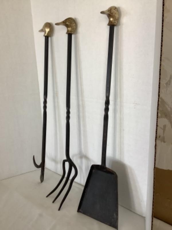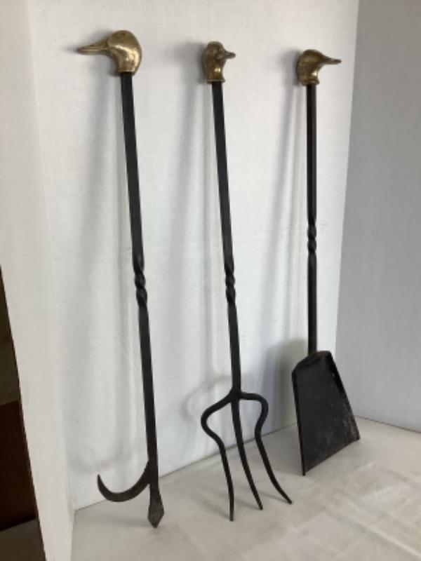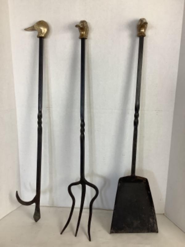 Three piece set of wrought iron fireplace equipment with brass duck head handless, pieces measure approximately 30” high