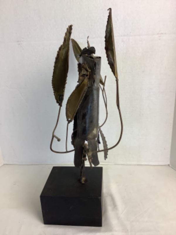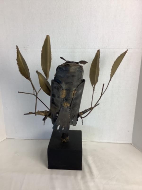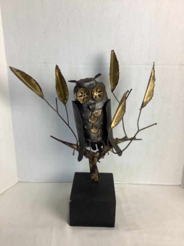 Mid century metal owl sculpture measures approximately 19” tall and 16” wide