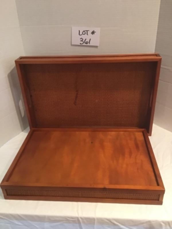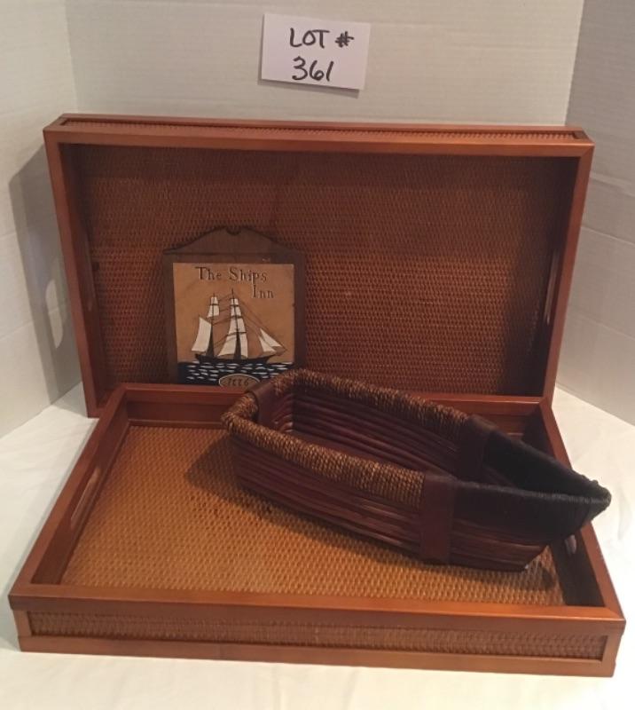 B - 361 Pair Wood & Cane Serving Trays with Decorative Boat