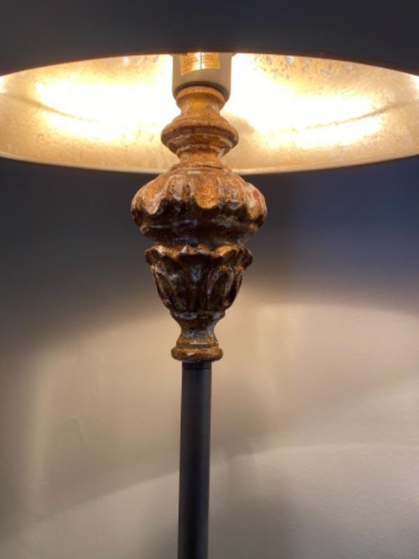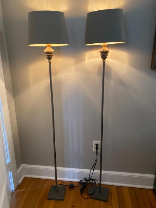 A pair of Candlestick Floor Lamps from Kellogg Collection., they have gray oval lamp shades with gold foil lining