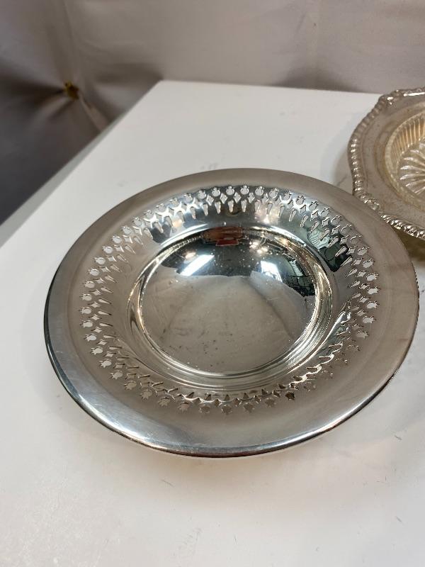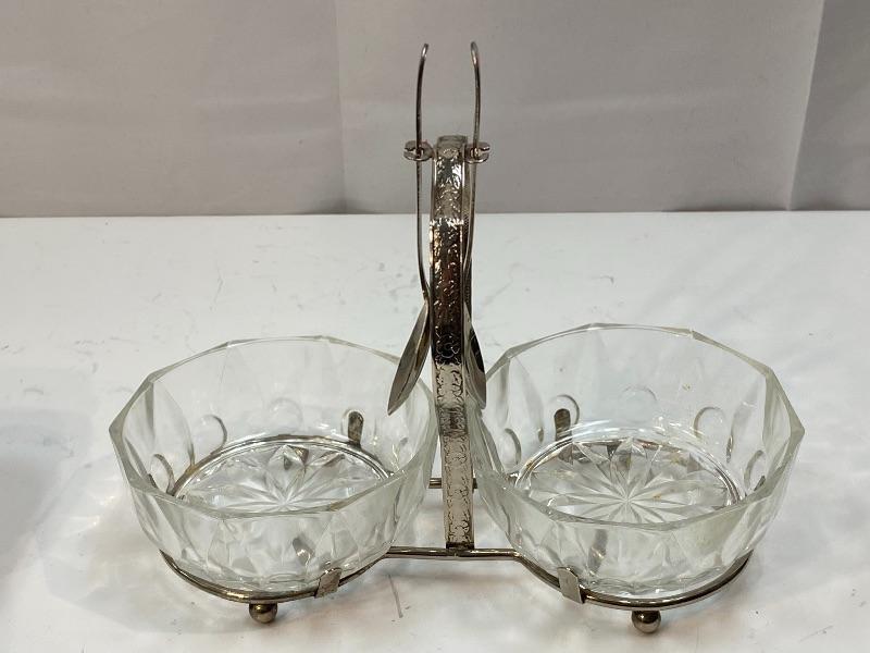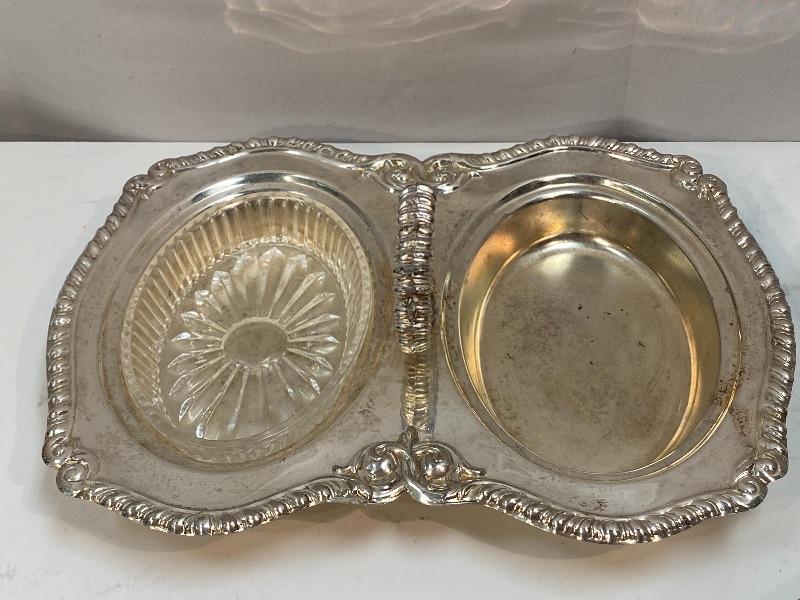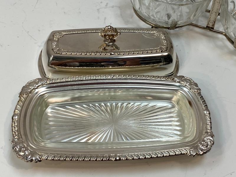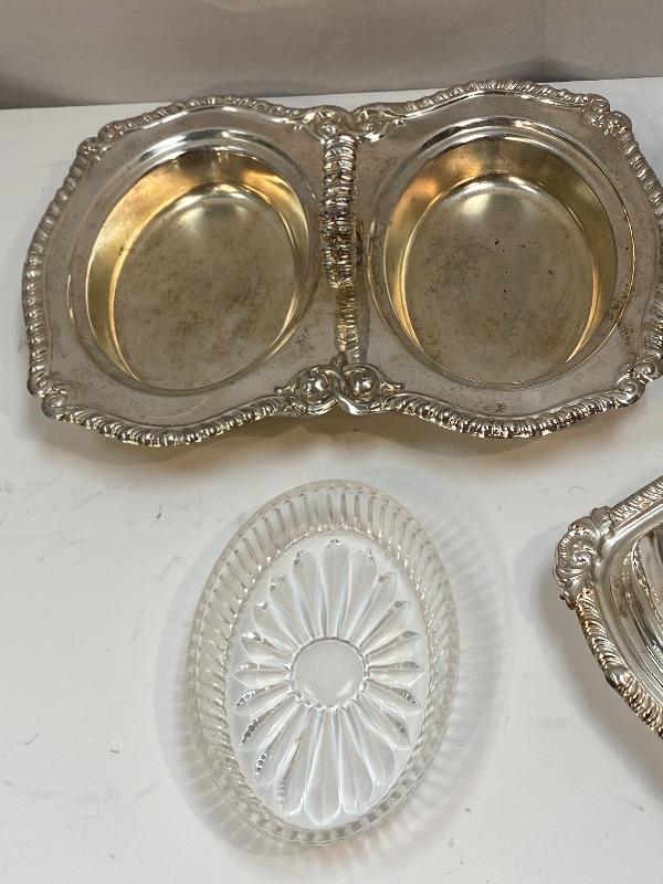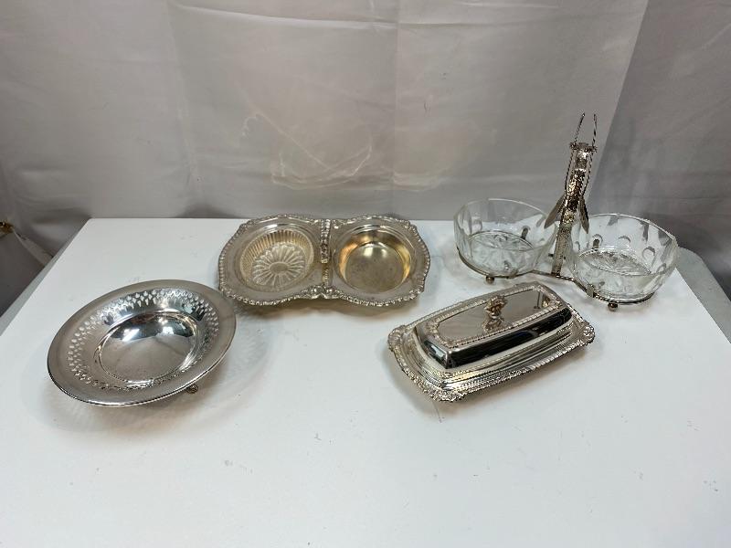 4 piece silver plate table pieces. Butter dish with glass tray, double jam bowl caddy with spoons, double shallow dish caddy (missing one glass piece) and small bowl. Great for adding to any table. Mixed brands.