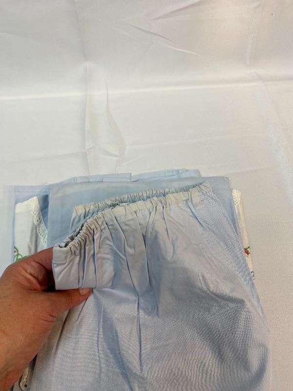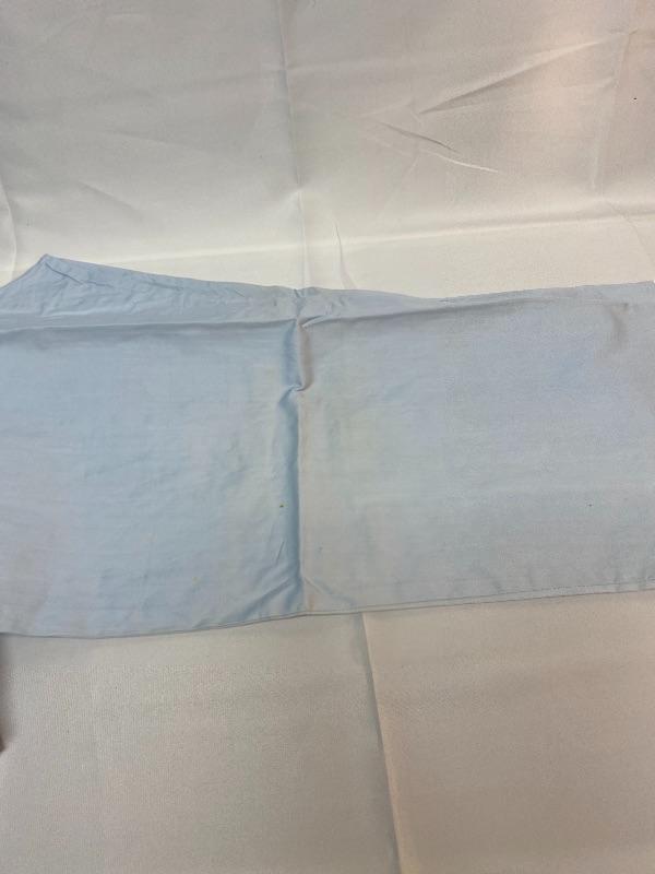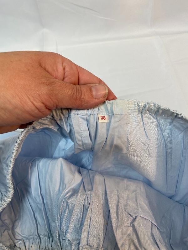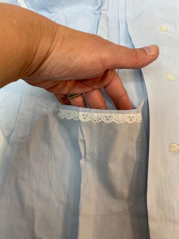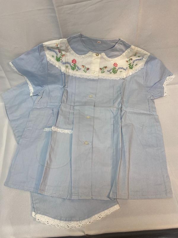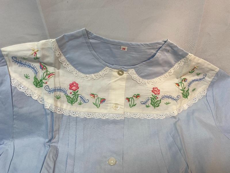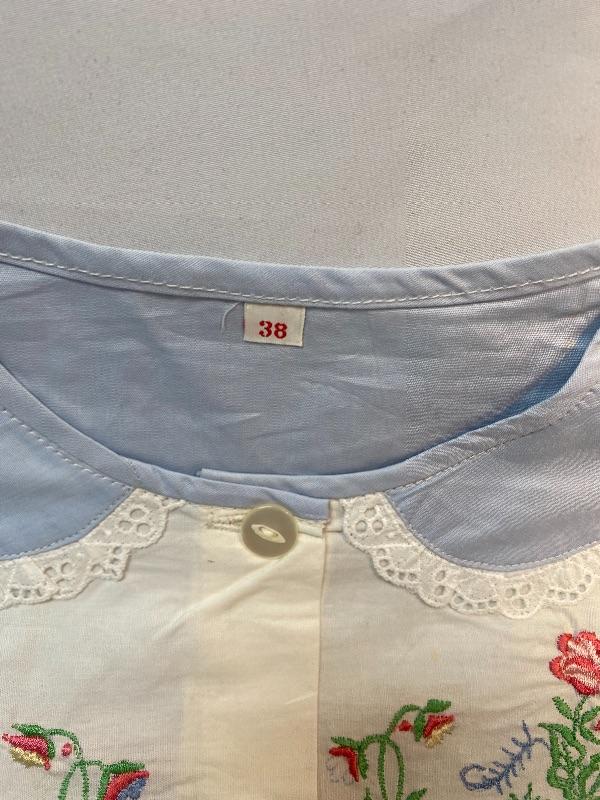 Vintage 2 piece pajama set. Ladies cotton set in powder blue. Button front top has flower detail at top, small pocket on front. The only tag on both pieces says 38. Shin length sleep pants with elastic waist, elastic is old. There is some discolor, along waist edge and fold, possibly just from age and storage, not sure. No holes or obvious spots.