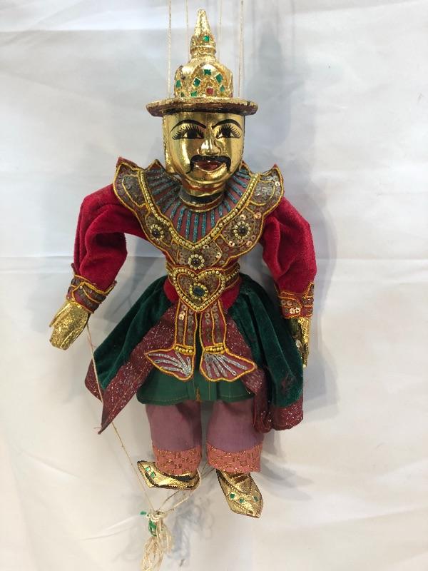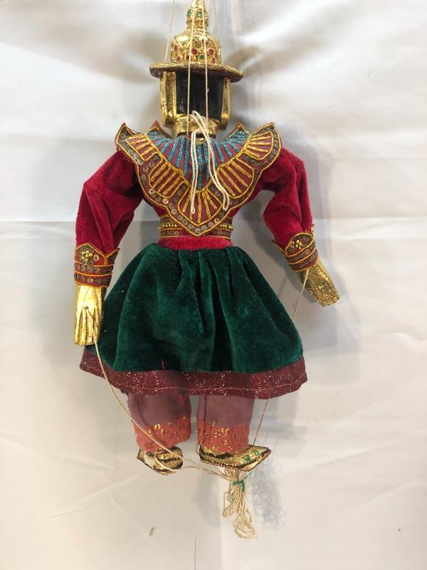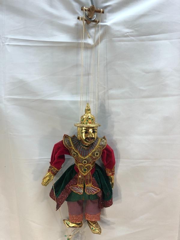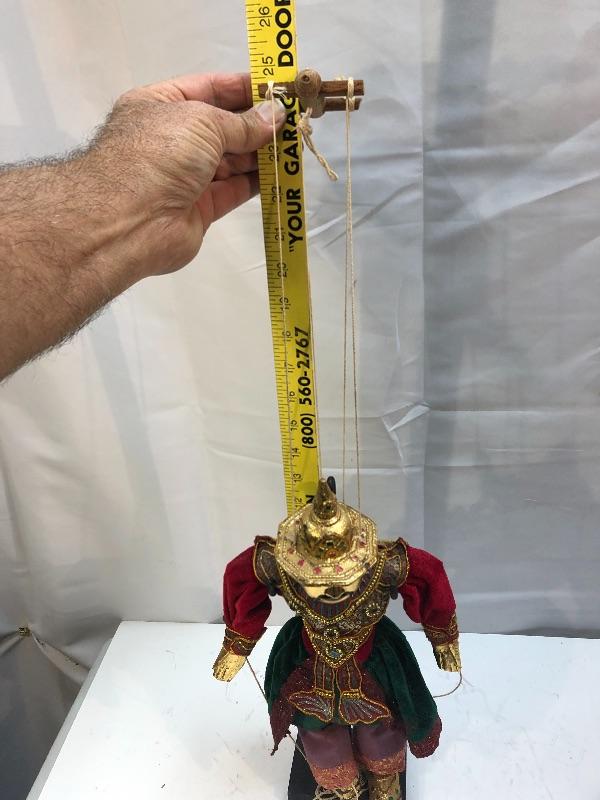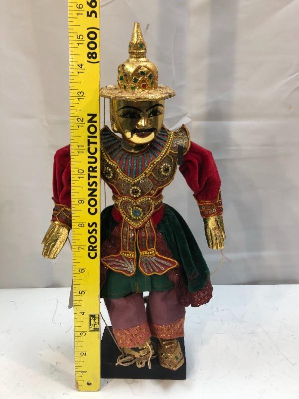 Vintage Thai marionette string puppet. Displays wonderfully. Lots of gold tones. Dark red clothing. About 16" without strings. Does come with stand.
