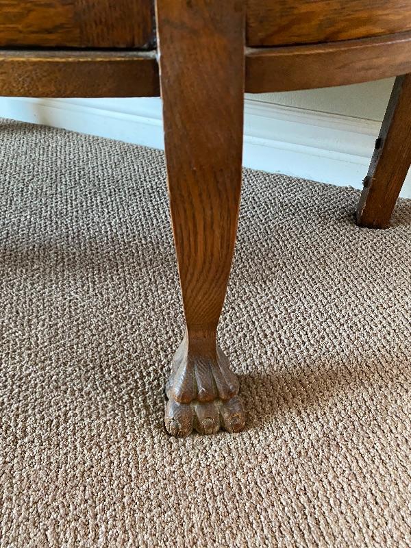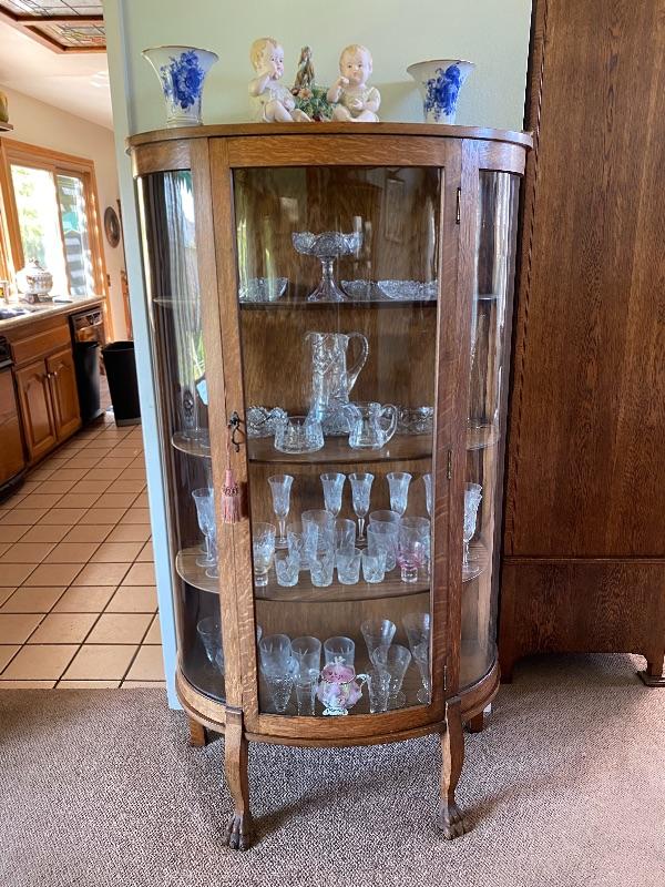 Antique curved glass curio display cabinet. Locking door with key, claw feet in the front. Wood shelves inside. Under 6' tall. Contents not included. #24-10040