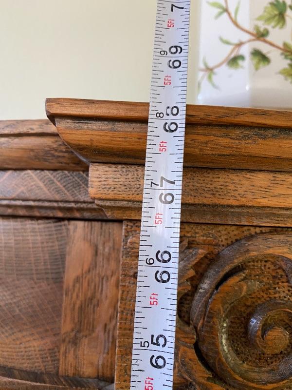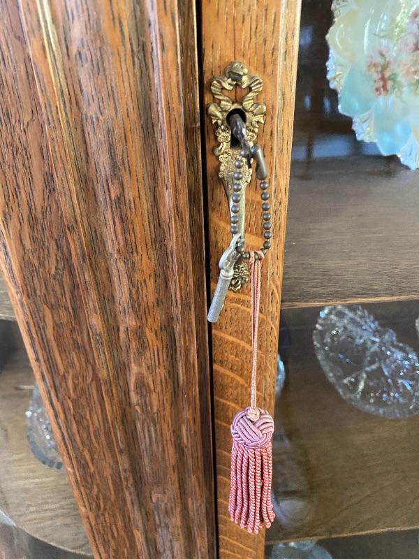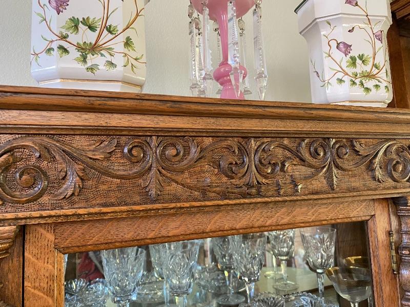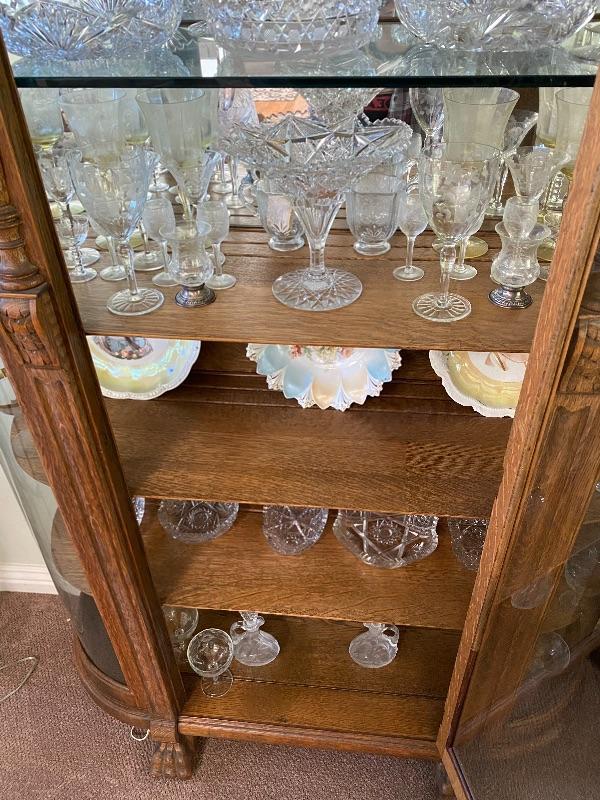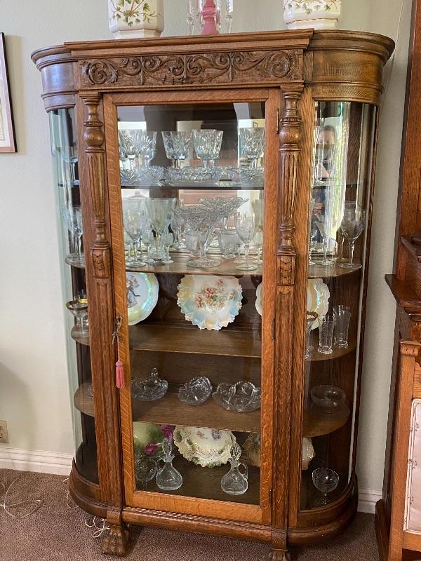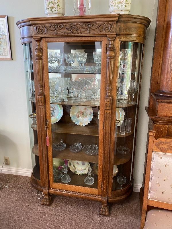 Antique curio display cabinet. Bowed glass sides, locking glass door. Ornate carved details to the wood. Inside is lighted. Top shelf glass, the rest are wood. Mirrored back behind the top two shelves. Stands about 68" tall. Contents are not included. #24-10010
