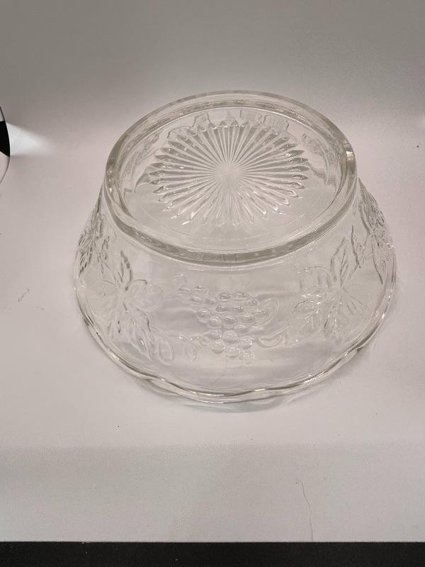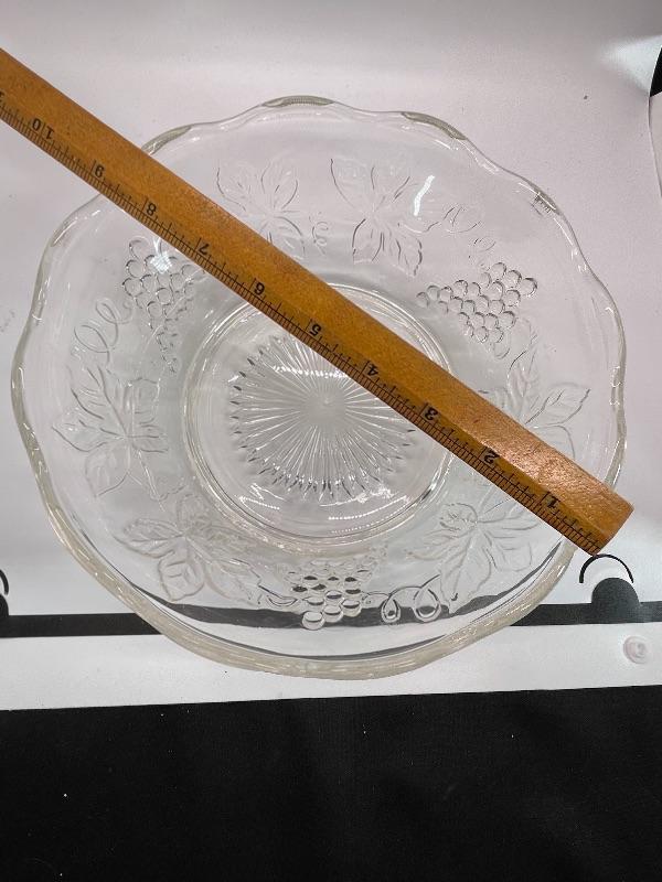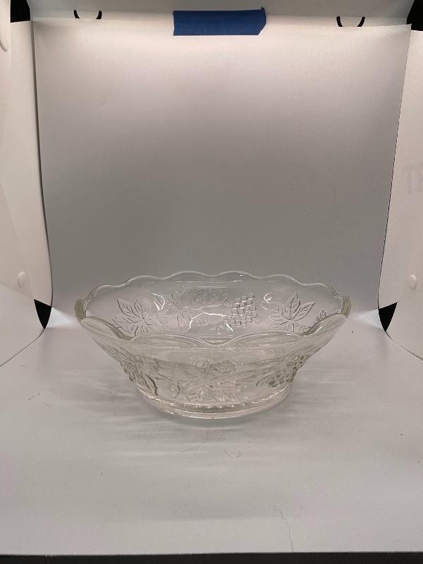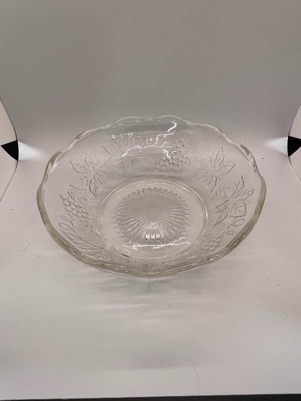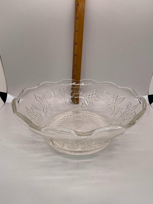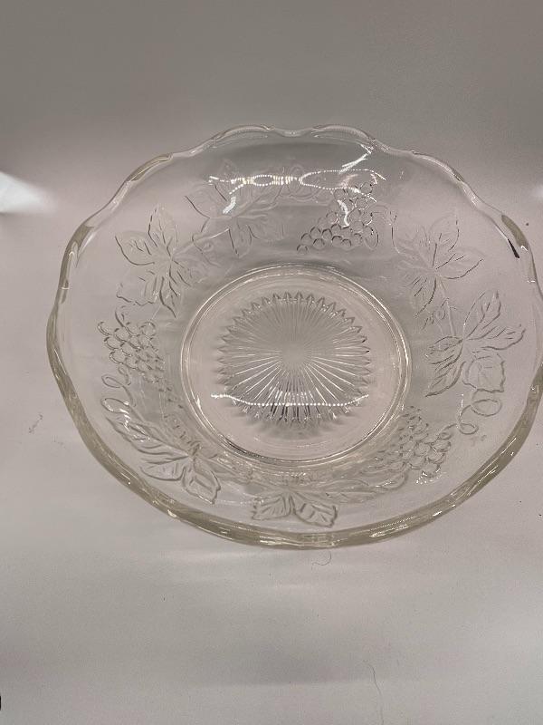 Clear glass serving bowl. Scalloped edge with an embossed grape vine design. About 8" across, good condition.