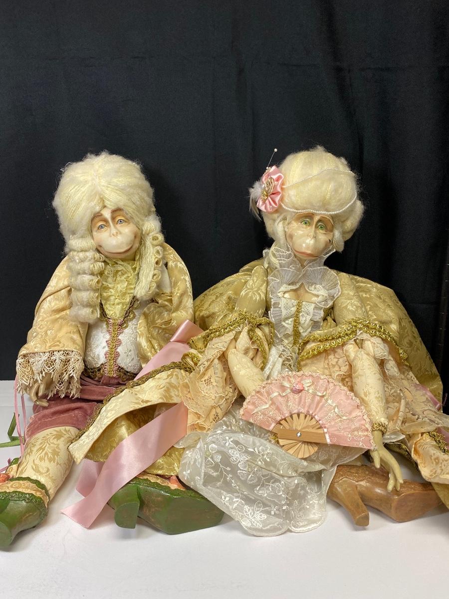 Vintage Wayne Kleski Victorian monkey man and woman dolls. Nicely dressed, in good condition. About 26" size.