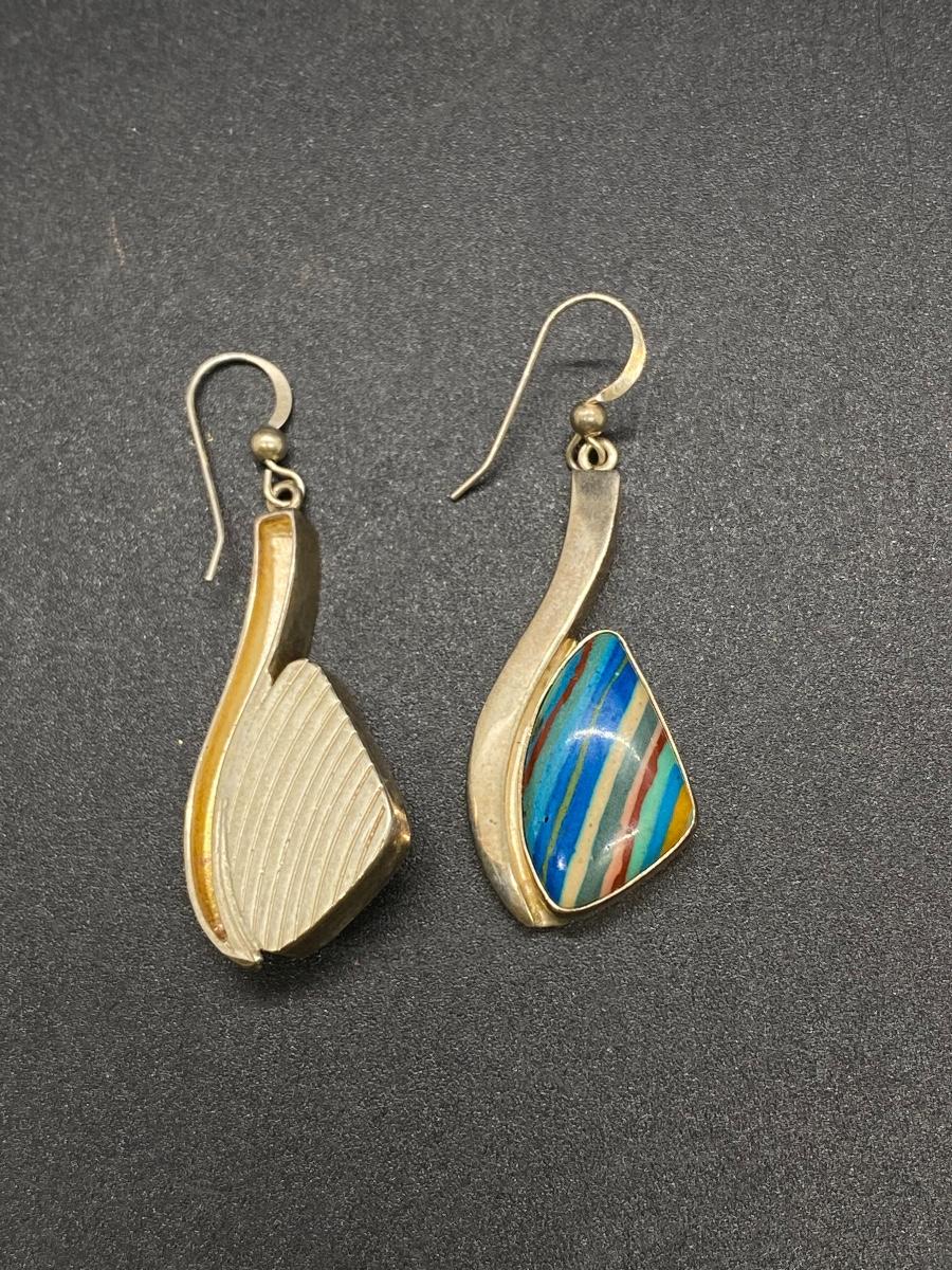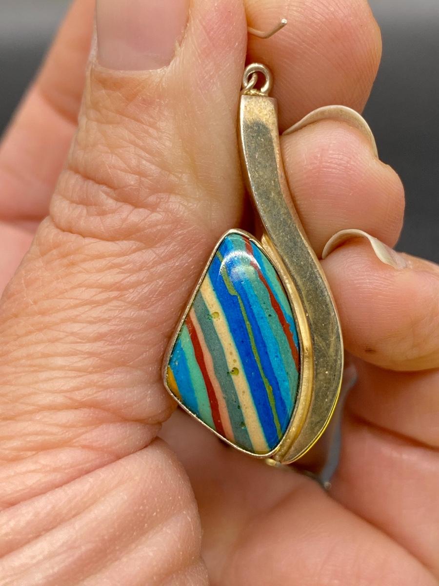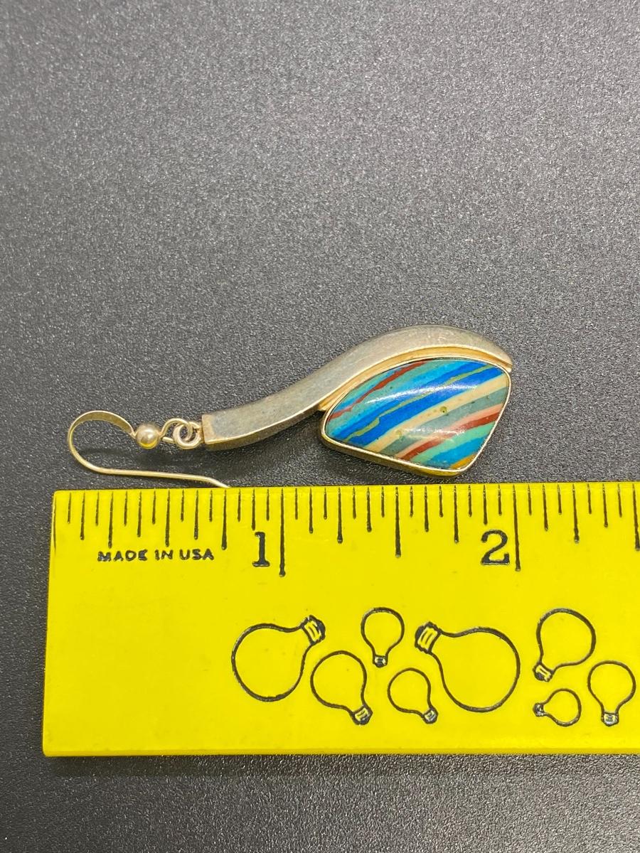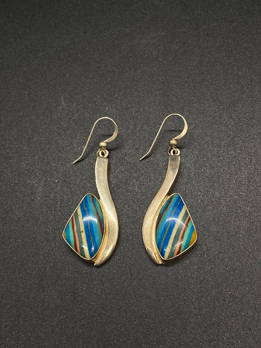 Rainbow striped calsilica dangle earrings. Silvertone metal. No marks. About 2" length.