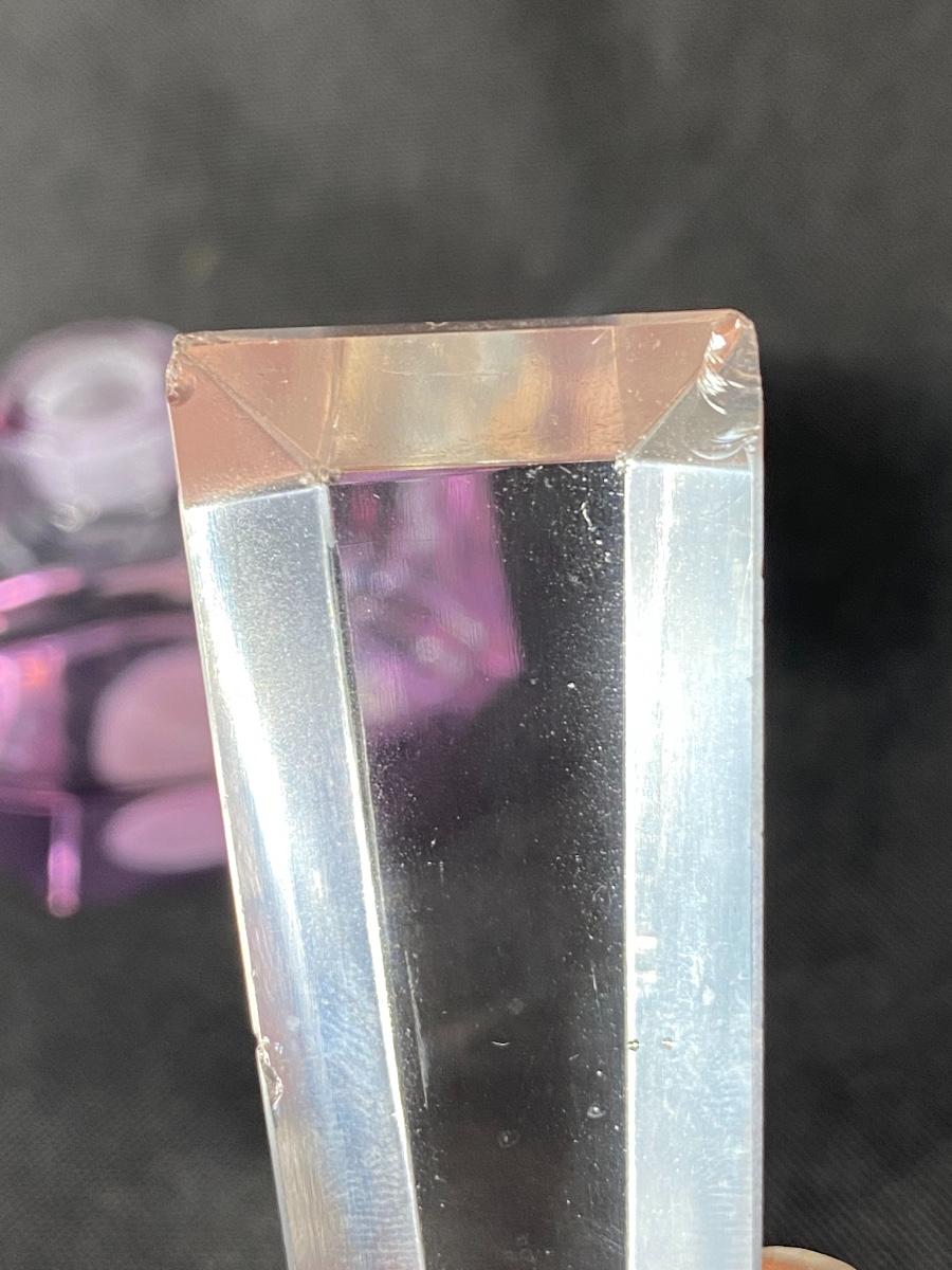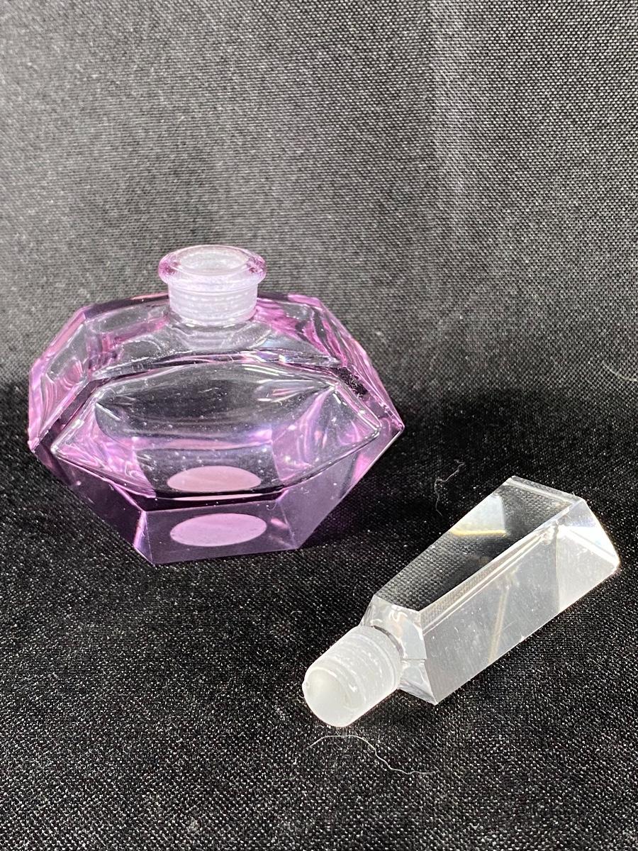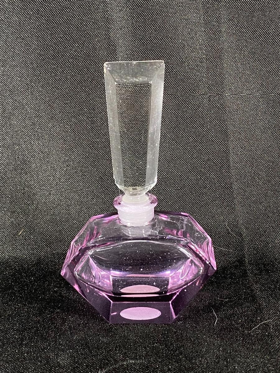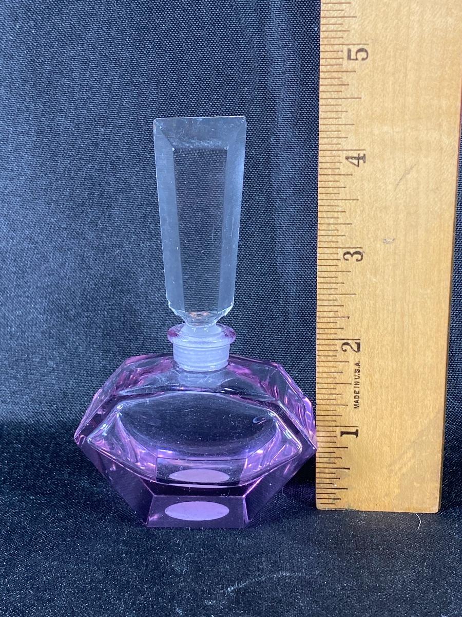House of Global Art purple and clear cut crystal perfume bottle. Pale violet base with prism cut stopper. There is a couple minor nicks in the stopper edges. About 4.5" tall.