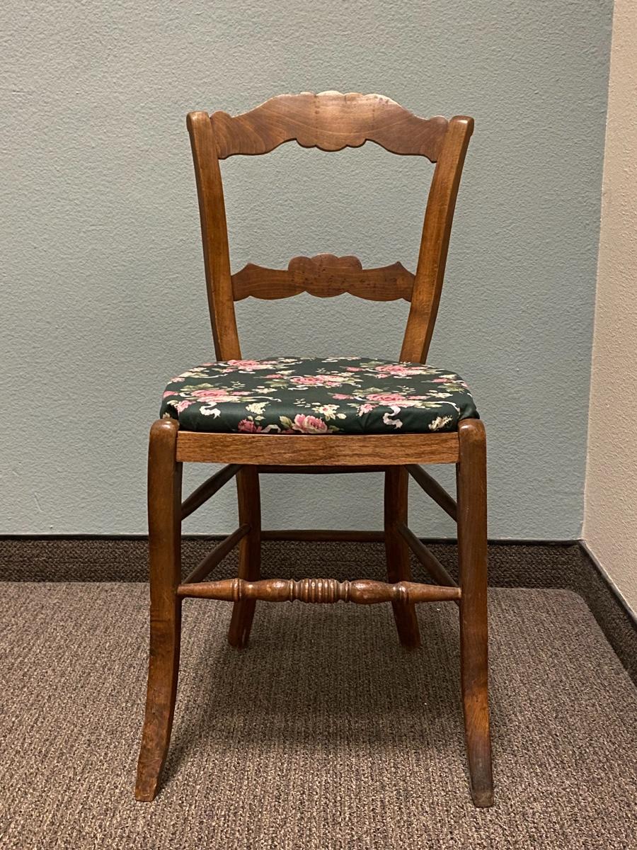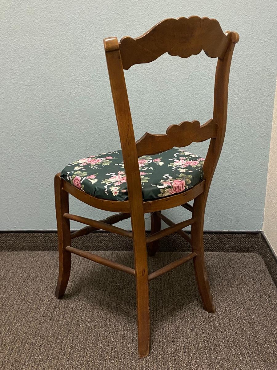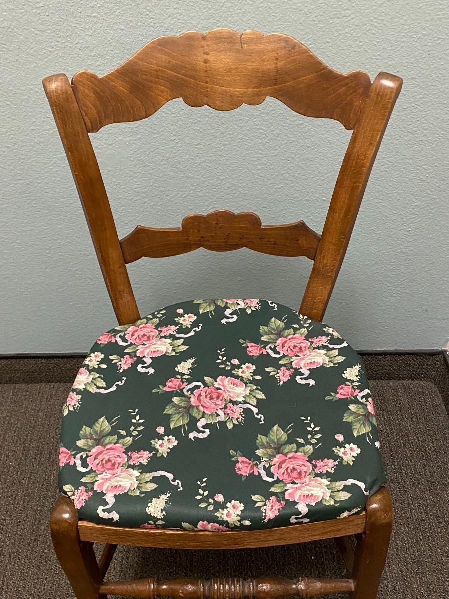Vintage wood chair. Seat comes off, can easily change the fabric of seat.