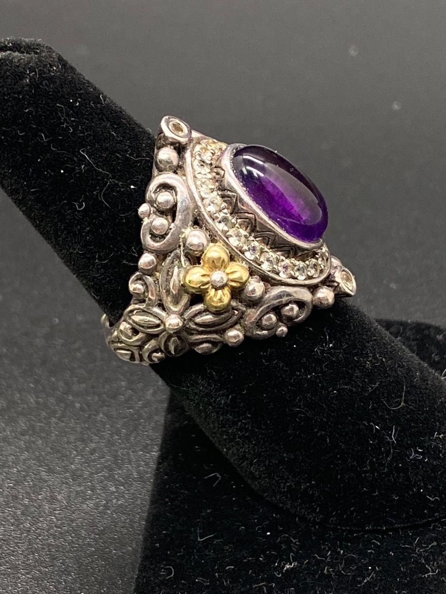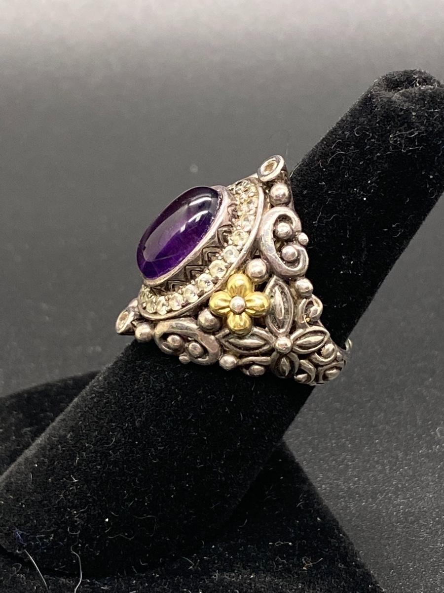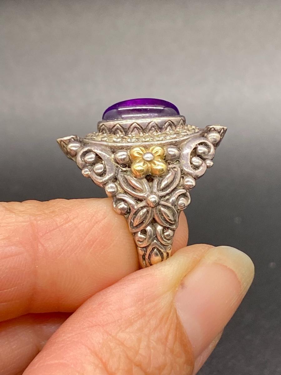 Barbara Bixby sterling silver and 18k yellow gold ring. Amethyst cabochon center, filigree sides. Fits like a 7. Stamped inside.
