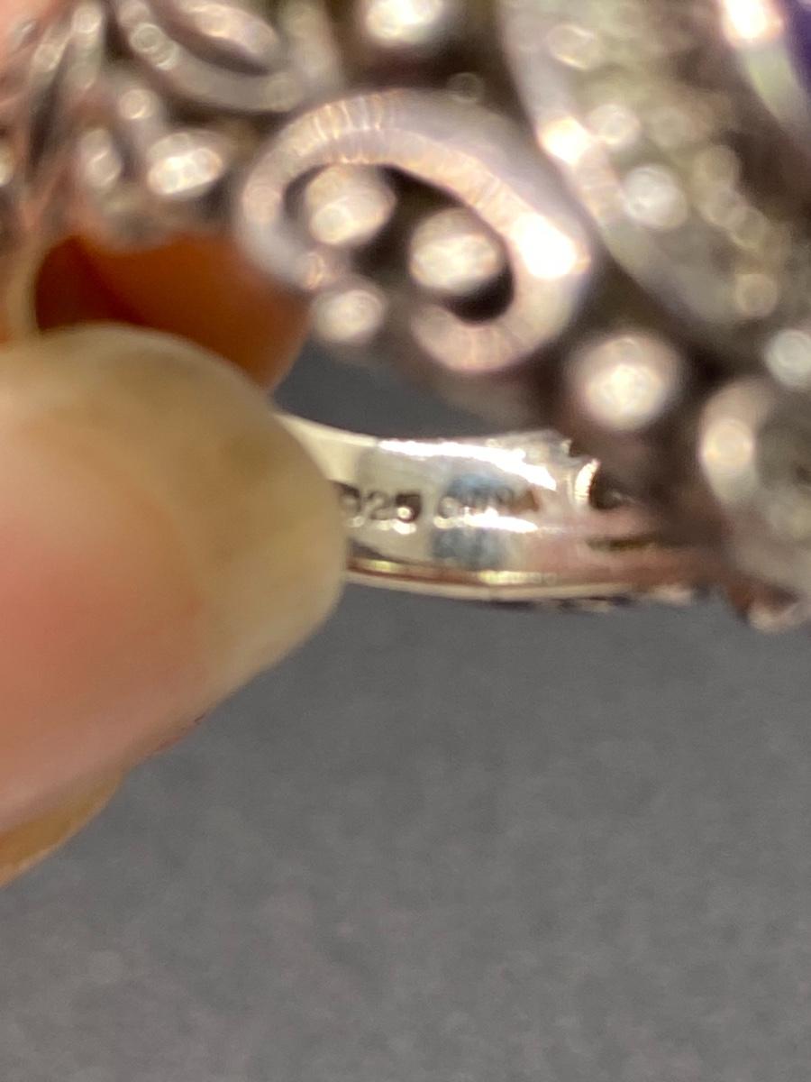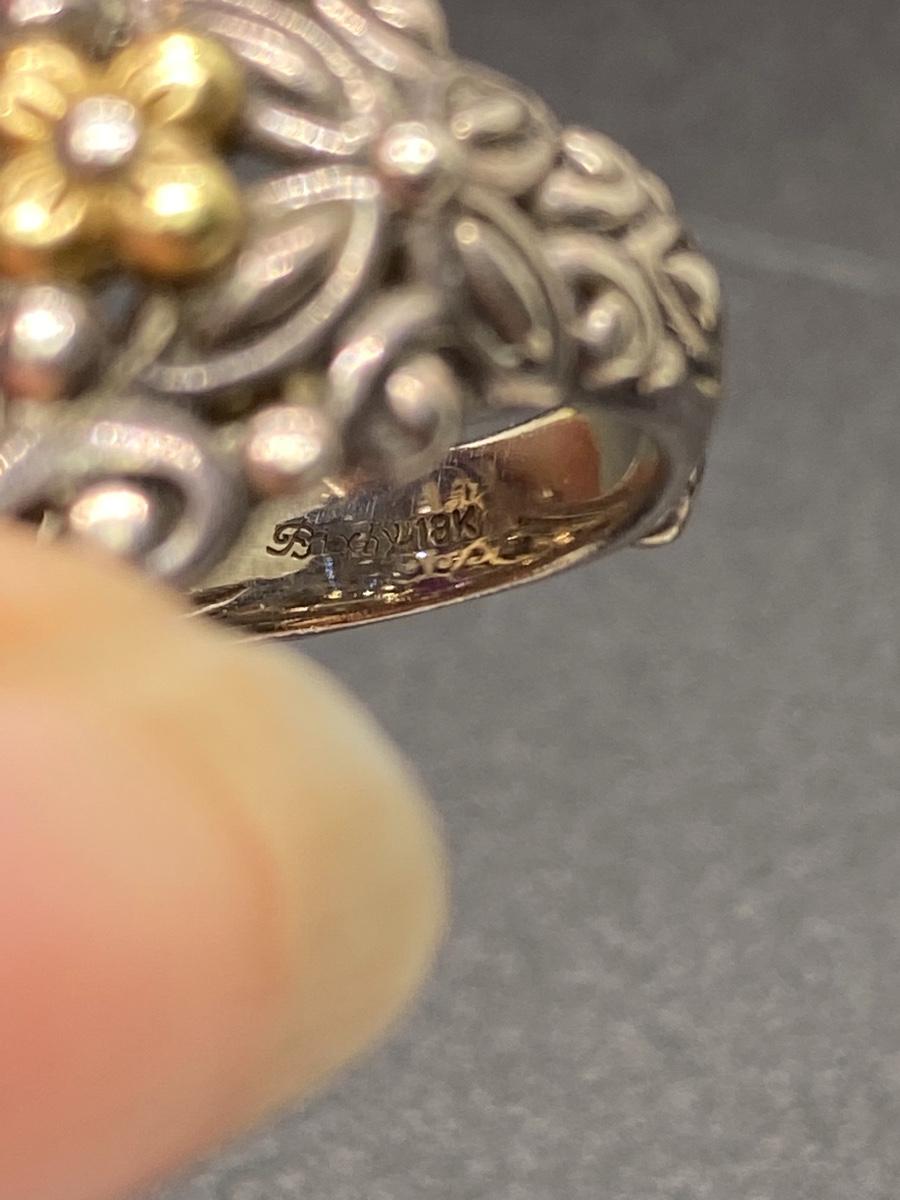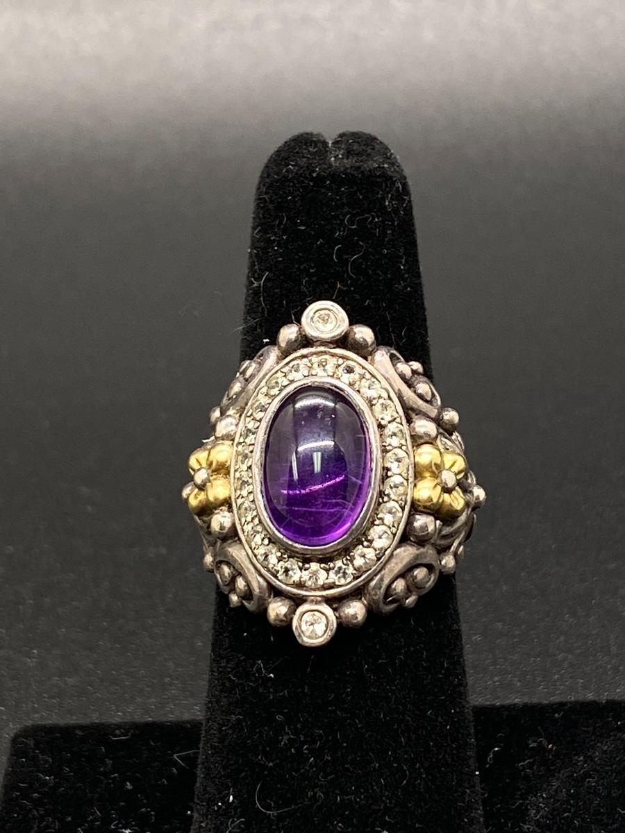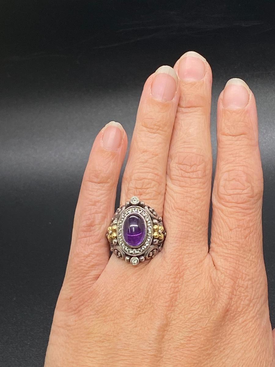 Barbara Bixby sterling silver and 18k yellow gold ring. Amethyst cabochon center, filigree sides. Fits like a 7. Stamped inside.