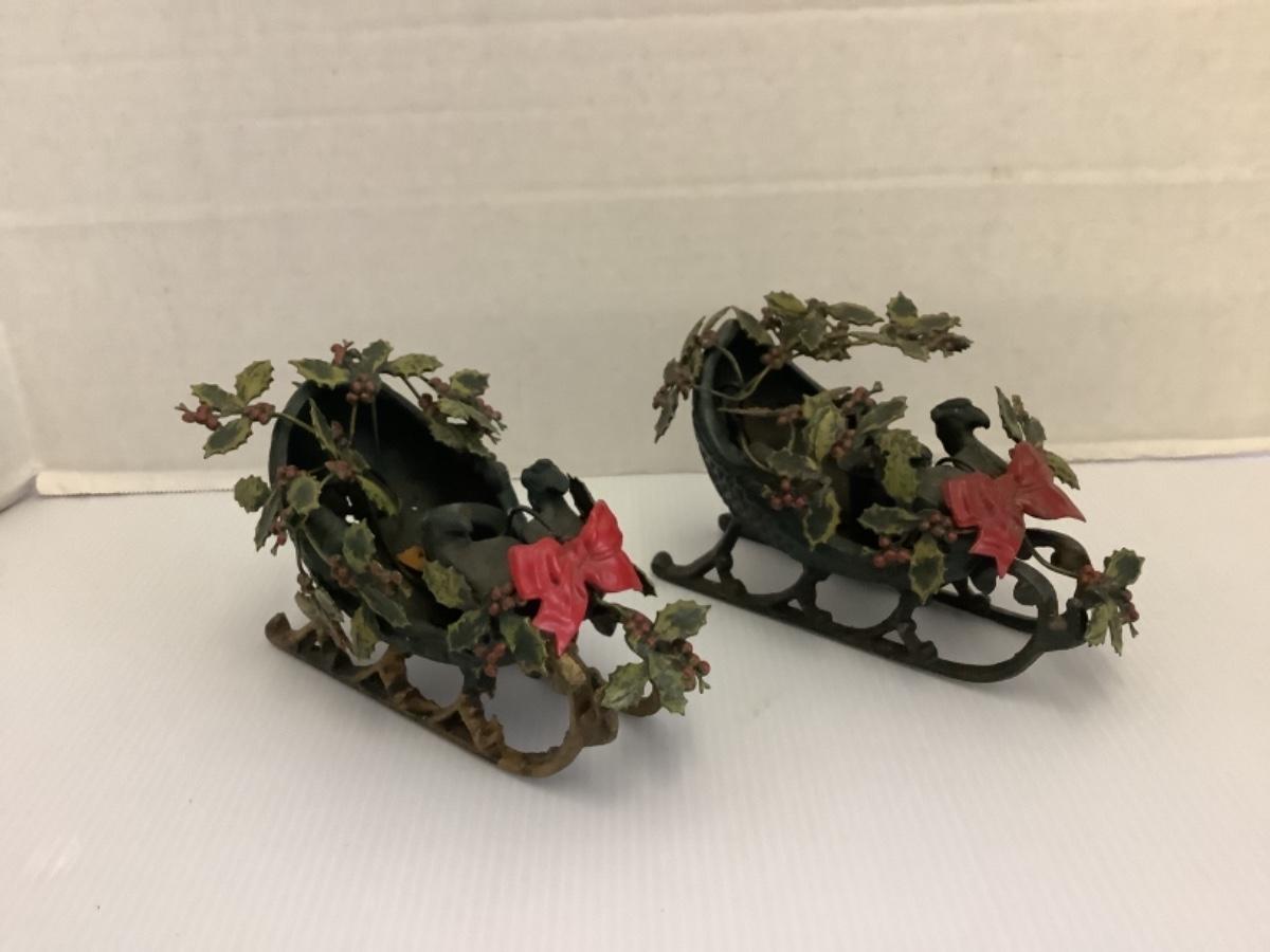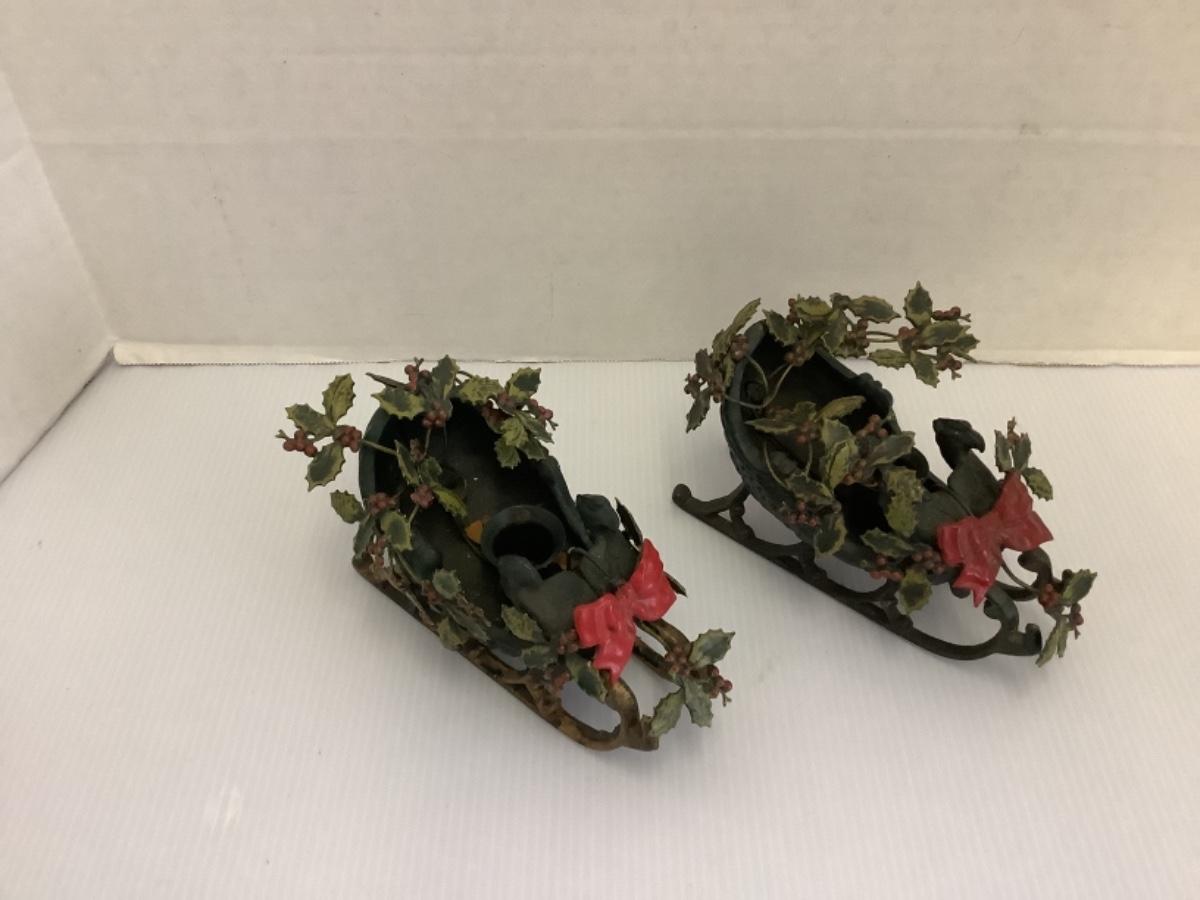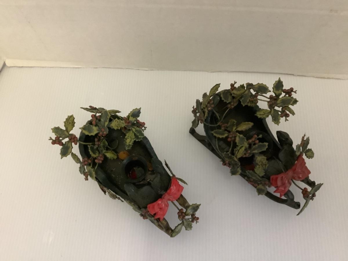 B - 603 Pair of Wrought Iron & Metal Sleigh / Holly Candleholders