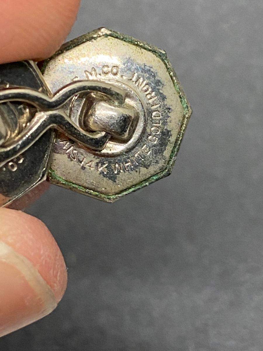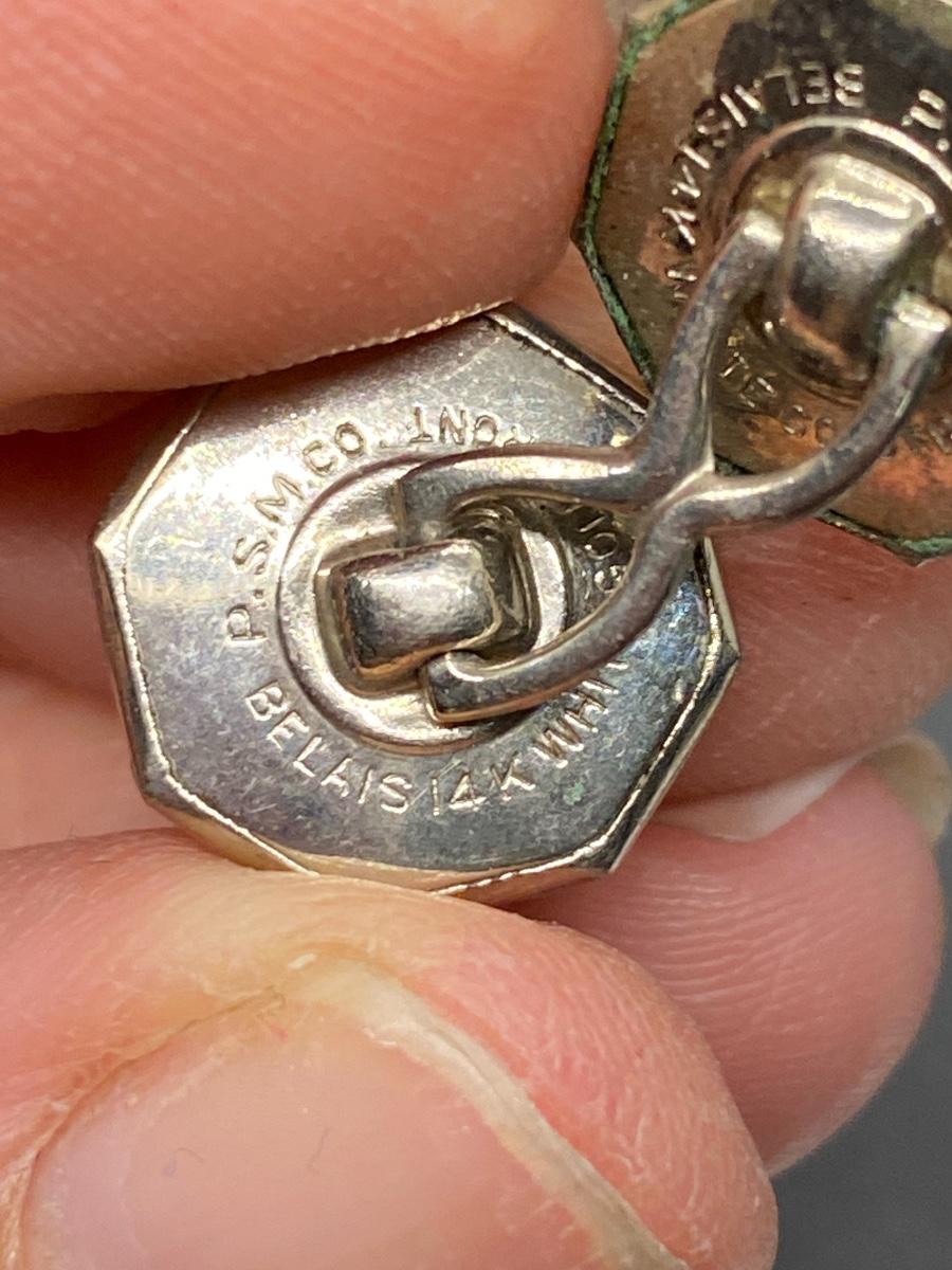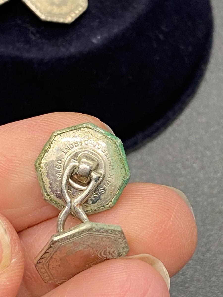 Antique Belais 14k white gold cuff links. Hexagon shape. One has green patina on it. Marked on the back.