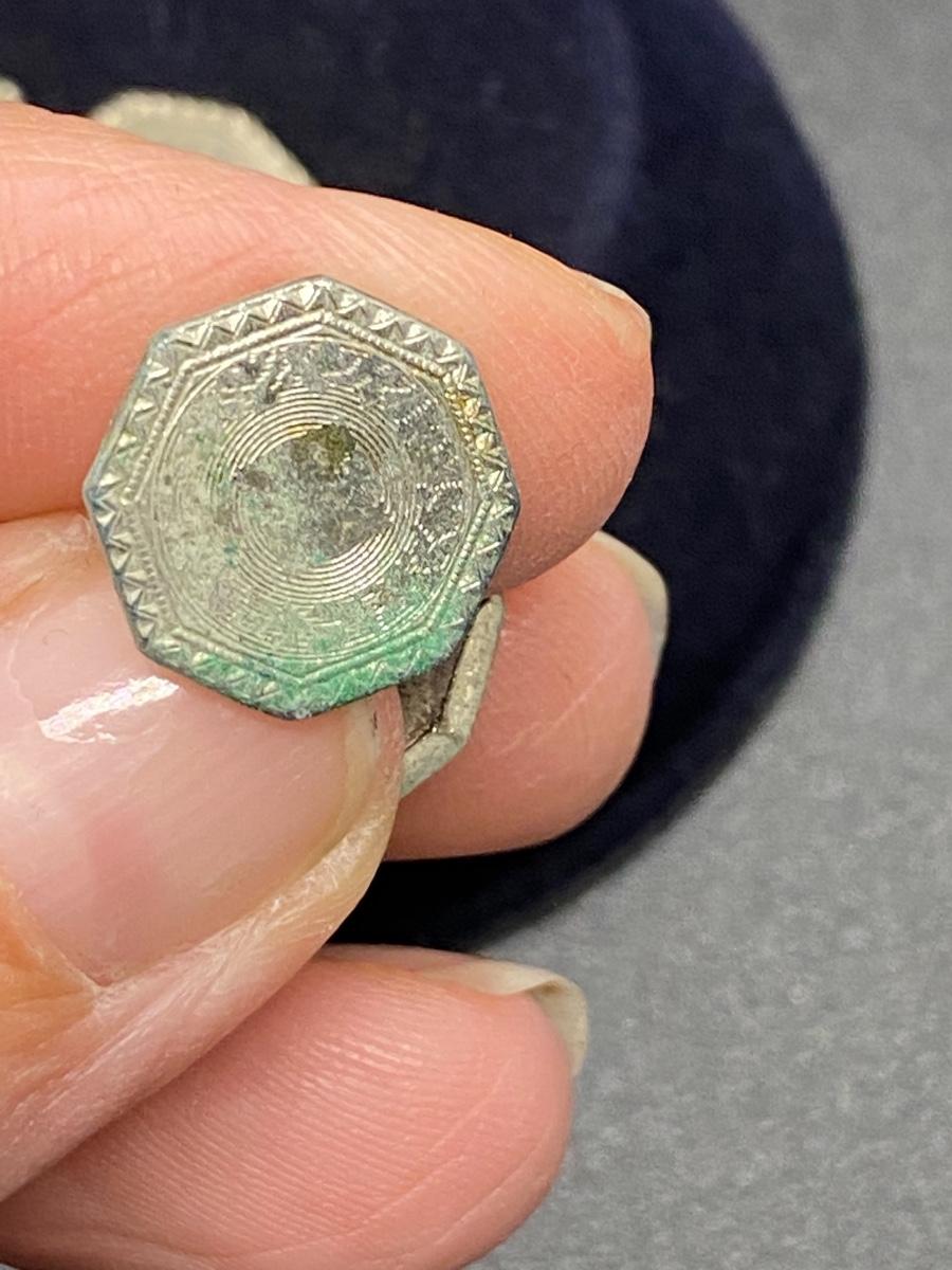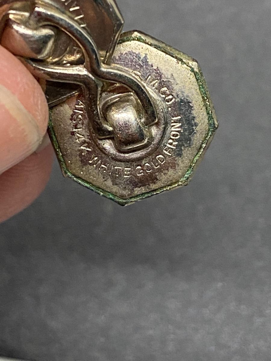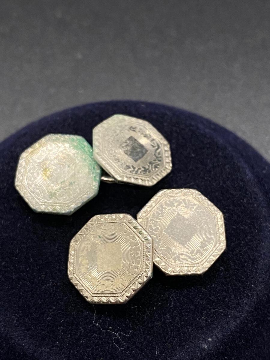 Antique Belais 14k white gold cuff links. Hexagon shape. One has green patina on it. Marked on the back.