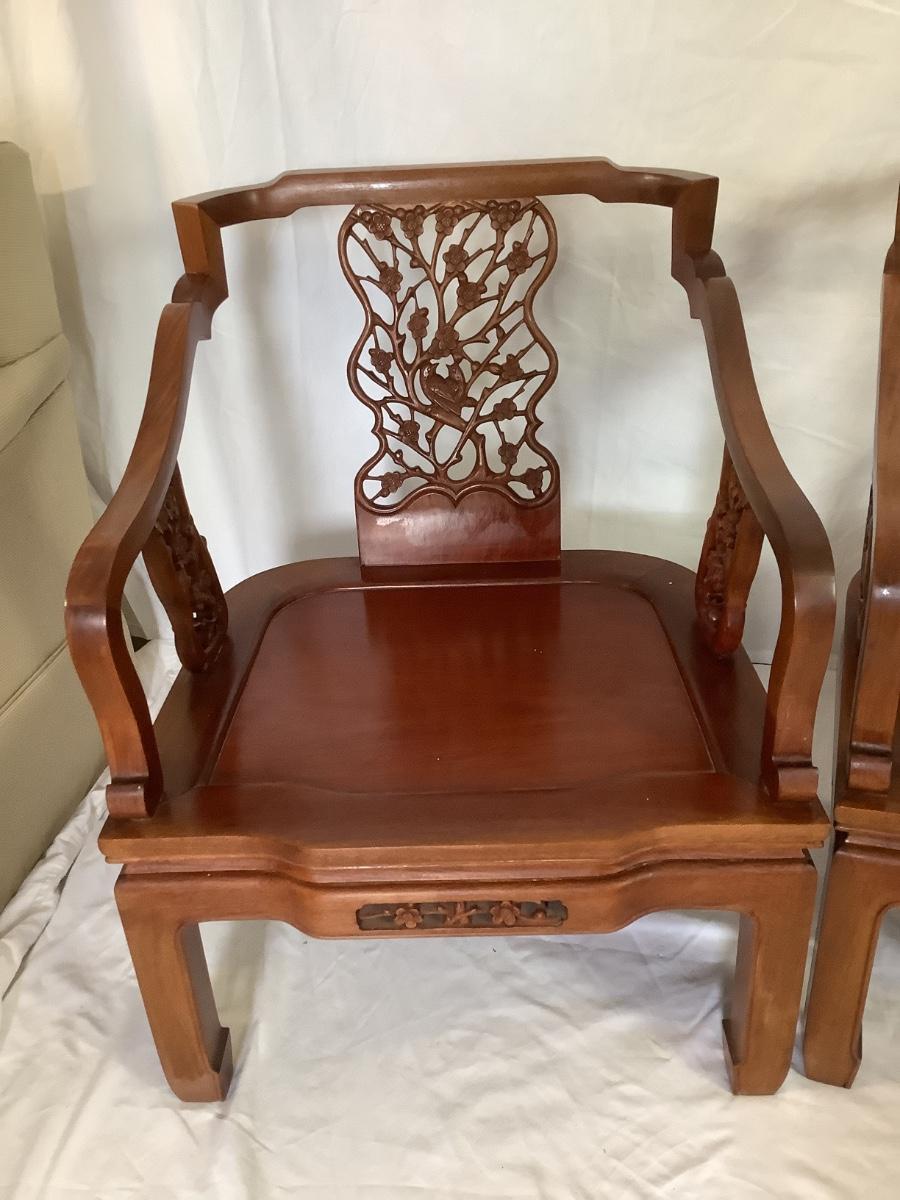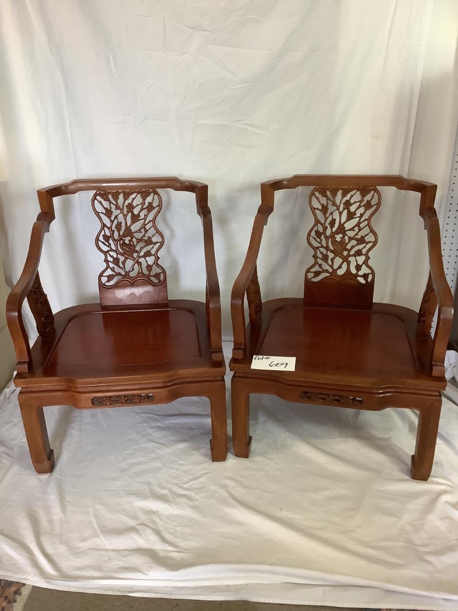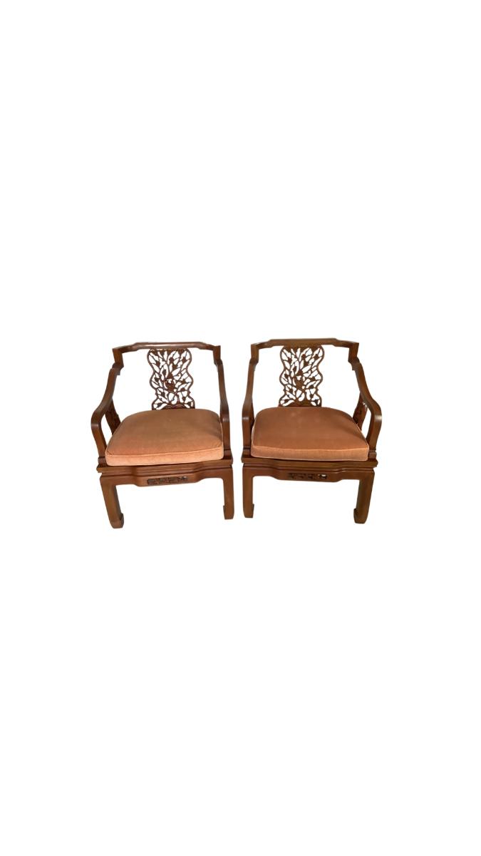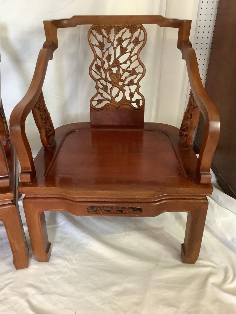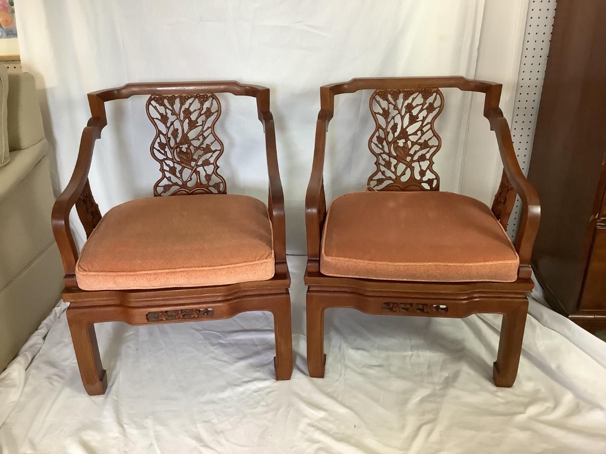 B - 609 Mid Century Modern George Zee Mahogany Carved Chinese Chairs ( with cushion )