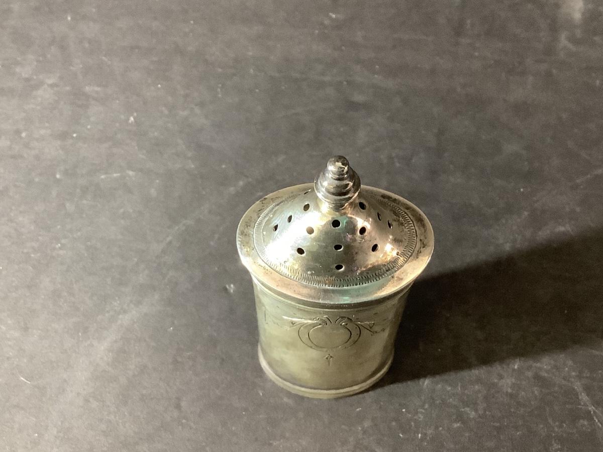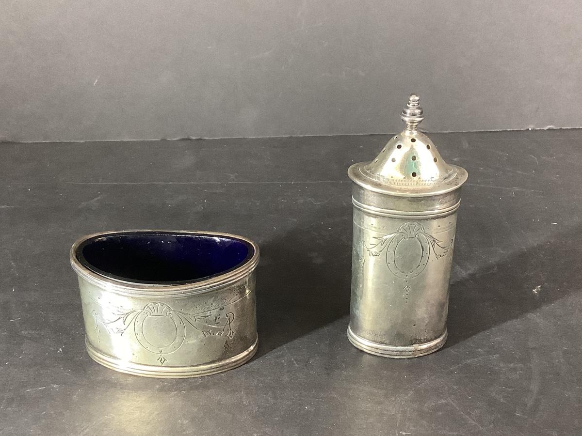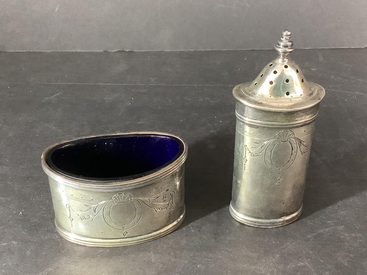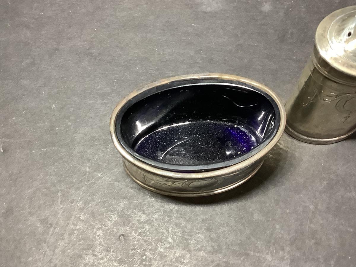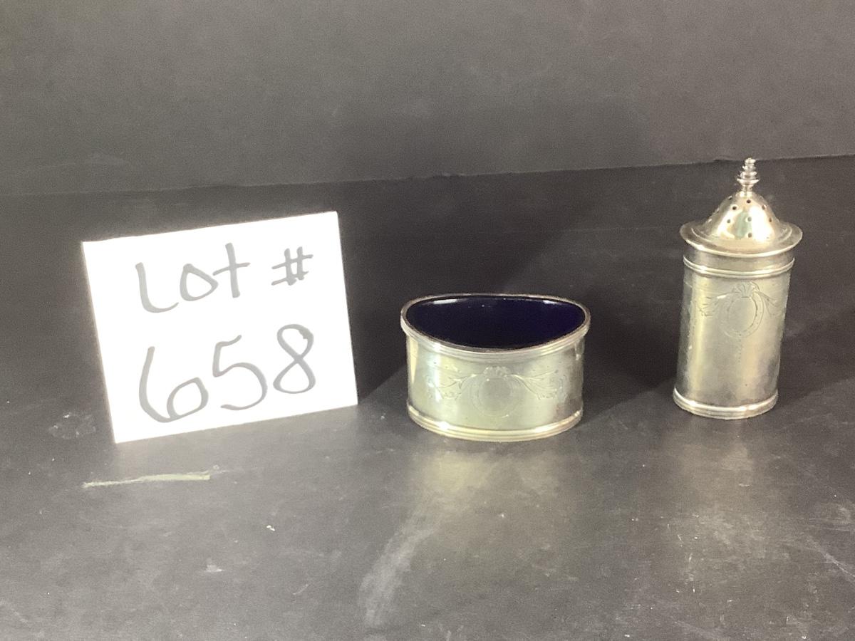 B - 658. Sterling Silver English Salt Bowl with Colbalt Glass Liner & Sterling Silver Shakers