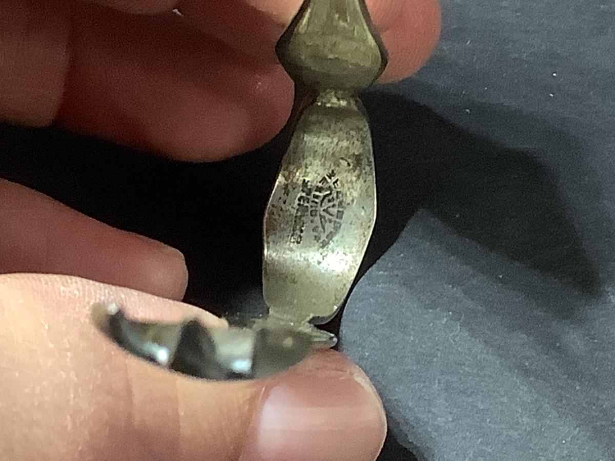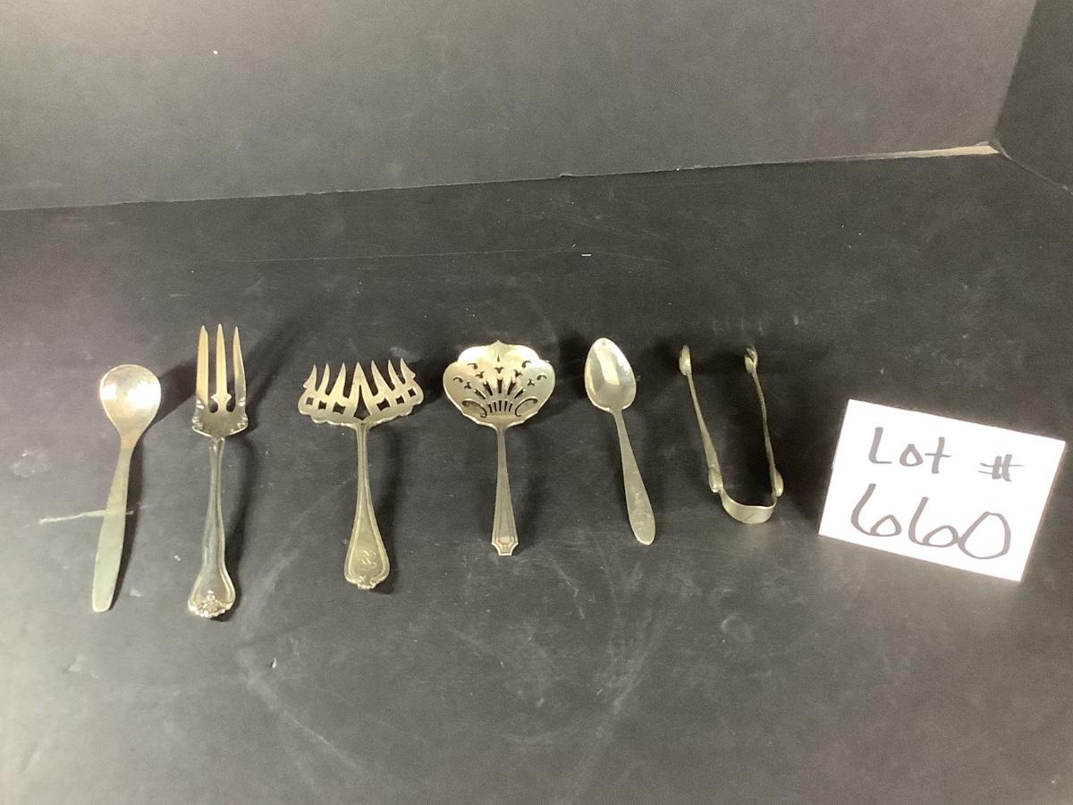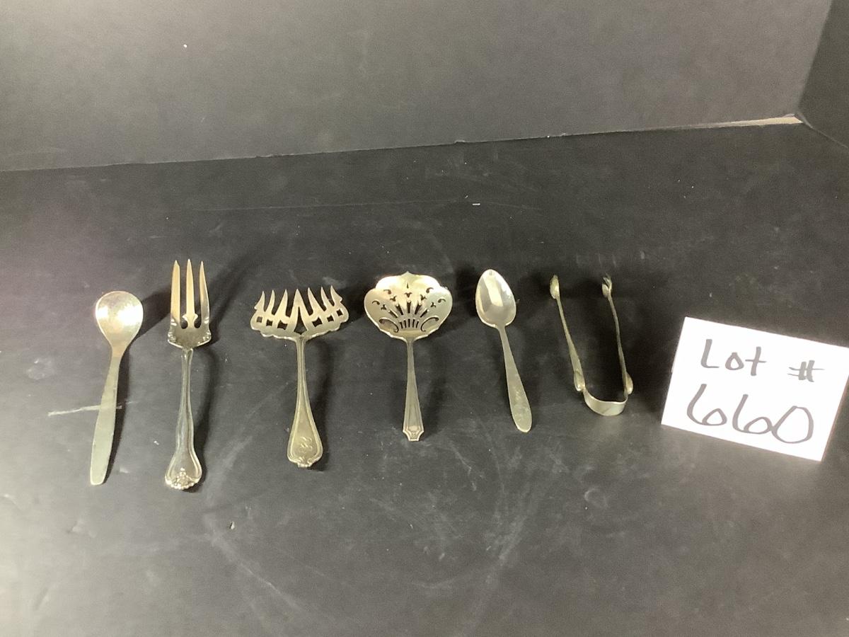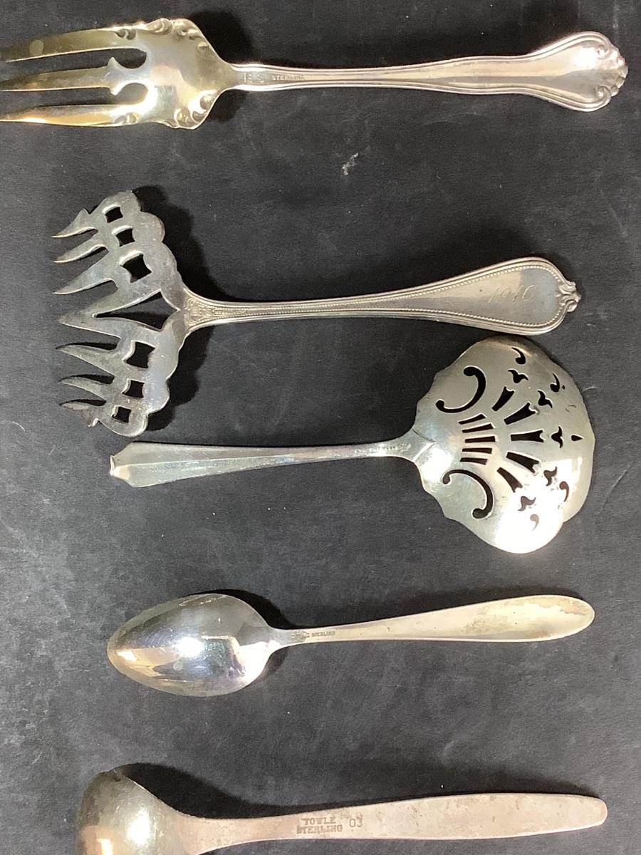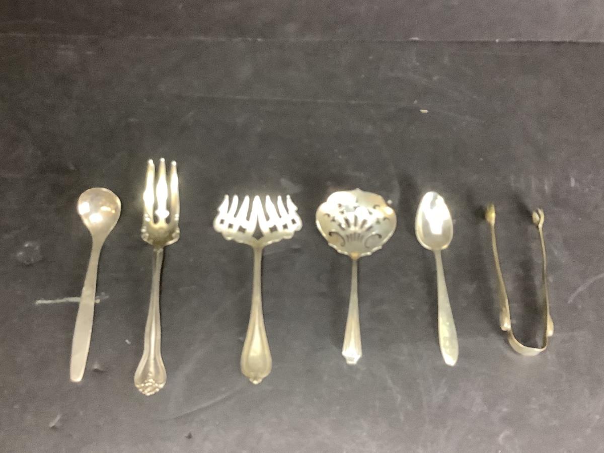1 ). First Spoon from left by Towle, fork, asparagus server, slotted spoon, teaspoon and small tongs