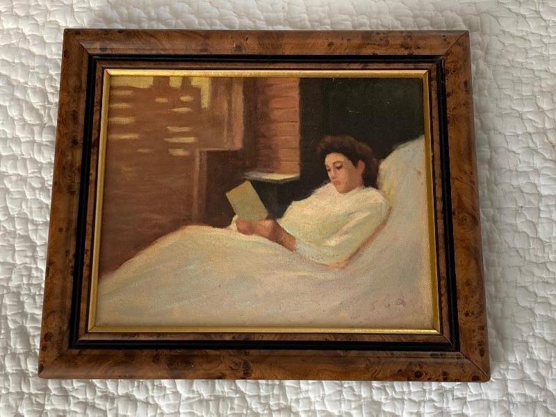 Lady Reading oil painting signed on back, measures 10-1/4”x12-1/2”