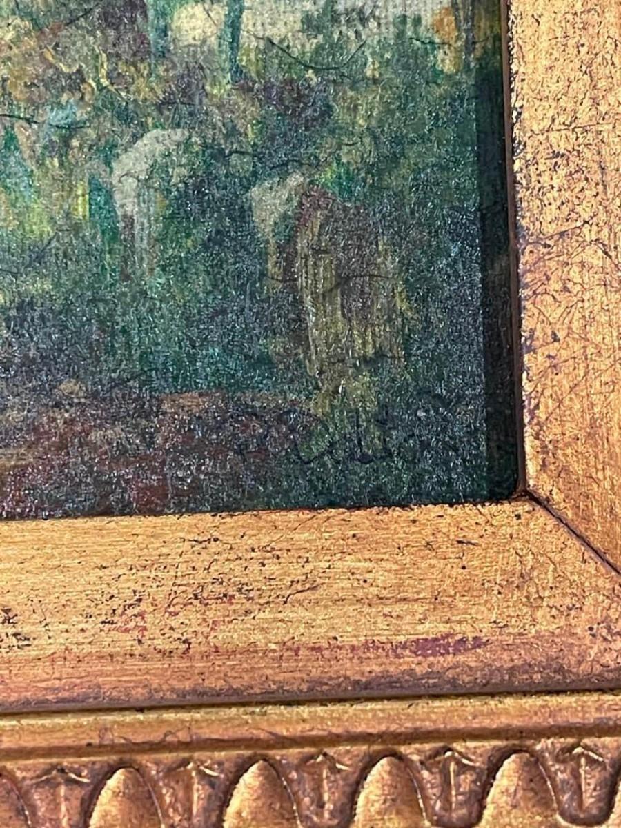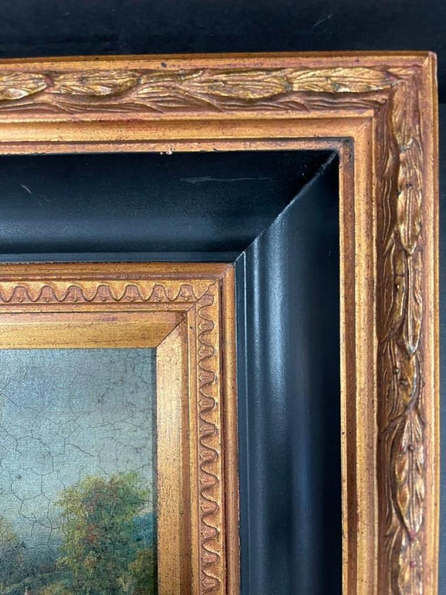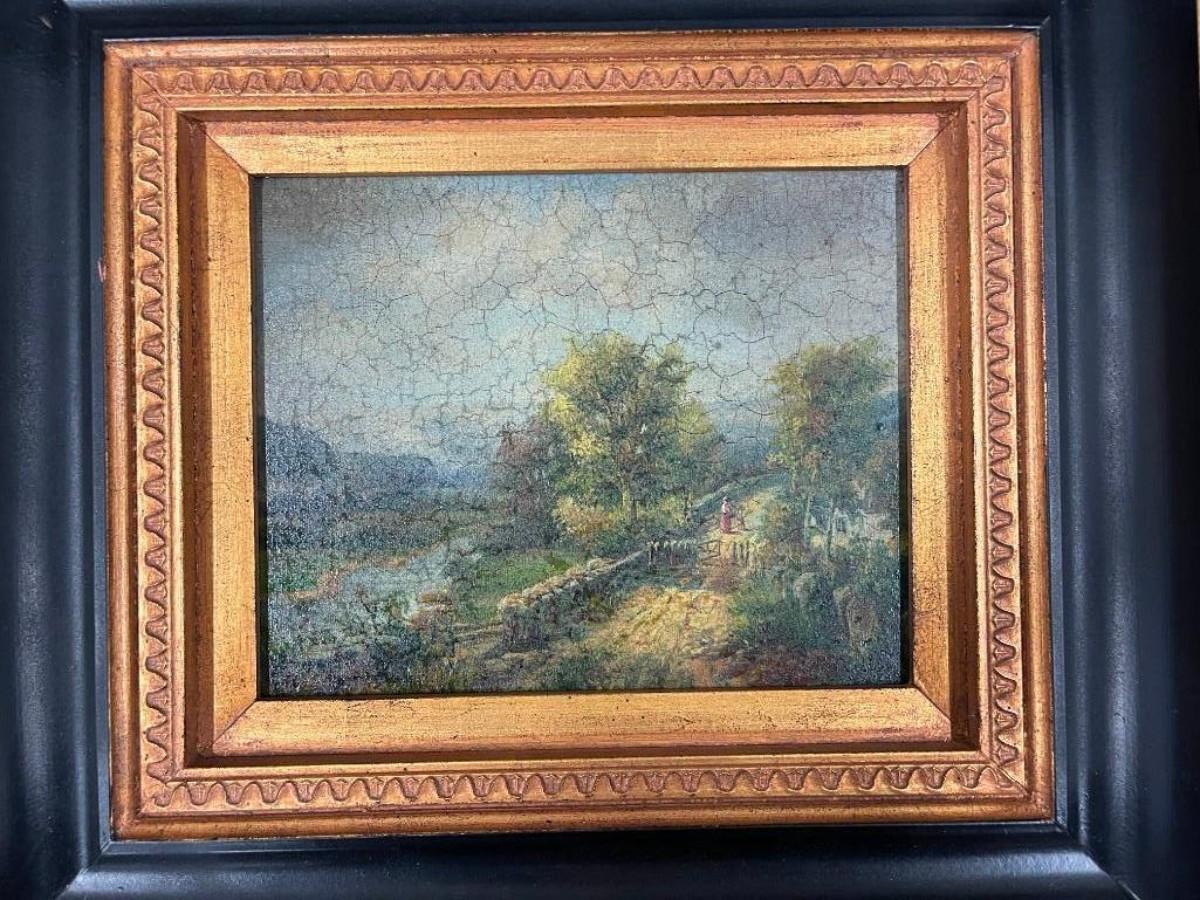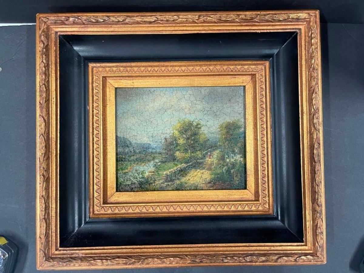 Custom framed landscape art on canvas by B Dalton. Framed 18 1/2" x 16 1/2"; Canvas: 8" x 10"