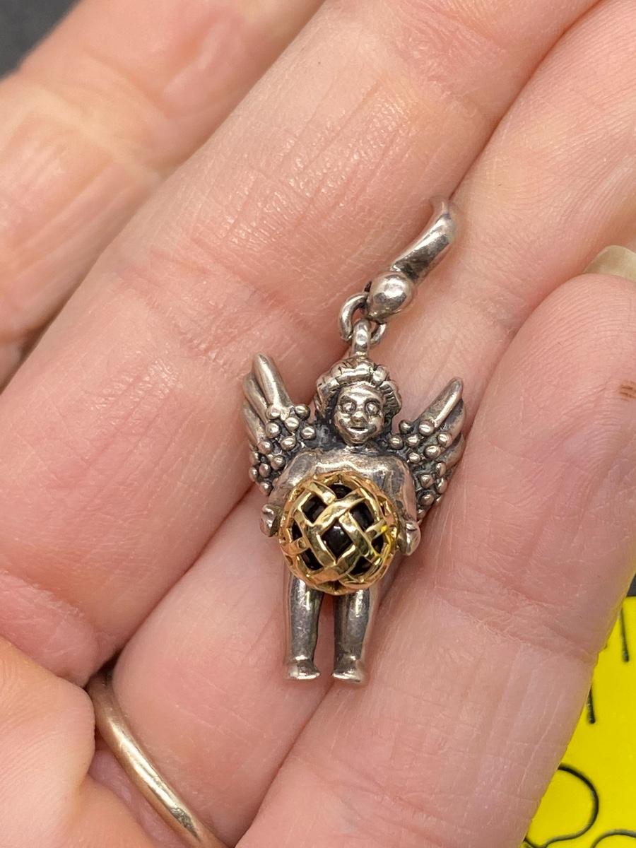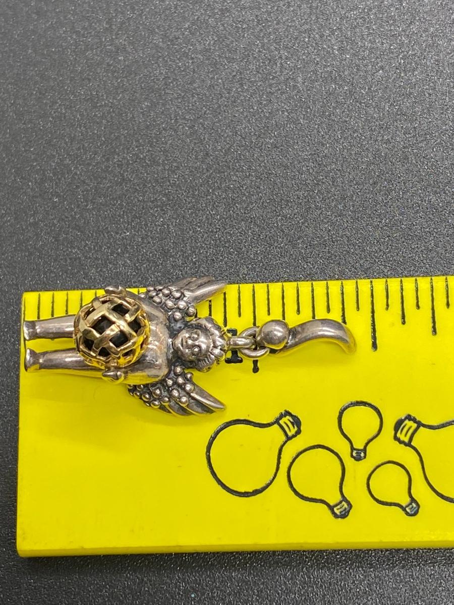 Pair of B Kieselstein Cord sterling silver & 14k gold angel earrings. Unfortunately one earring hook is broken, could be fixed or turned into pendants or charms. Angel is sterling holding a 14k yellow gold ball.