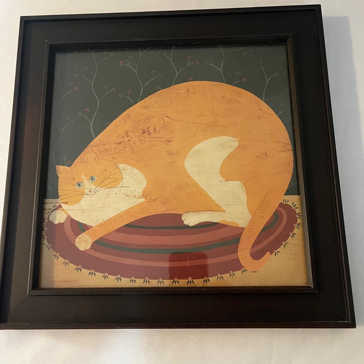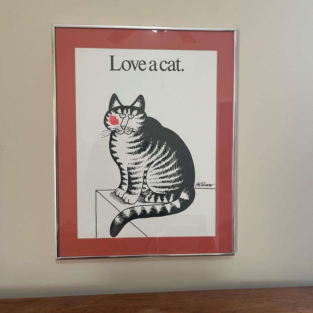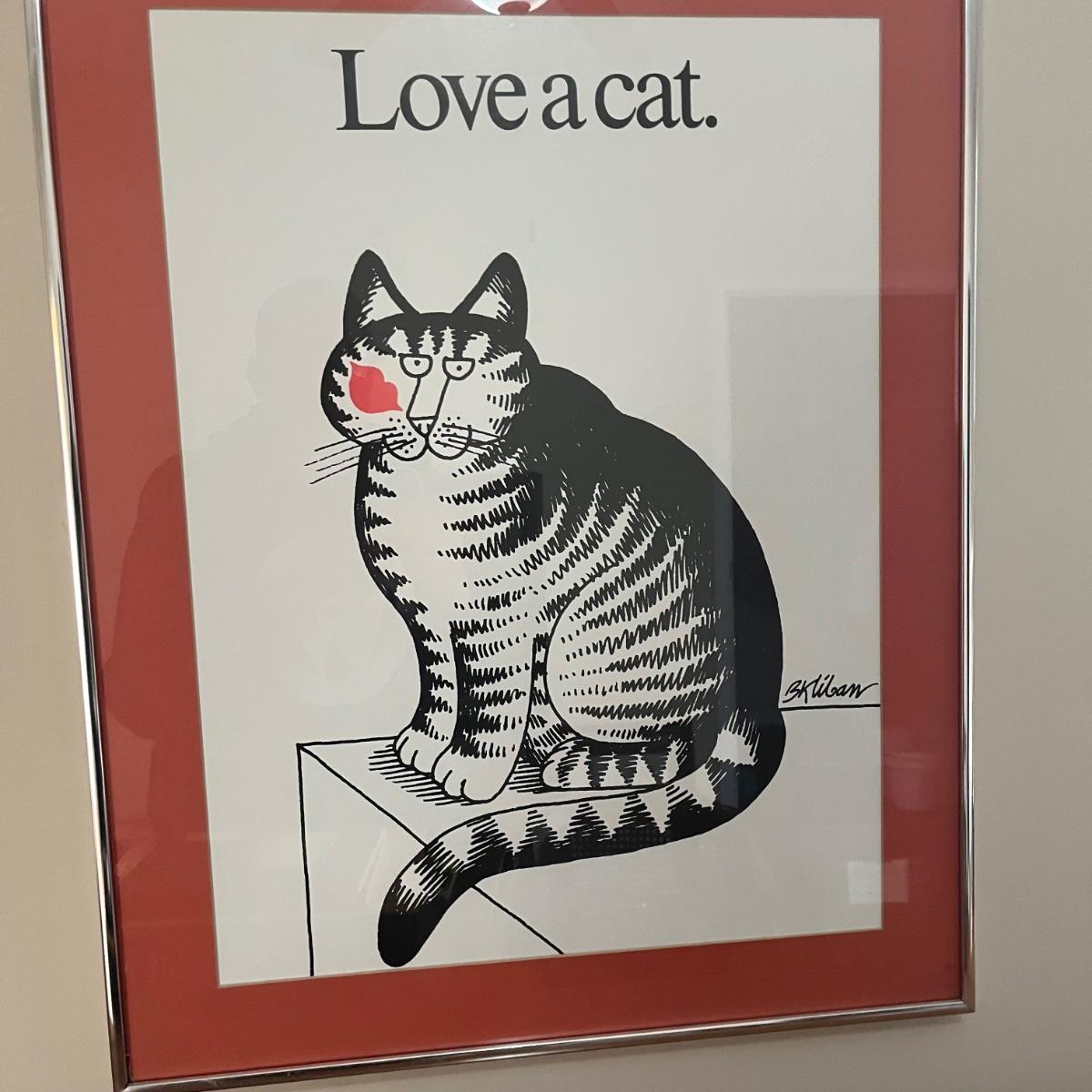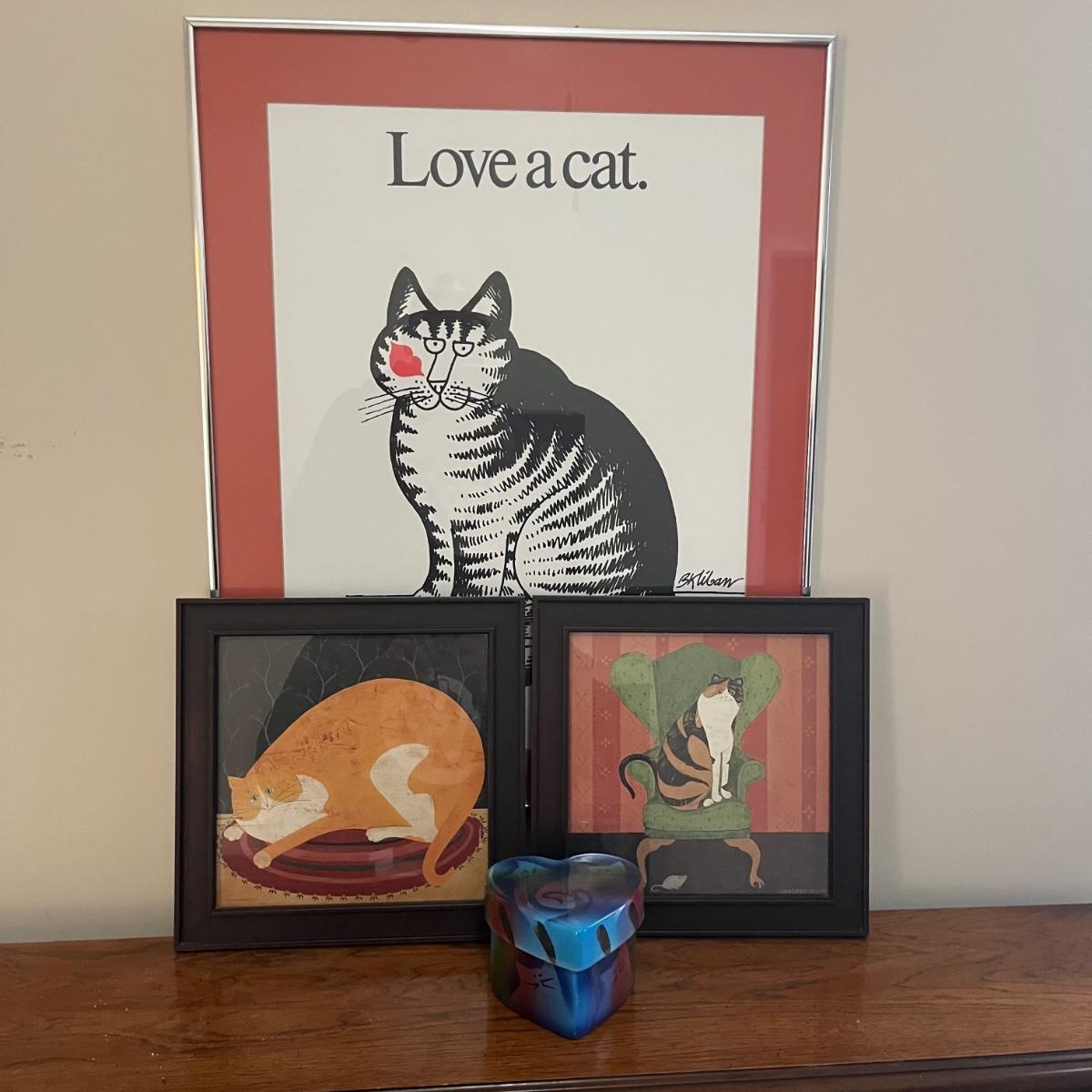 Lot includes a framed and matted Love a Cat artwork by B. Kilban that measures 22.5” x 28.5”. Also includes ceramic signed box by Judith Stiles, two framed cat prints and seven small cat magnets.