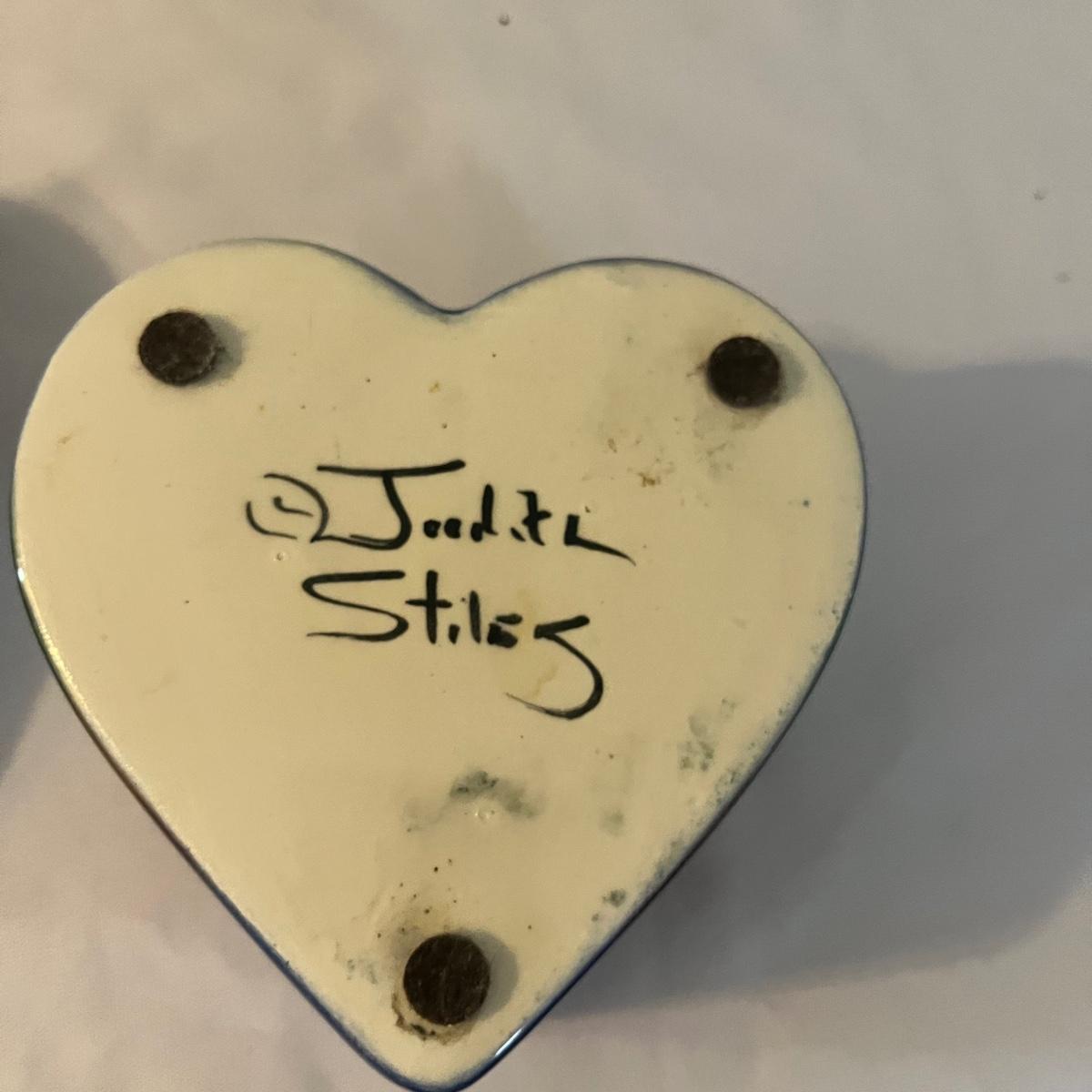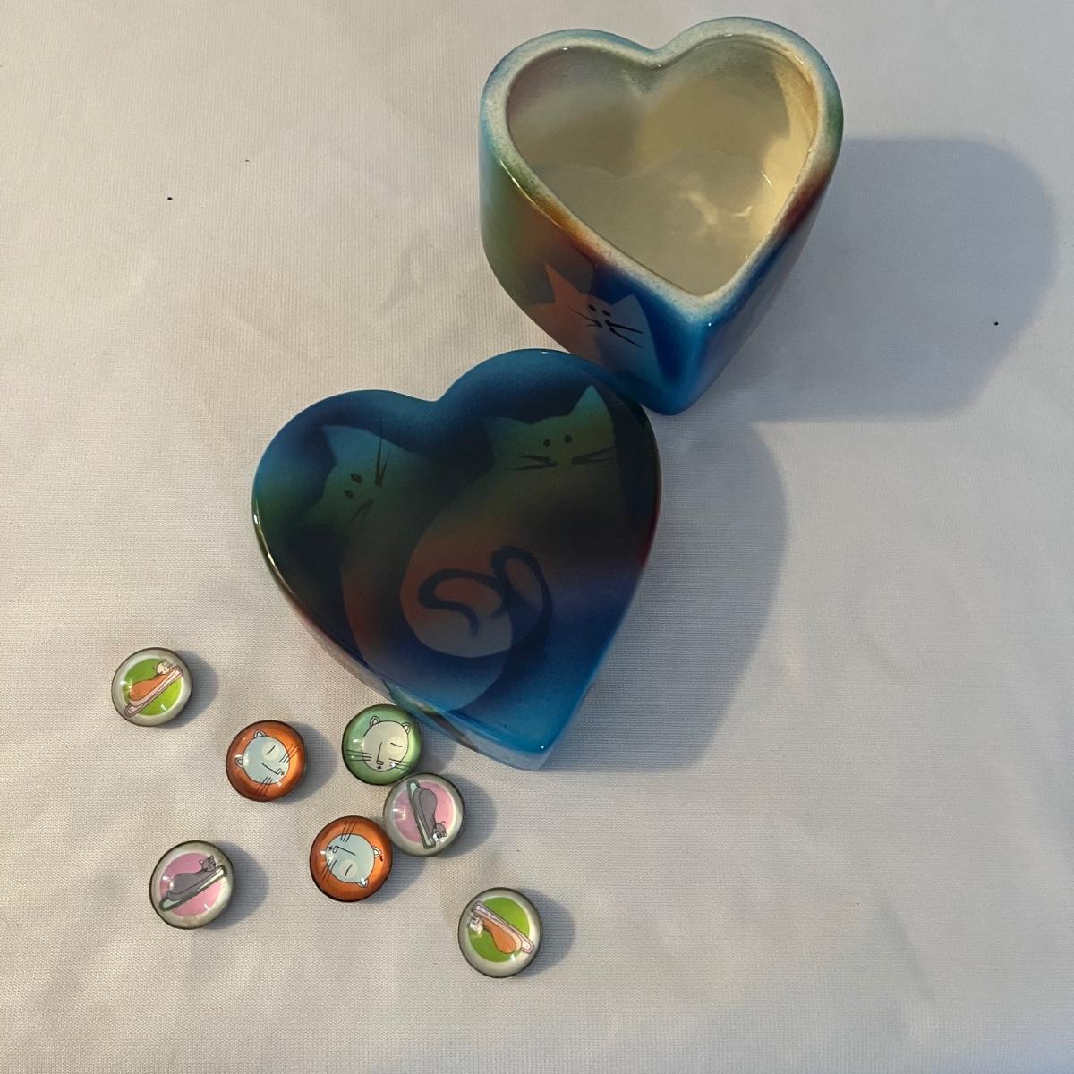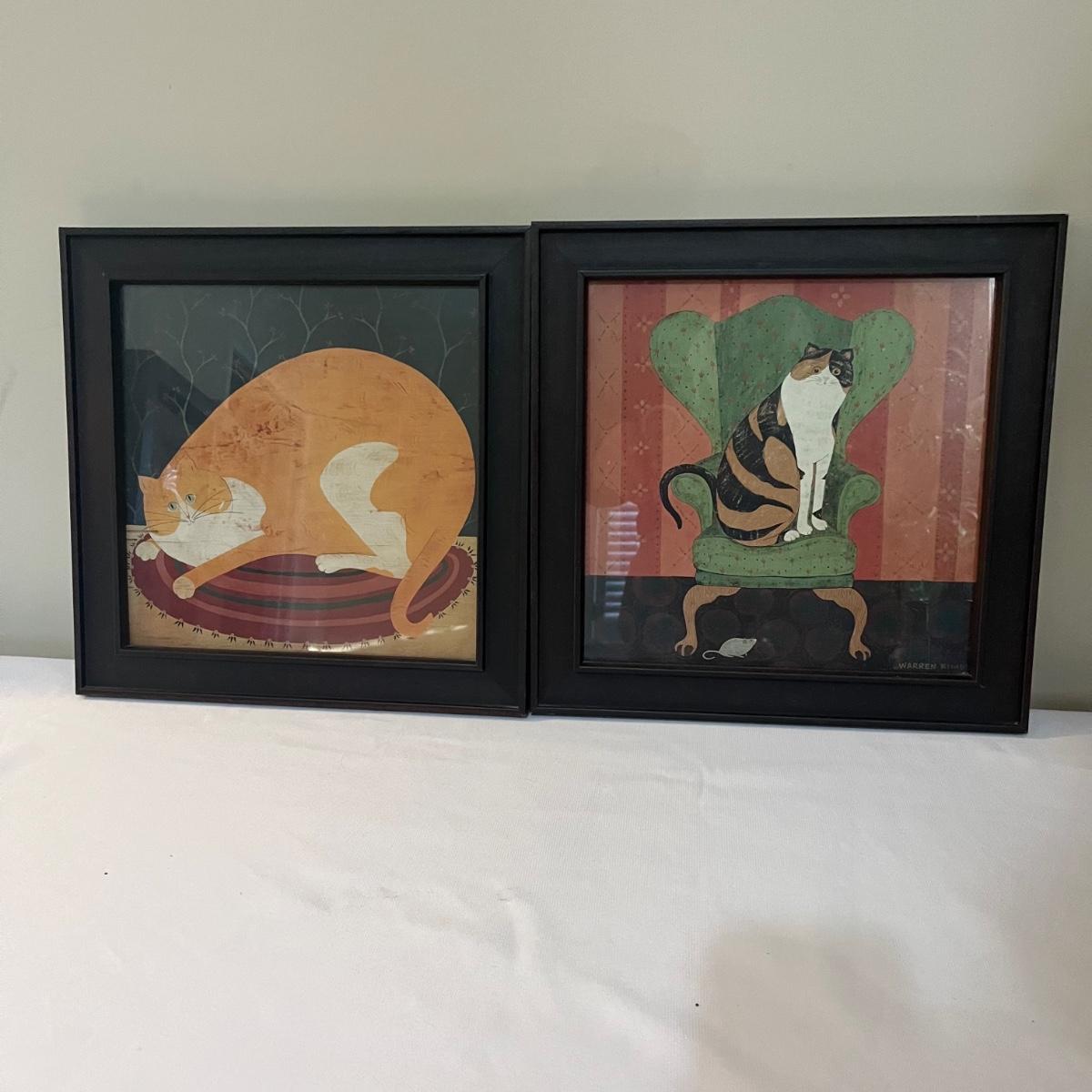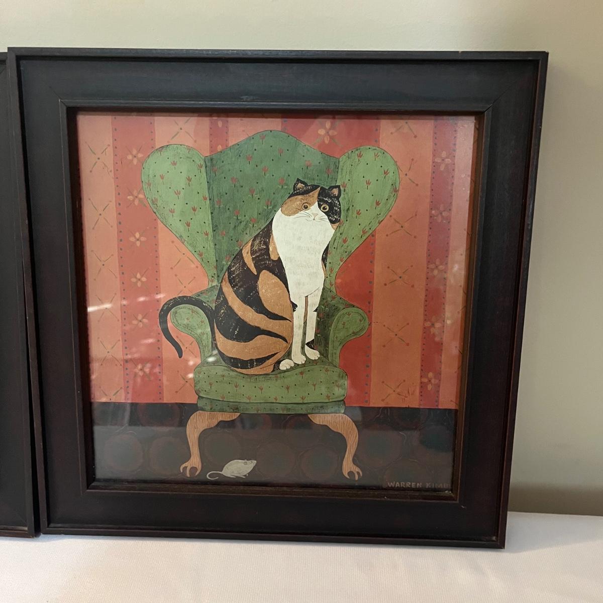 Lot includes a framed and matted Love a Cat artwork by B. Kilban that measures 22.5” x 28.5”. Also includes ceramic signed box by Judith Stiles, two framed cat prints and seven small cat magnets.