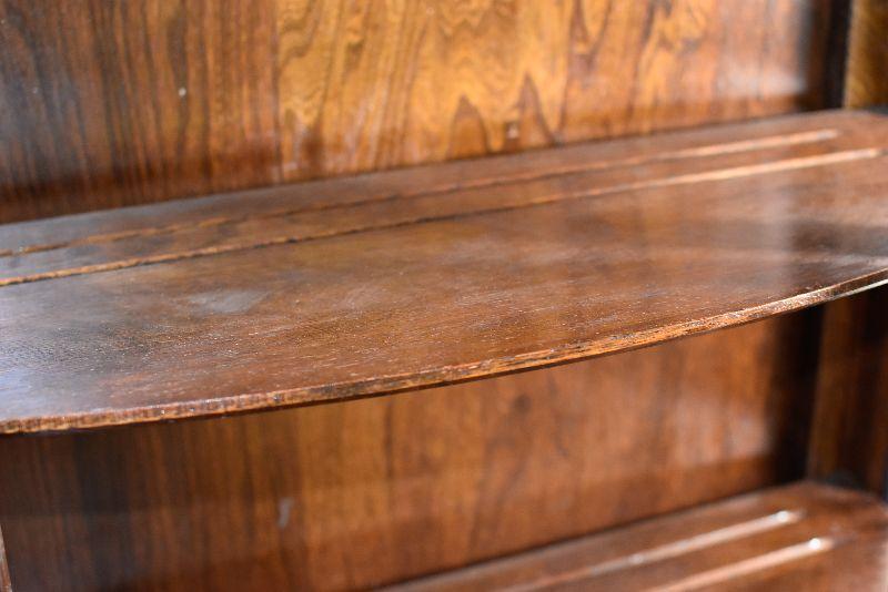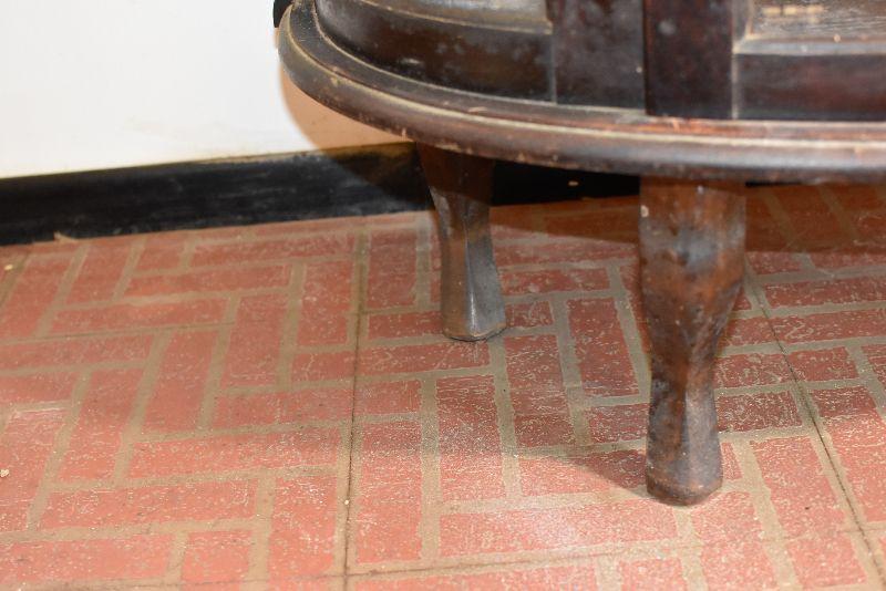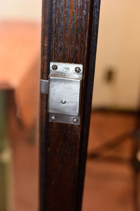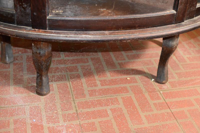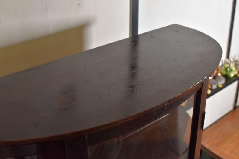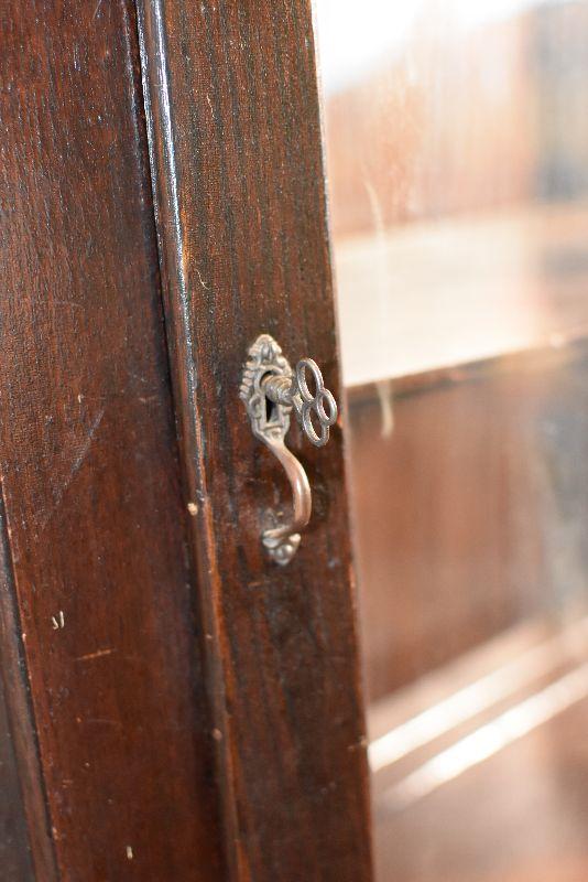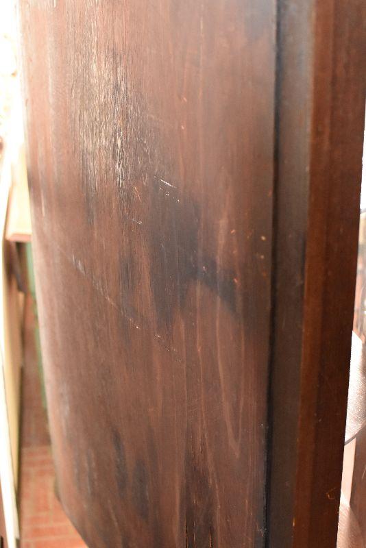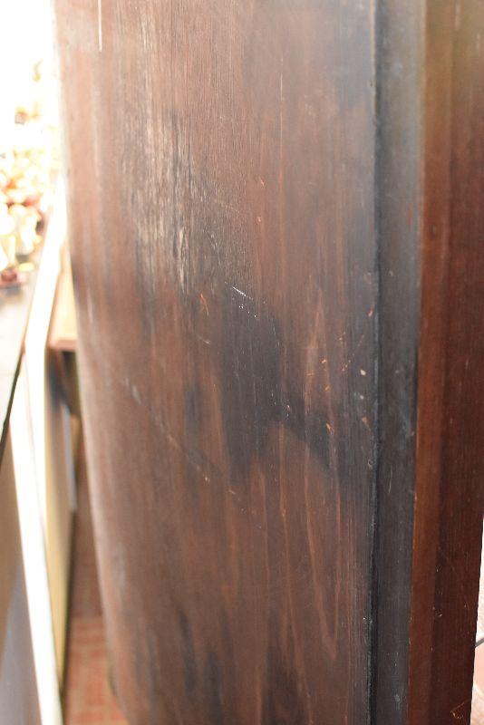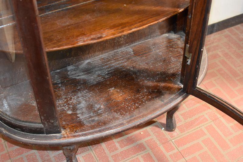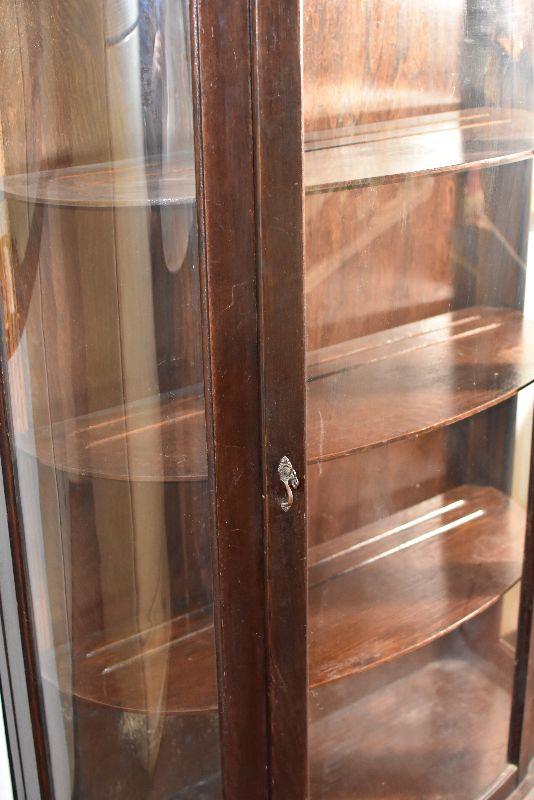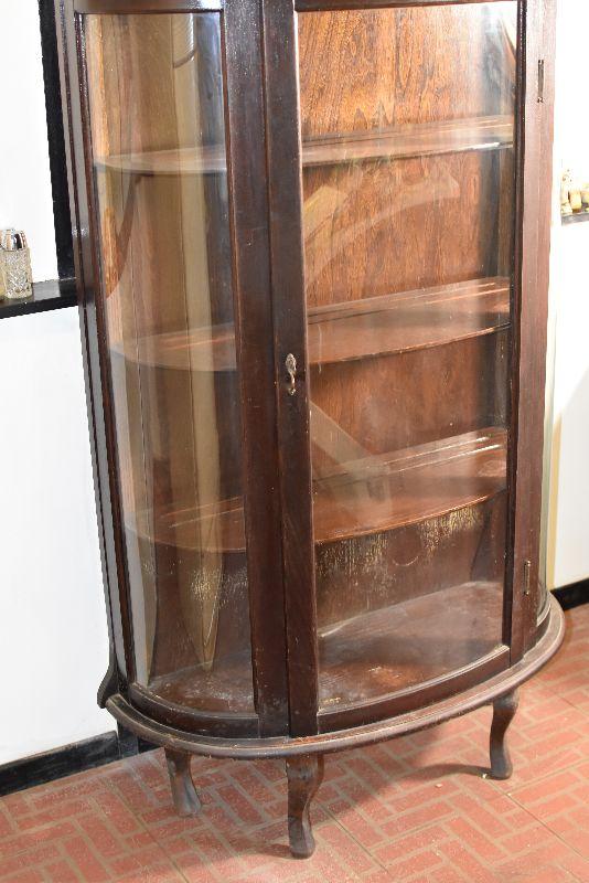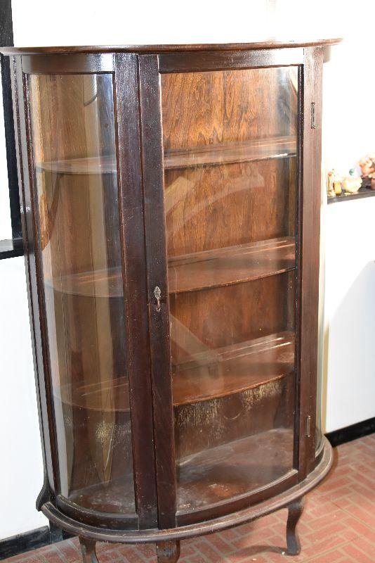 Antique, glass front cabinet. Glass is in good condition, there are scratches and wear on wood. Heavy, bring help to move.