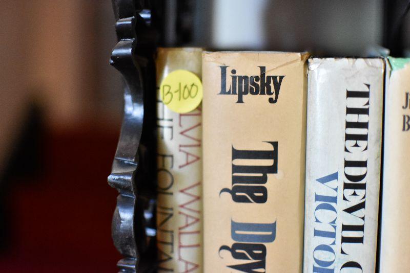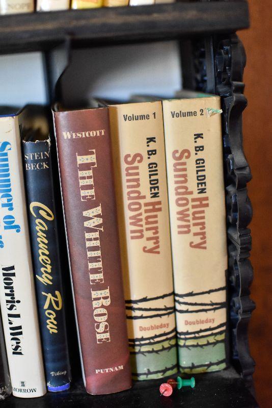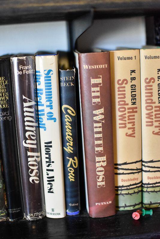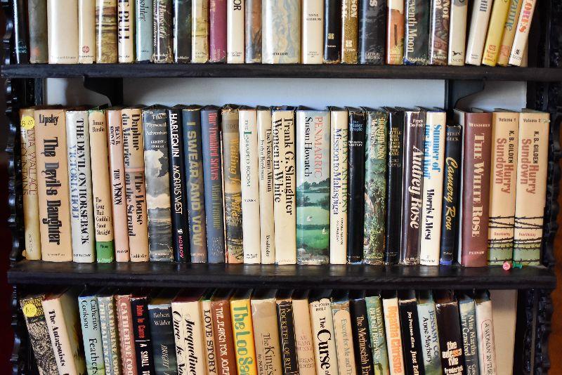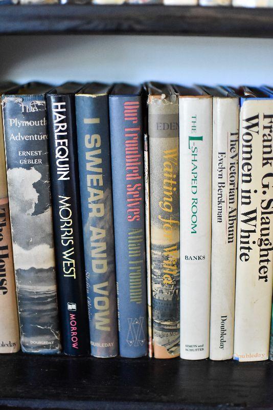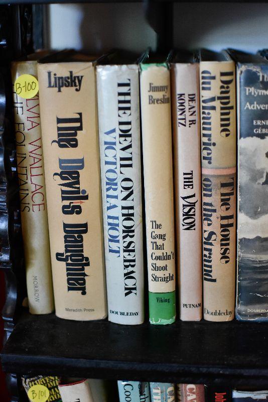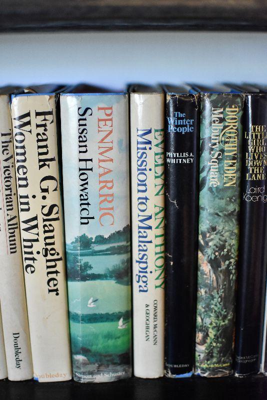 Vintage books by Daphine du Maurier, Victory Holt, and more. One row of books on book shelf. Bring box to move.