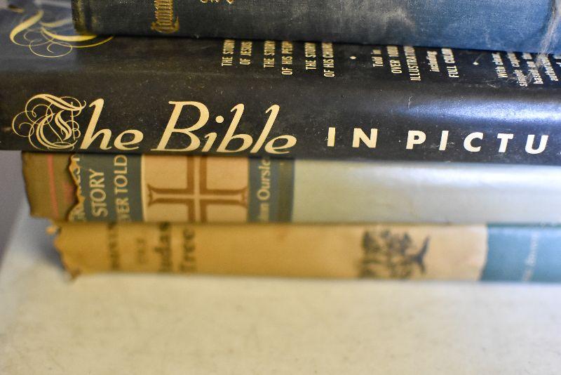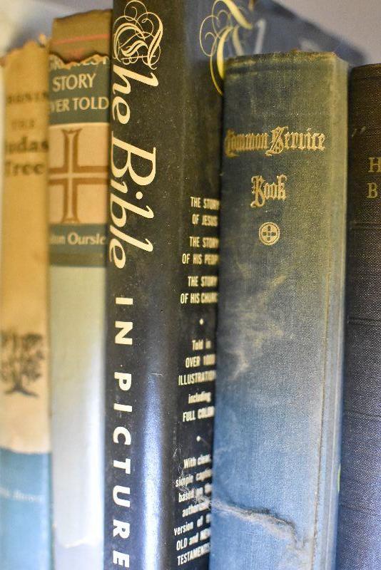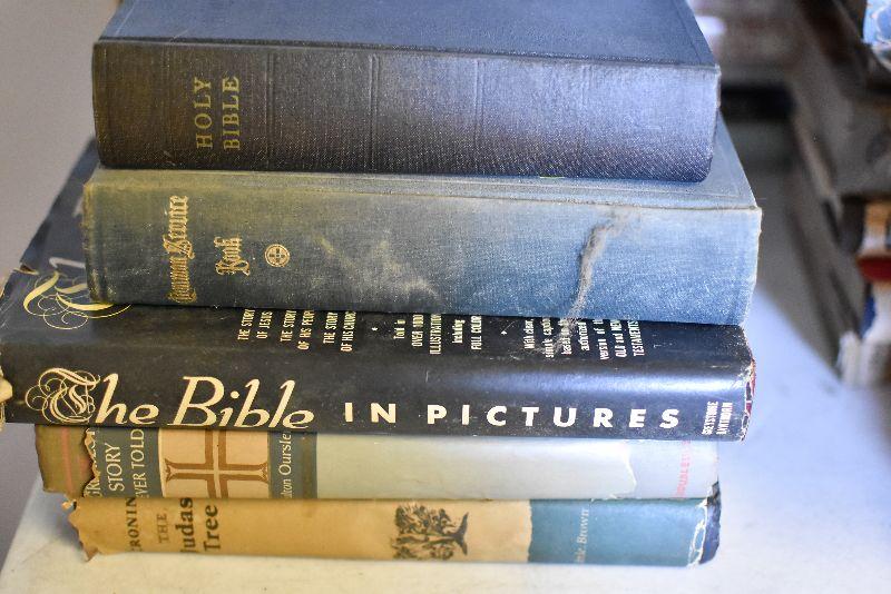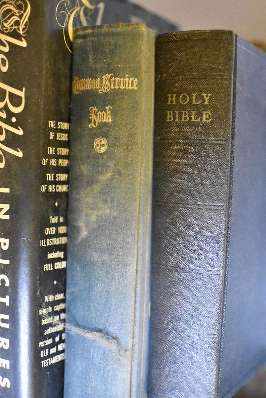 The Holy Bible and other books on religion.