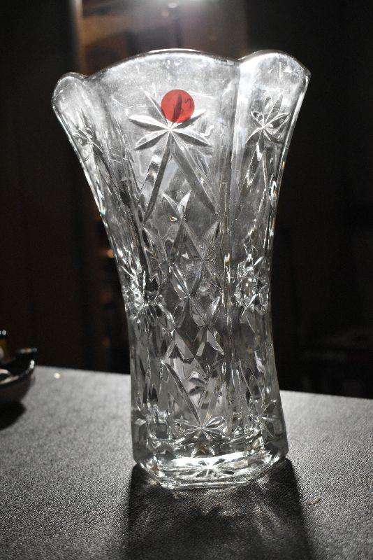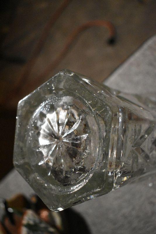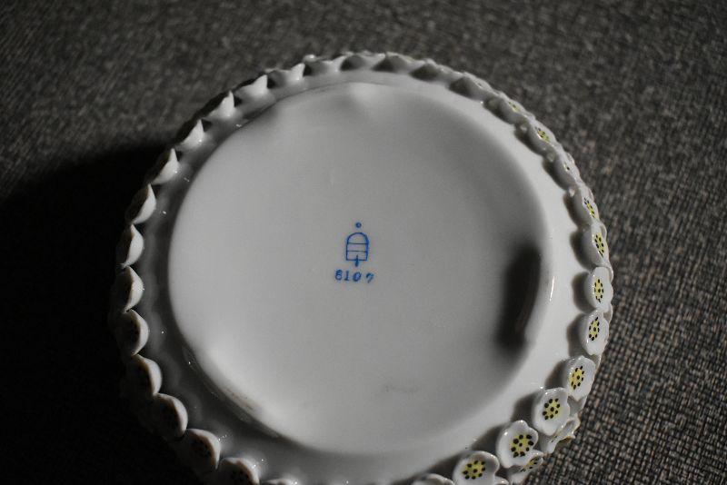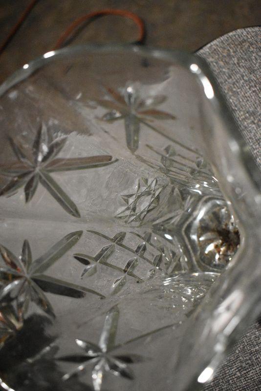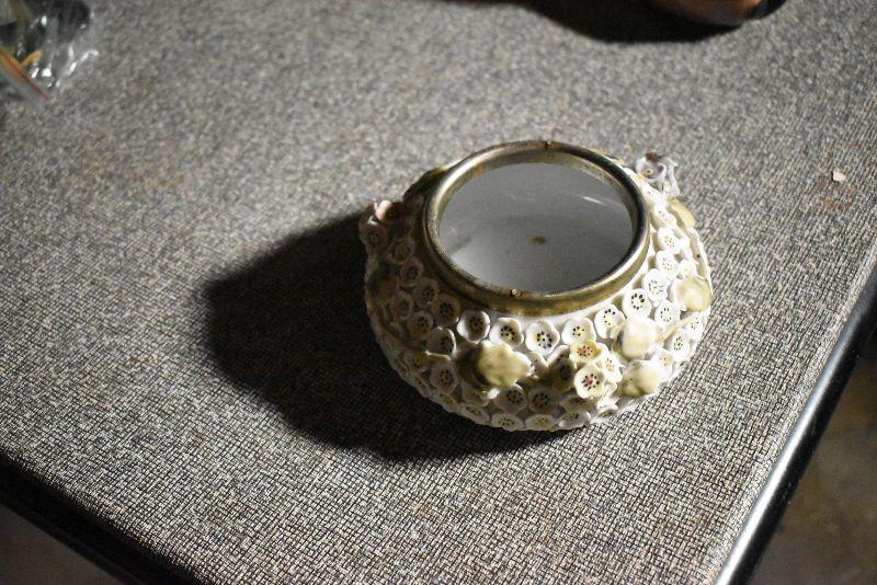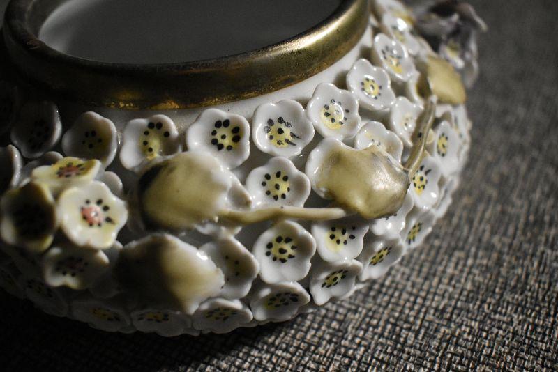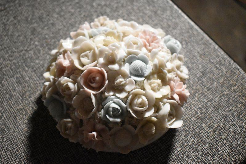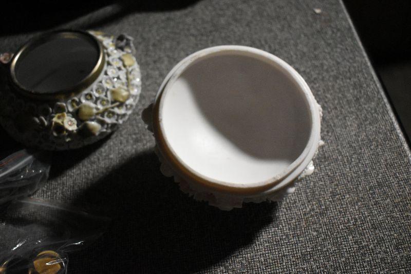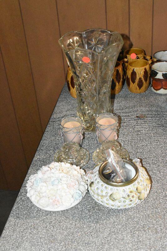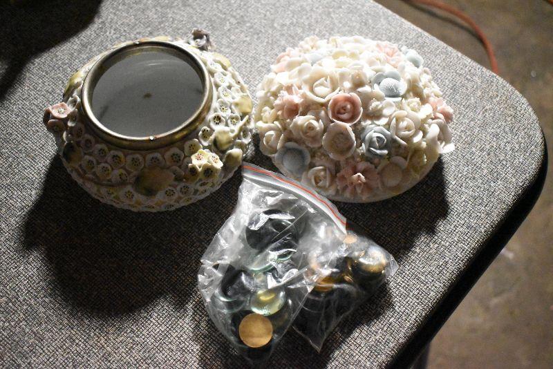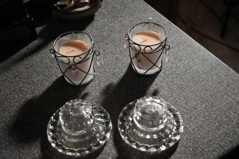 Votive candles and candles, trinket bowl covered with porcelain flowers with a mismatched, flower covered lid. Cut glass vase.