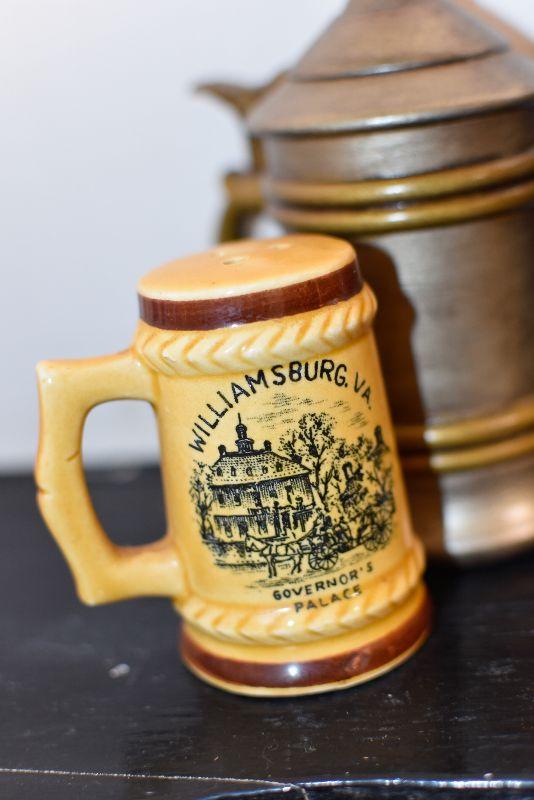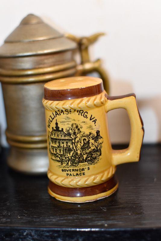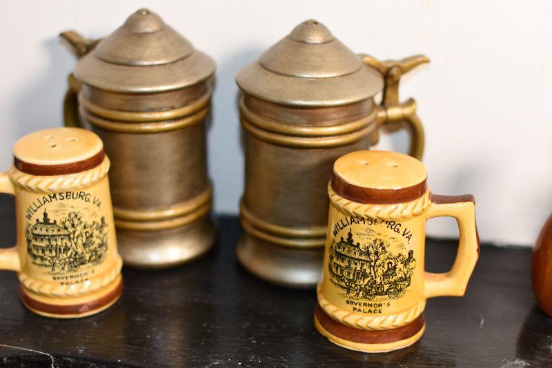 Souvenir salt and pepper from Williamsburg, VA, and a handcrafted, little steins salt and pepper.