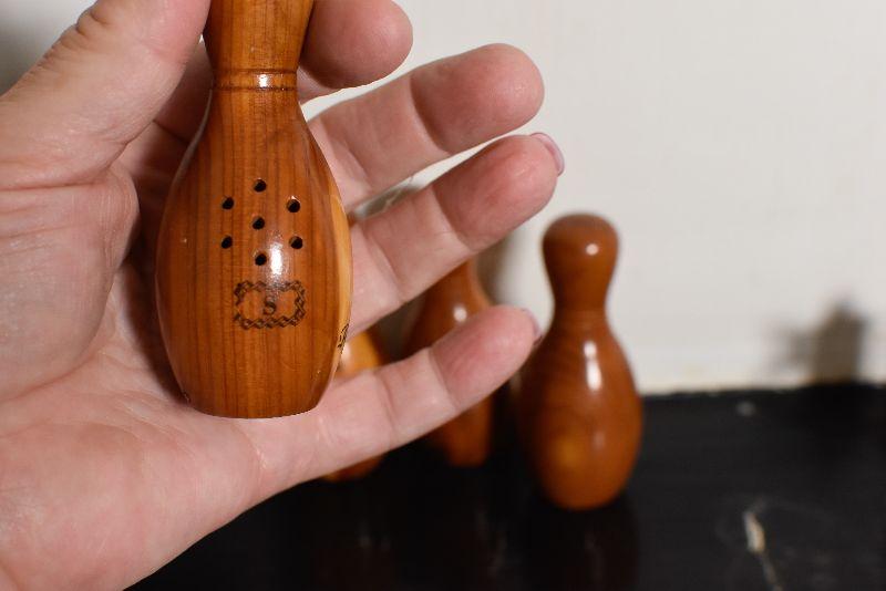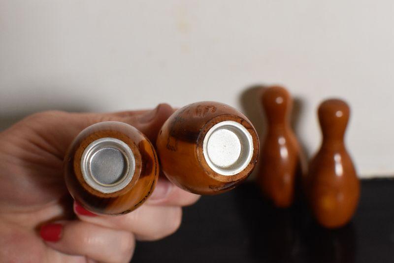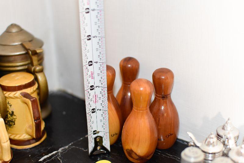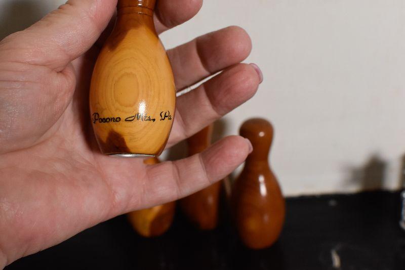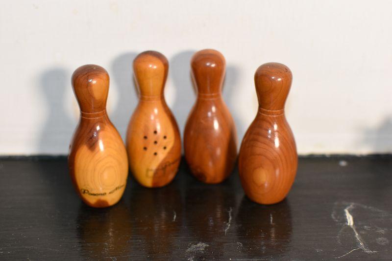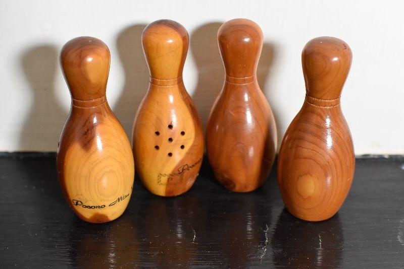 Wooden, souvenir salt and pepper shakers from the Pocono Mountains in Pennsylvania. Bowling fans, add to your collection.