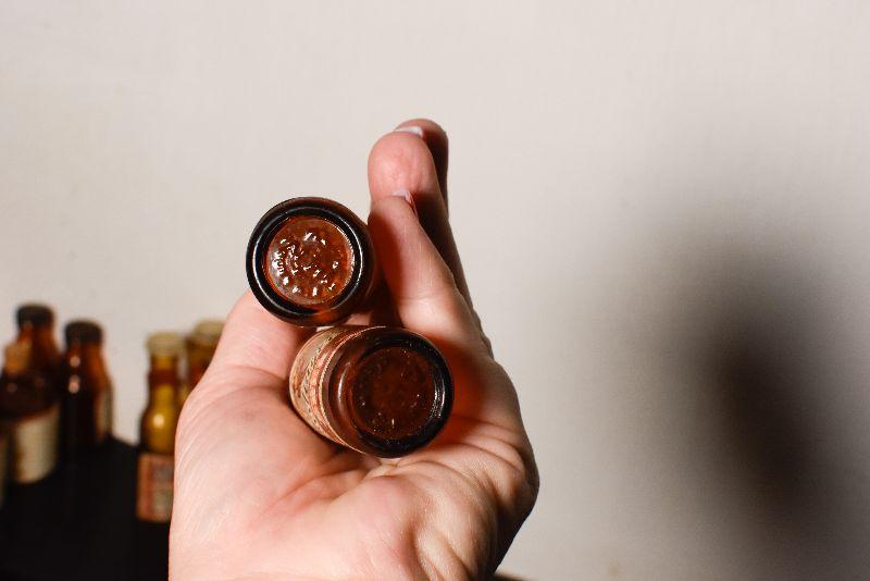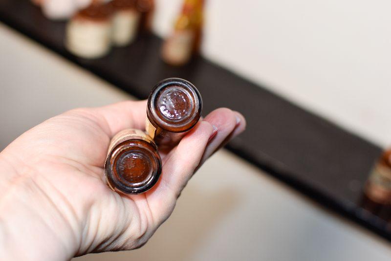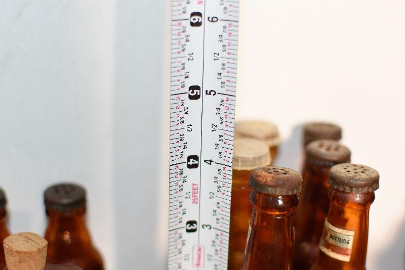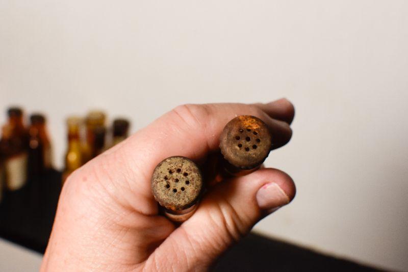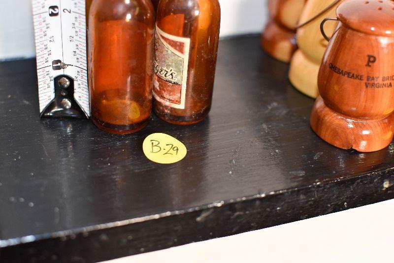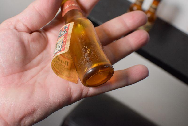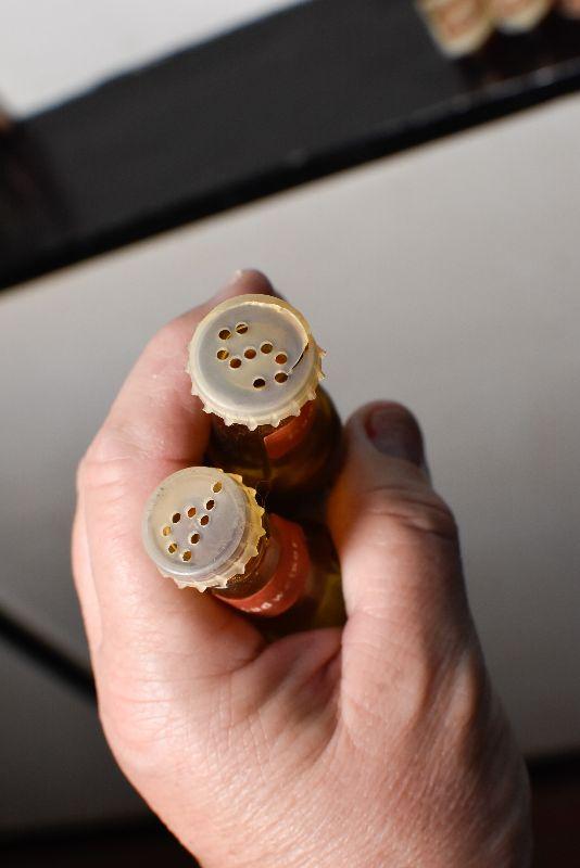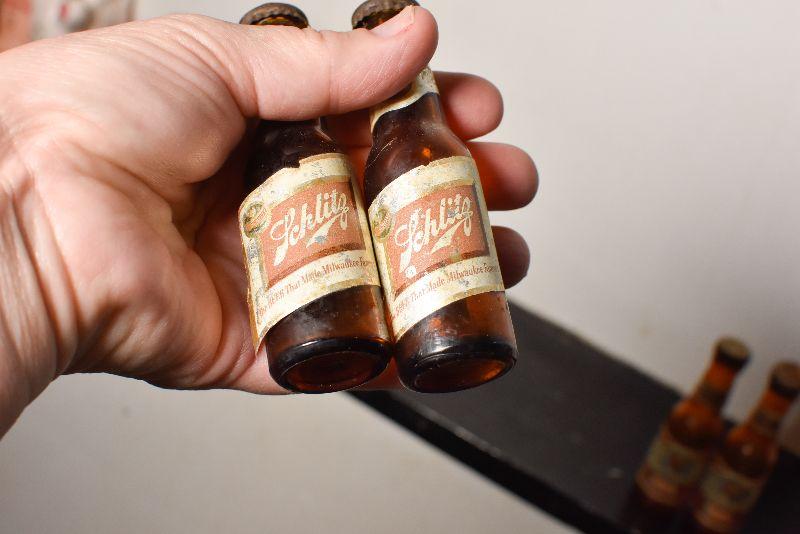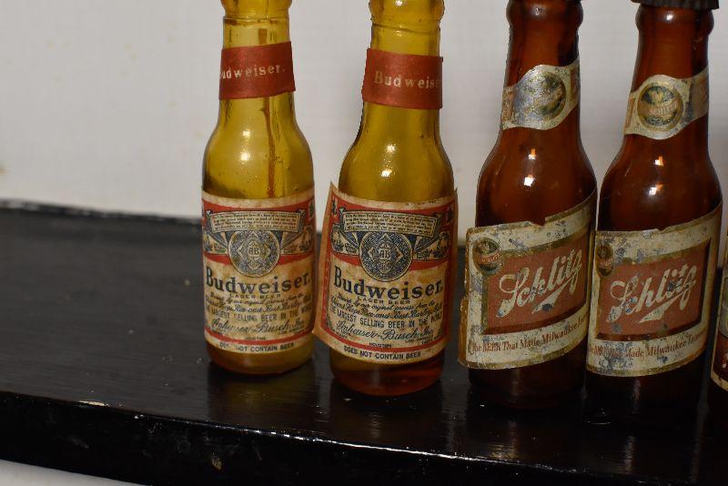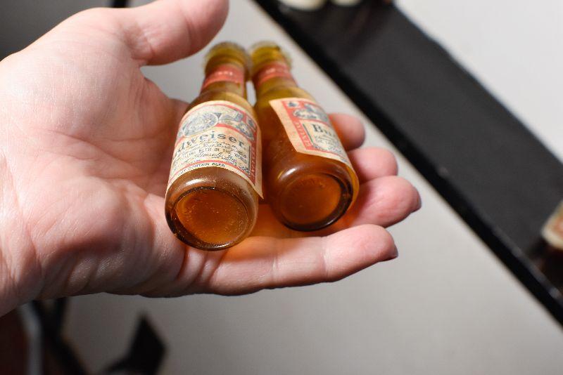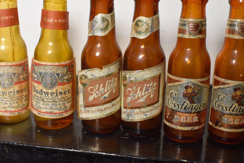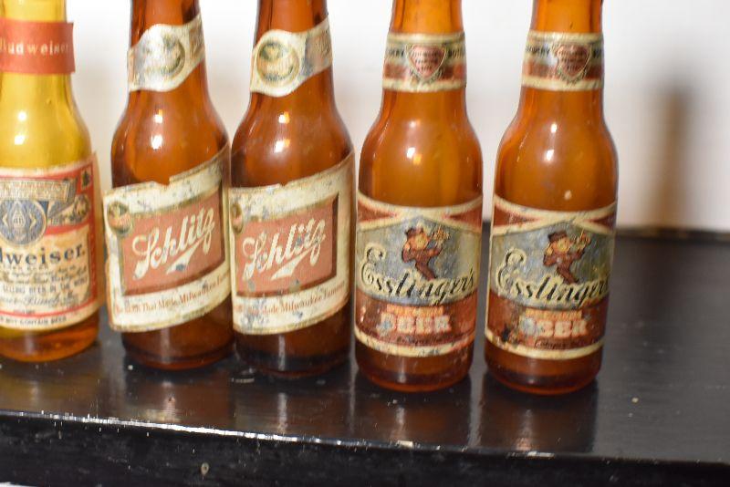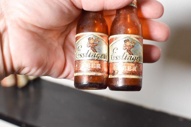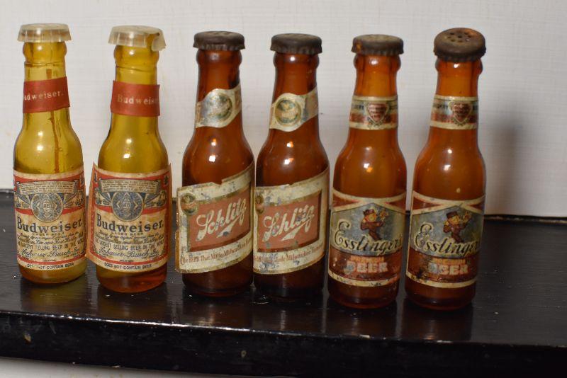 Beer advertising salt and pepper shakers. Label is loose on one bottle and caps are rusted on the Esslinger beer salt and pepper.