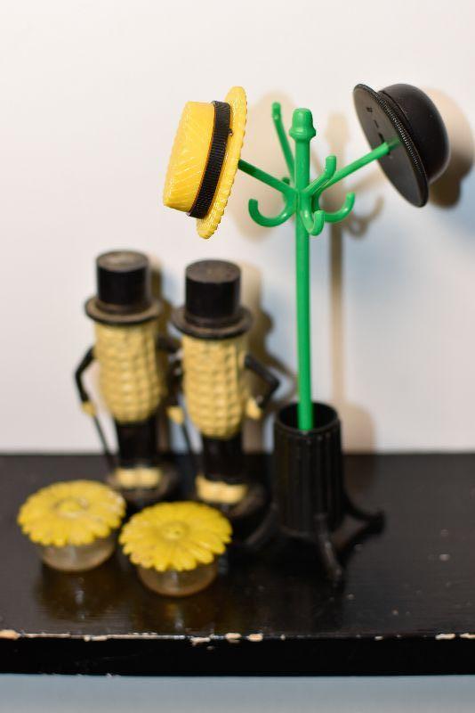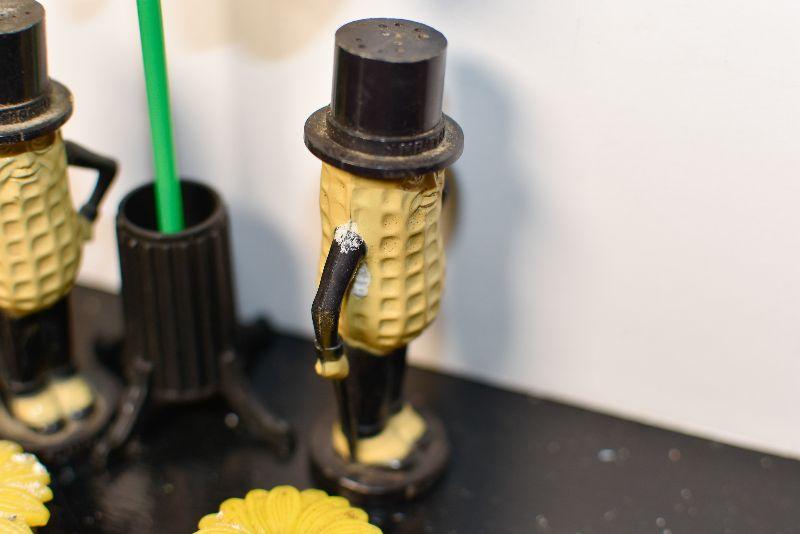 Mr. Peanut salt and pepper shakers. Comes with changeable top and small flower shakes.