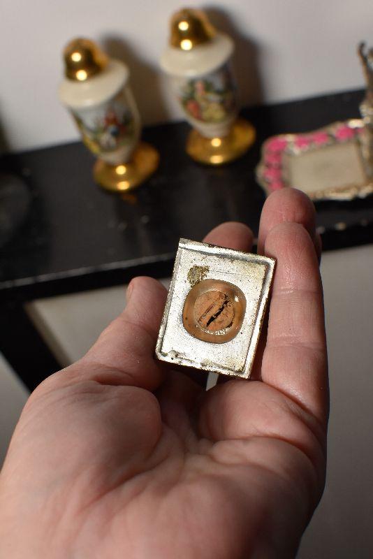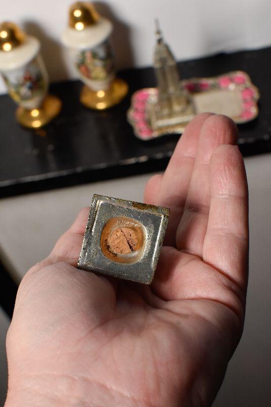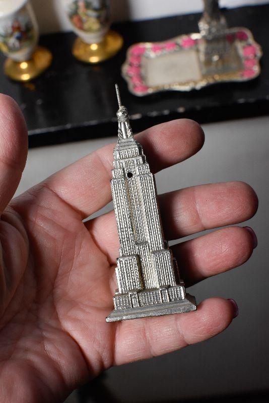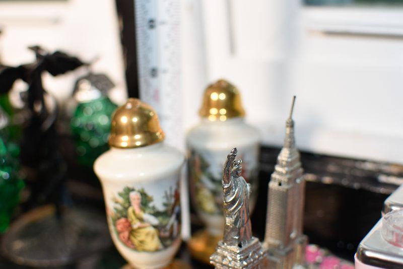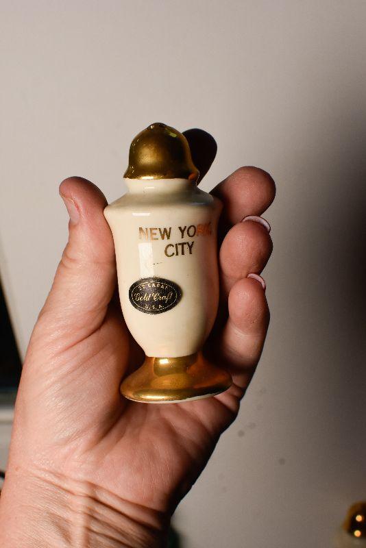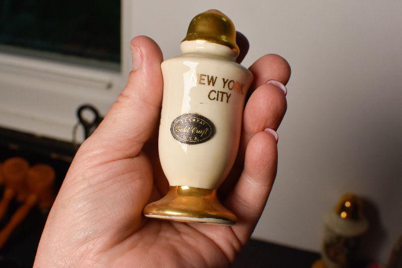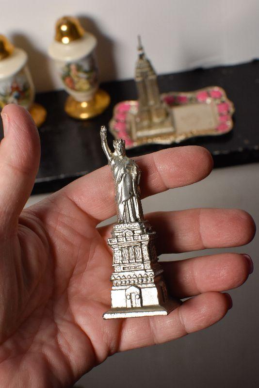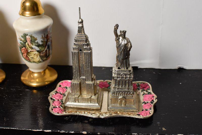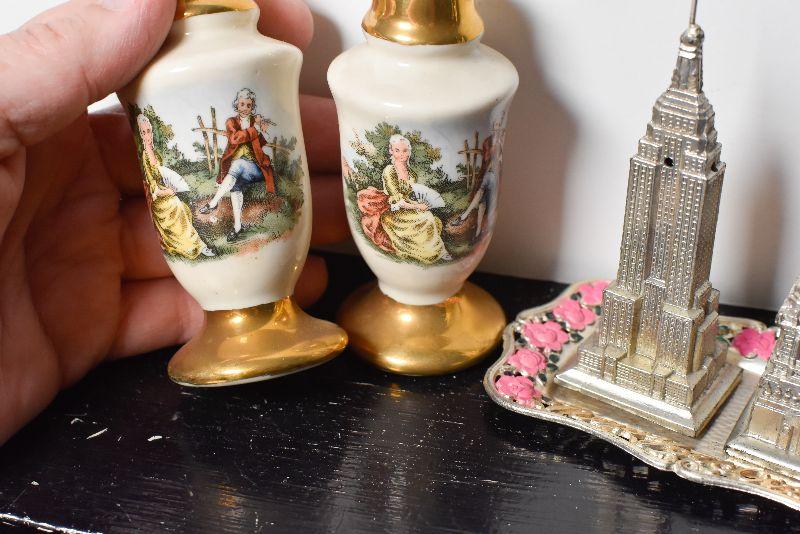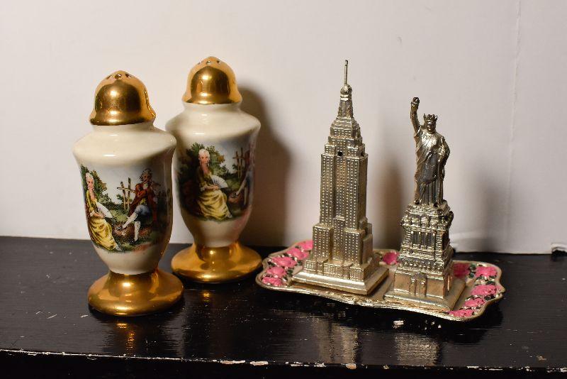 Statue of Liberty and the Empire State Building, also, ceramic shakers with colonial style people, and gold top and bottom.