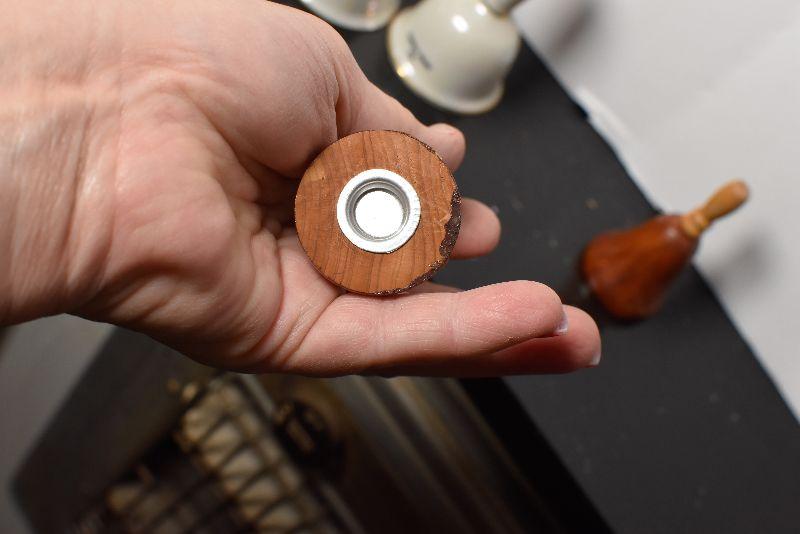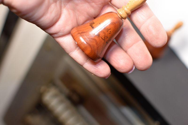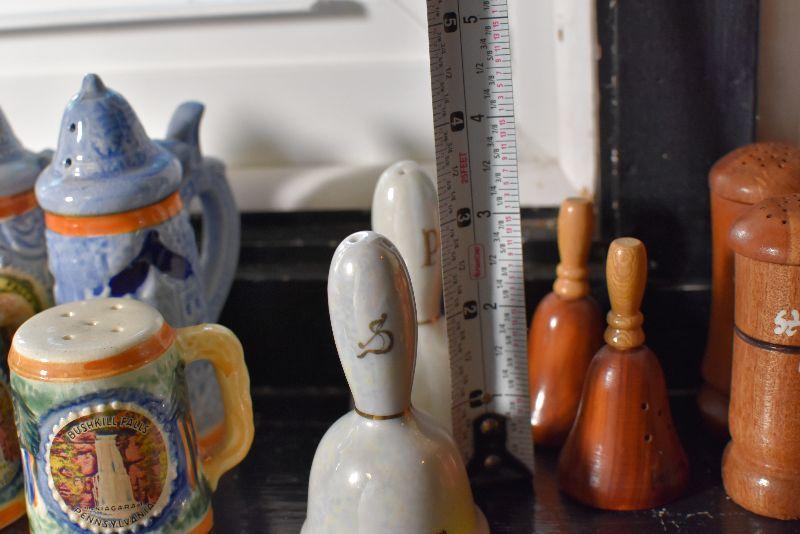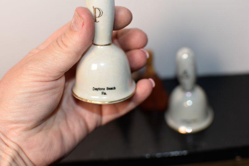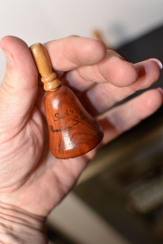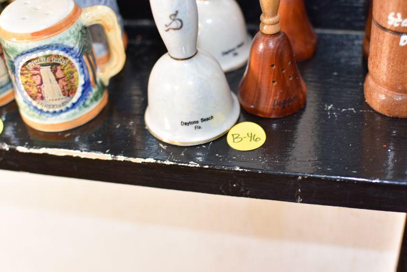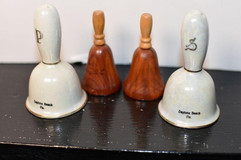 Wooden bell shaped salt and pepper shakers from South Carolina, and bells with clappers from Daytona Beach FL.