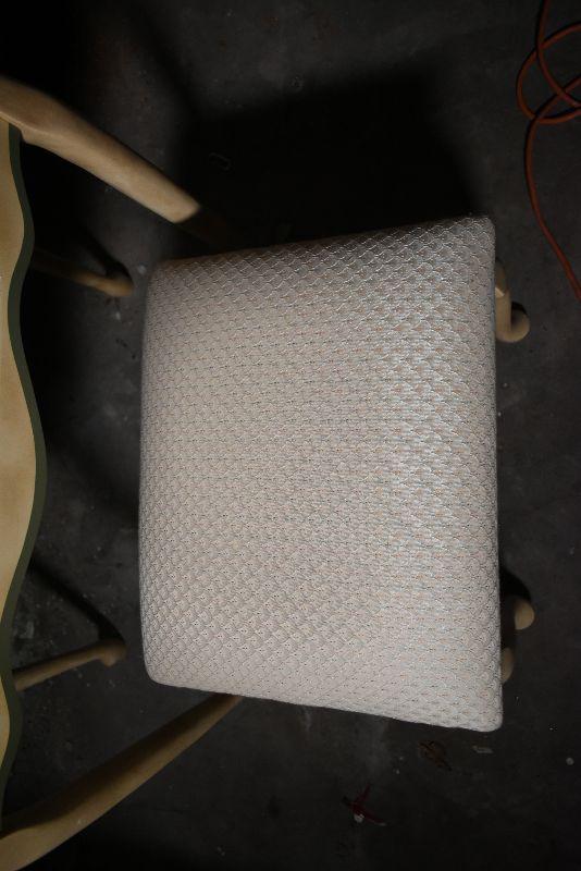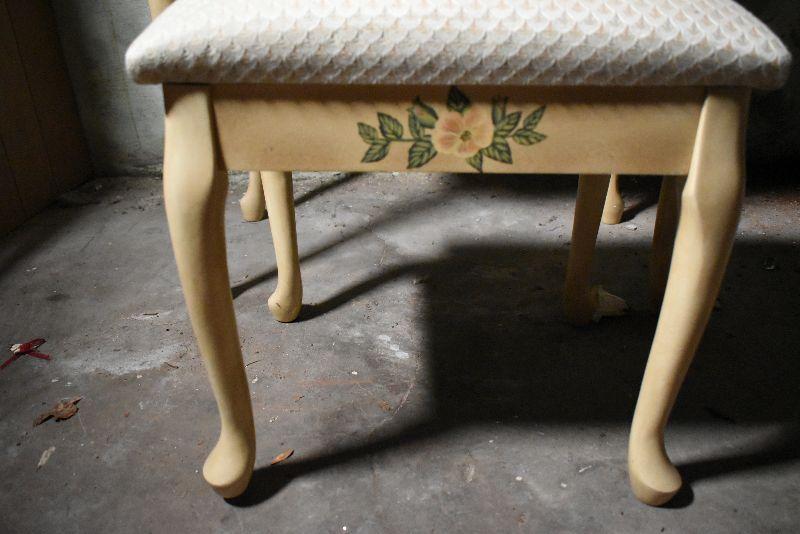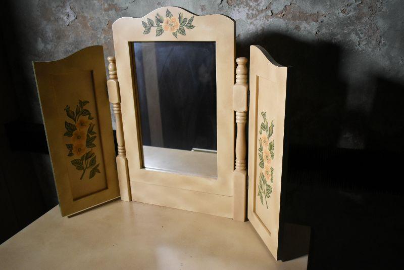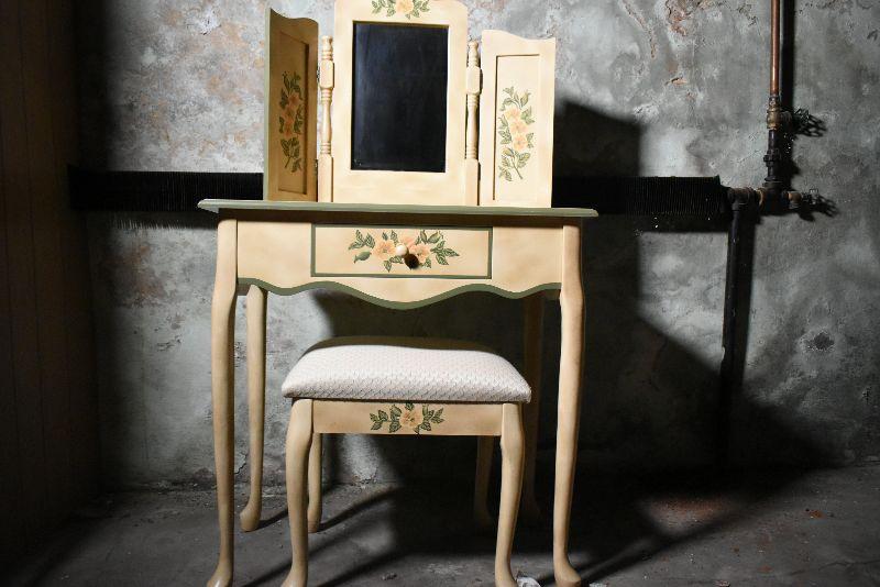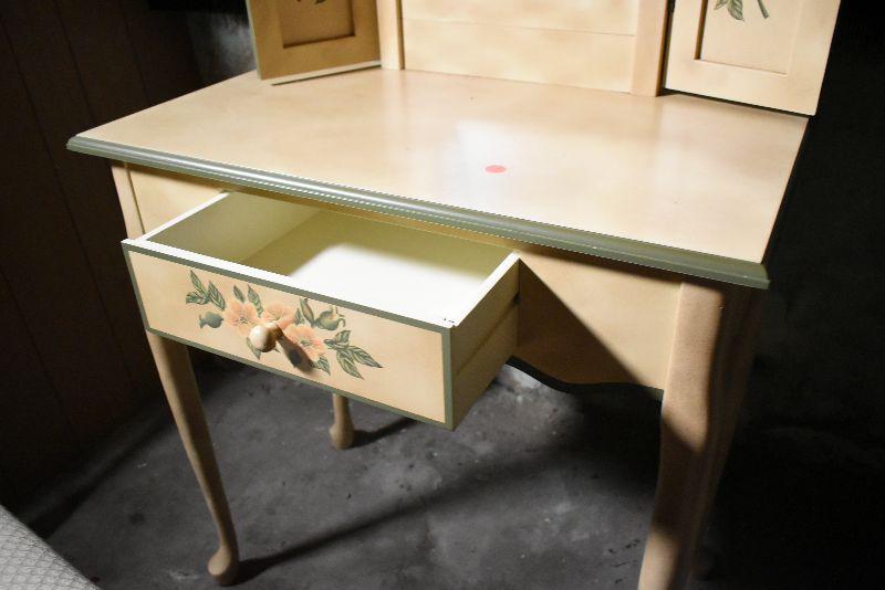 Vanity with flowers, attached mirror, and a matching stool. 28x16x29 not including mirror. Bring help to move from basement.